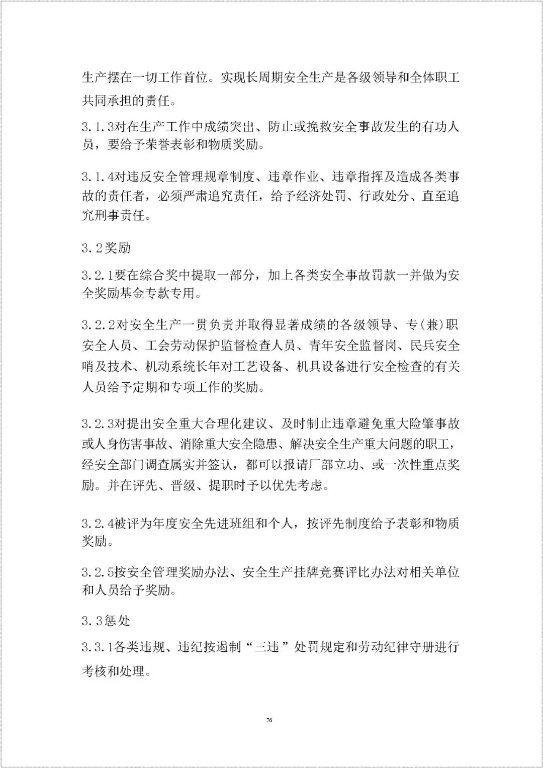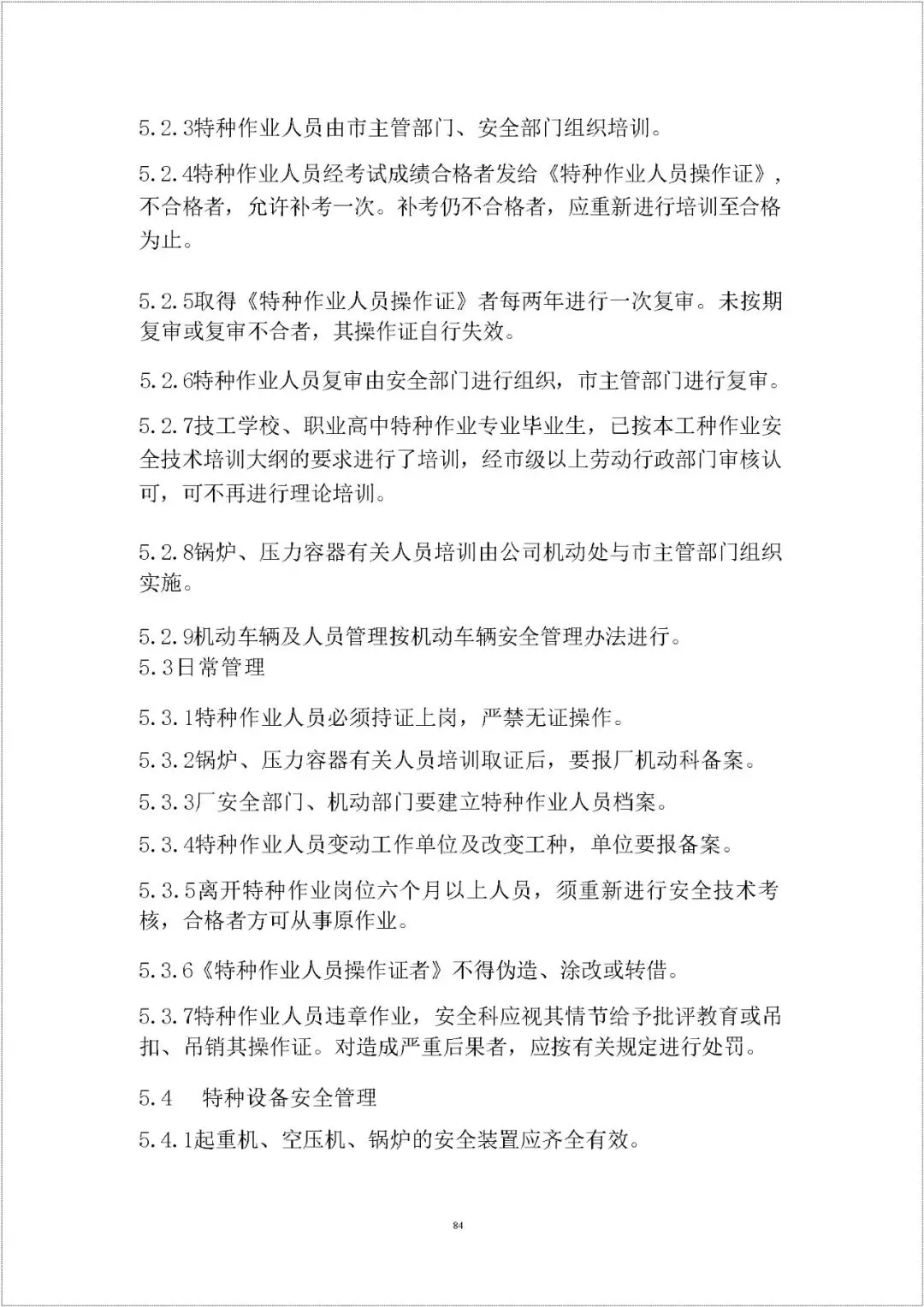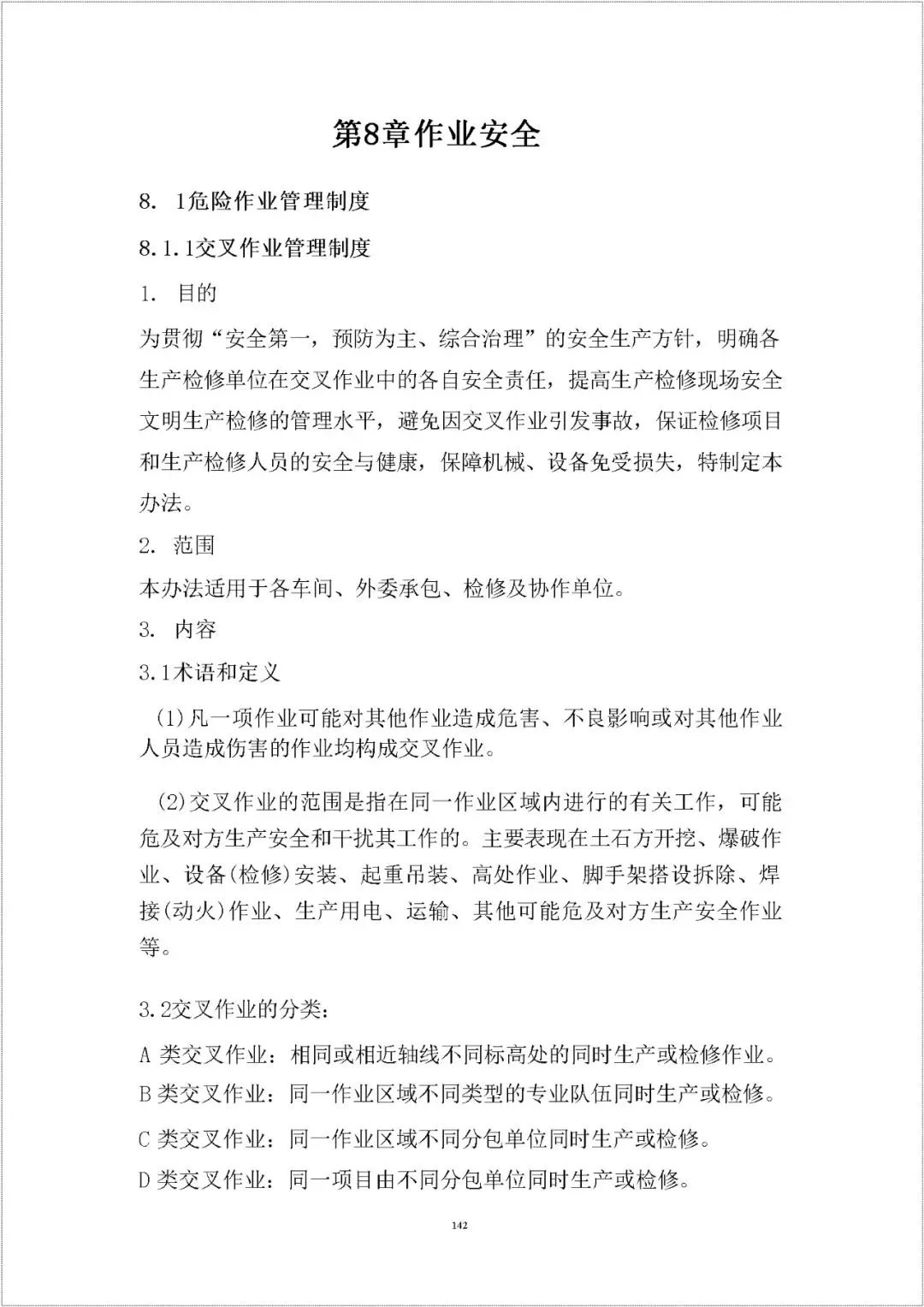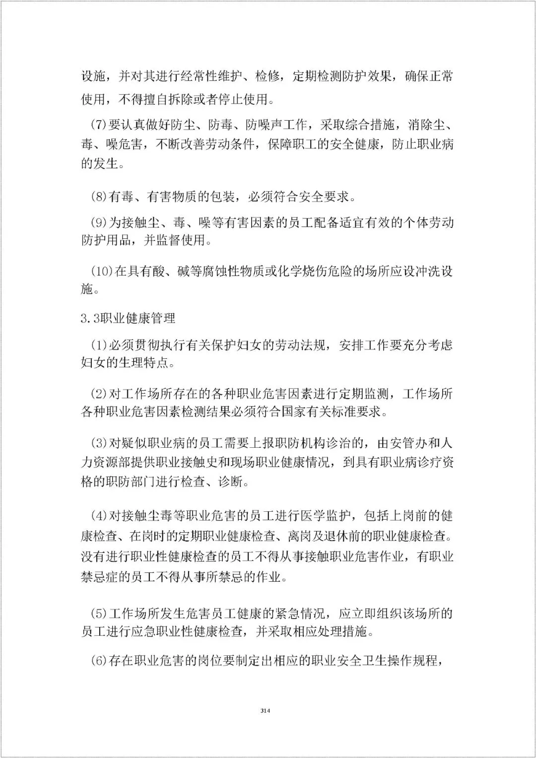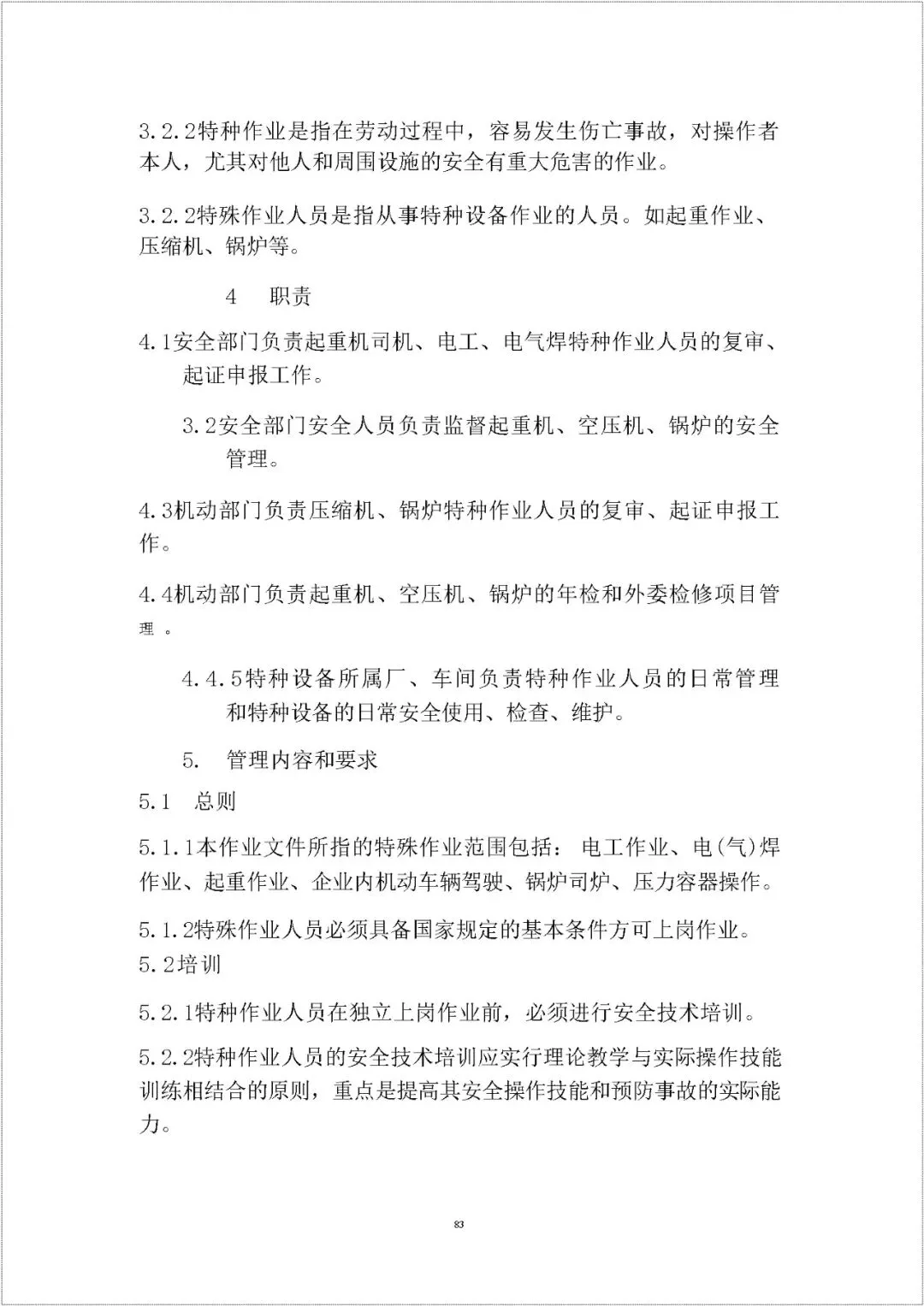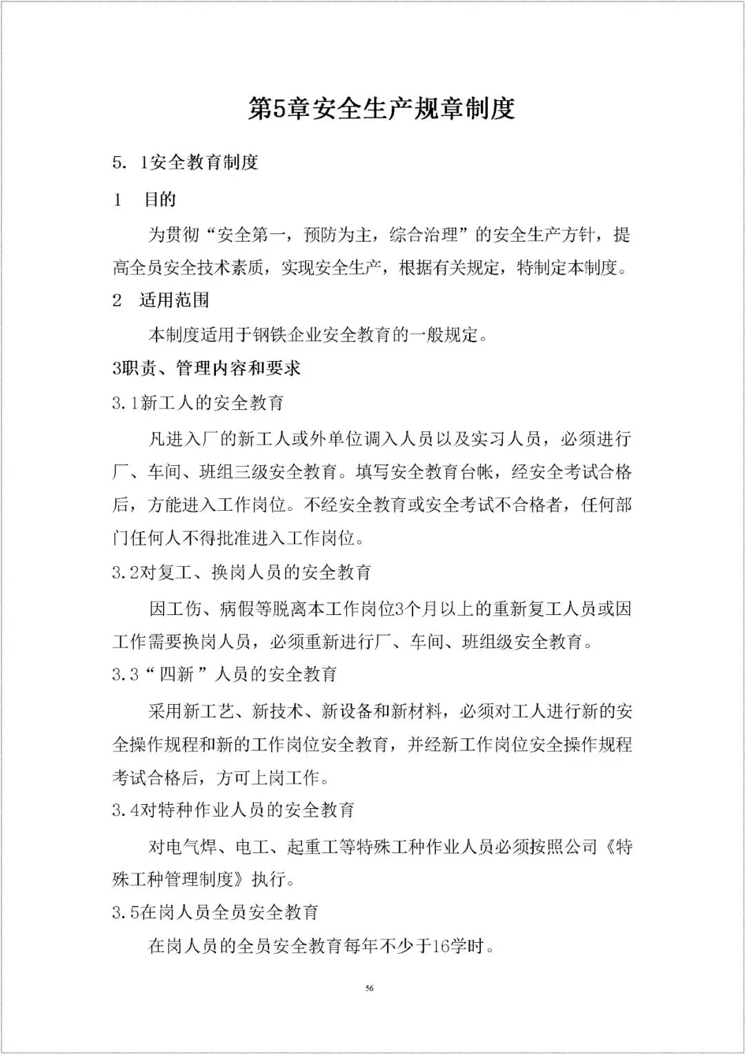 5.2 危险源点管理制度 575.3 煤气安全管理制度 605.4 安全检查制度 675.5 安全基础设施管理制度 705.6 安全奖惩制度 755.7 安全管理奖发放与考核办法 775.8 安全生产“挂牌”竞赛及安全先进评比办法 785.9 消防安全管理制度 795.10 特种作业人员管理制度 825.11 安全投入保障制度 895.12 劳动防护用品(具)和保健品发放管理制度 905.13 事故管理制度 905.14 职业卫生管理制度 925.15 安全生产会议管理制度 93第 6 章 教育培训 956.1 安全教育培训管理制度 956.2 年度安全教育培训计划 996.2.1 附表1:三级教育 1036.2.2 附表2:培训记录 1066.2.3 附表3:人员持证台账 108第 7 章 生产设备设施 1097.1 建设项目安全“三同时”管理制度 1097.2 设备设施安全管理制度 1127.3 生产设备、设施验收管理制度 1177.4 生产设施设备检修、维修和保养的安全管理制度 1197.5 生产设施安全拆除和报废管理制度 1217.6 电气设施安全管理制度 1247.7 特种设备安全管理制度汇编 1307.7.1 附表1:特种设备统计台账 1377.8 特种(设备)作业人员管理制度 138第 8 章 作业安全 1428.1 危险作业管理制度 1428.1.1 交叉作业管理制度 1428.1.2 受限空间作业安全管理制度 1518.1.3 动火作业安全管理制度 1588.1.4 大型吊装作业安全管理制度 1658.1.5 高处作业管理制度 1738.1.6 临时用电安全管理制度 1788.1.7 有毒、有害作业安全管理制度 1838.1.8 能源介质安全作业管理制度 1868.2 警示标志和安全防护管理制度 1918.3 变更管理制度 1938.3.1 附表1:变更申请表 1968.3.2 附表2:变更验收表 198