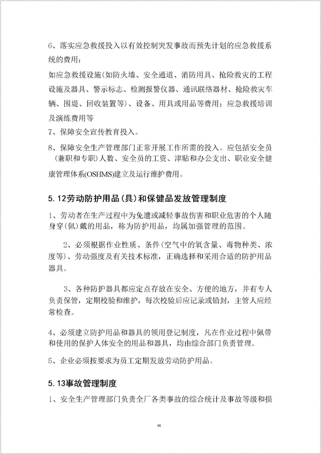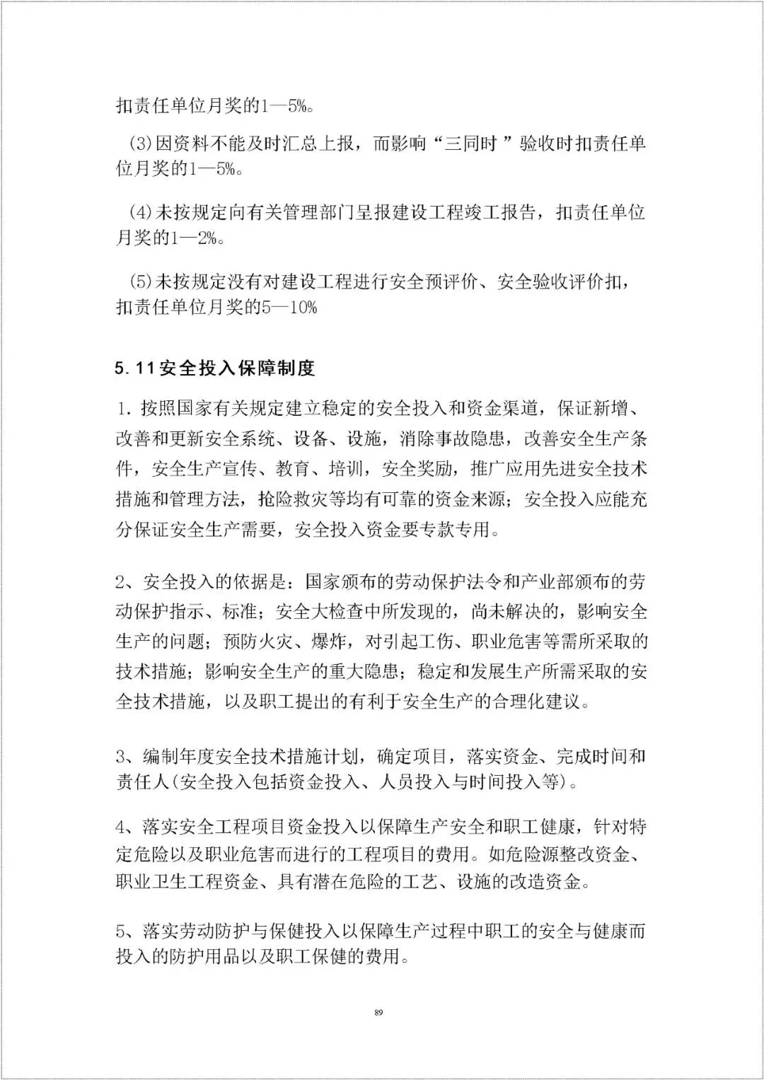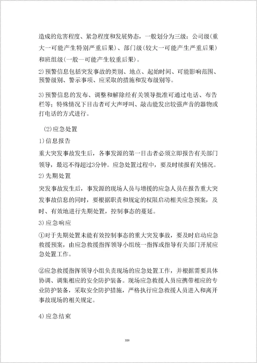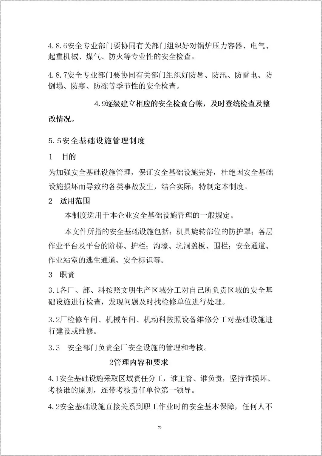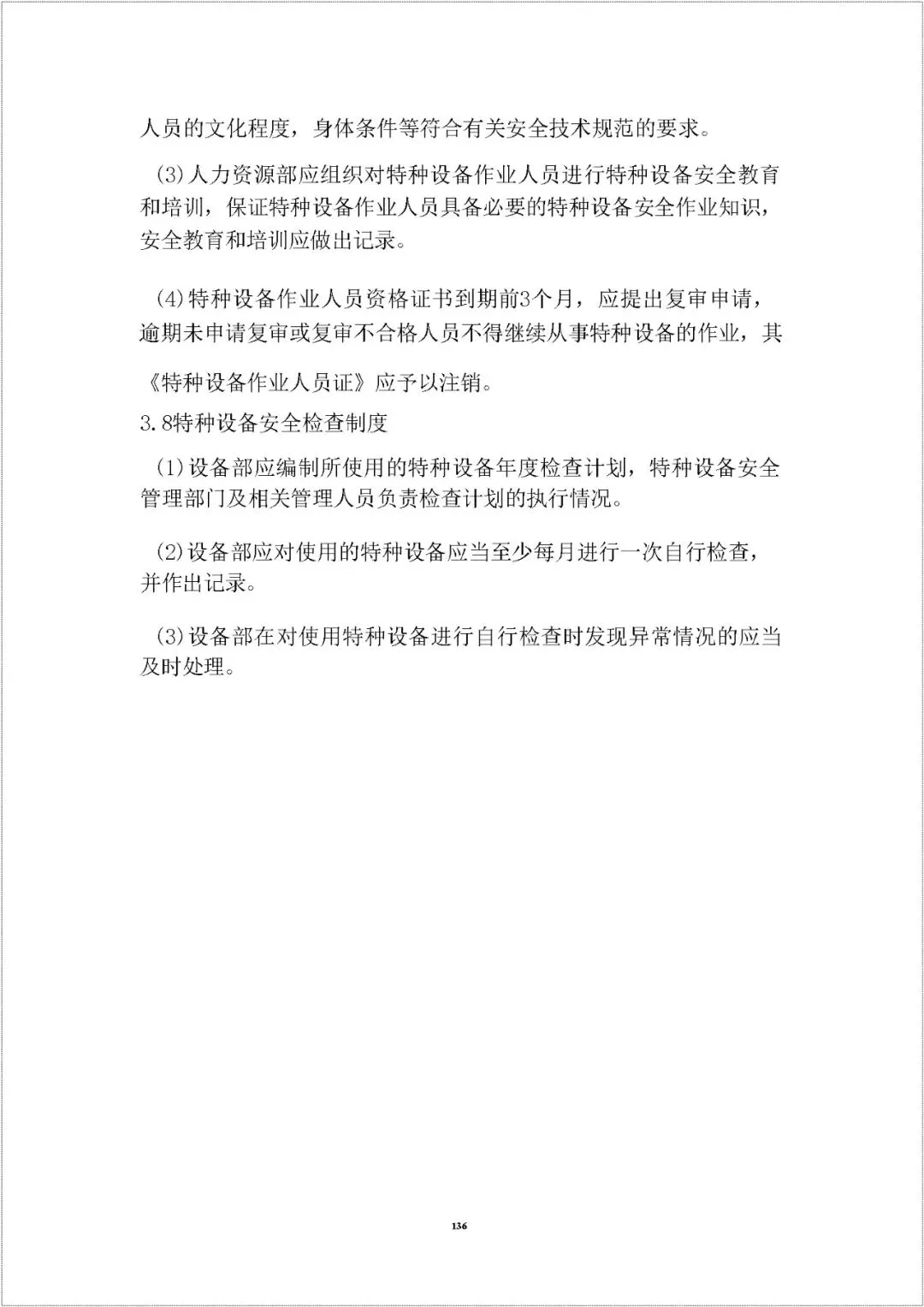 5.2 危险源点管理制度 575.3 煤气安全管理制度 605.4 安全检查制度 675.5 安全基础设施管理制度 705.6 安全奖惩制度 755.7 安全管理奖发放与考核办法 775.8 安全生产“挂牌”竞赛及安全先进评比办法 785.9 消防安全管理制度 795.10 特种作业人员管理制度 825.11 安全投入保障制度 895.12 劳动防护用品(具)和保健品发放管理制度 905.13 事故管理制度 905.14 职业卫生管理制度 925.15 安全生产会议管理制度 93第 6 章 教育培训 956.1 安全教育培训管理制度 956.2 年度安全教育培训计划 996.2.1 附表1:三级教育 1036.2.2 附表2:培训记录 1066.2.3 附表3:人员持证台账 108第 7 章 生产设备设施 1097.1 建设项目安全“三同时”管理制度 1097.2 设备设施安全管理制度 1127.3 生产设备、设施验收管理制度 1177.4 生产设施设备检修、维修和保养的安全管理制度 1197.5 生产设施安全拆除和报废管理制度 1217.6 电气设施安全管理制度 1247.7 特种设备安全管理制度汇编 1307.7.1 附表1:特种设备统计台账 1377.8 特种(设备)作业人员管理制度 138第 8 章 作业安全 1428.1 危险作业管理制度 1428.1.1 交叉作业管理制度 1428.1.2 受限空间作业安全管理制度 1518.1.3 动火作业安全管理制度 1588.1.4 大型吊装作业安全管理制度 1658.1.5 高处作业管理制度 1738.1.6 临时用电安全管理制度 1788.1.7 有毒、有害作业安全管理制度 1838.1.8 能源介质安全作业管理制度 1868.2 警示标志和安全防护管理制度 1918.3 变更管理制度 1938.3.1 附表1:变更申请表 1968.3.2 附表2:变更验收表 198