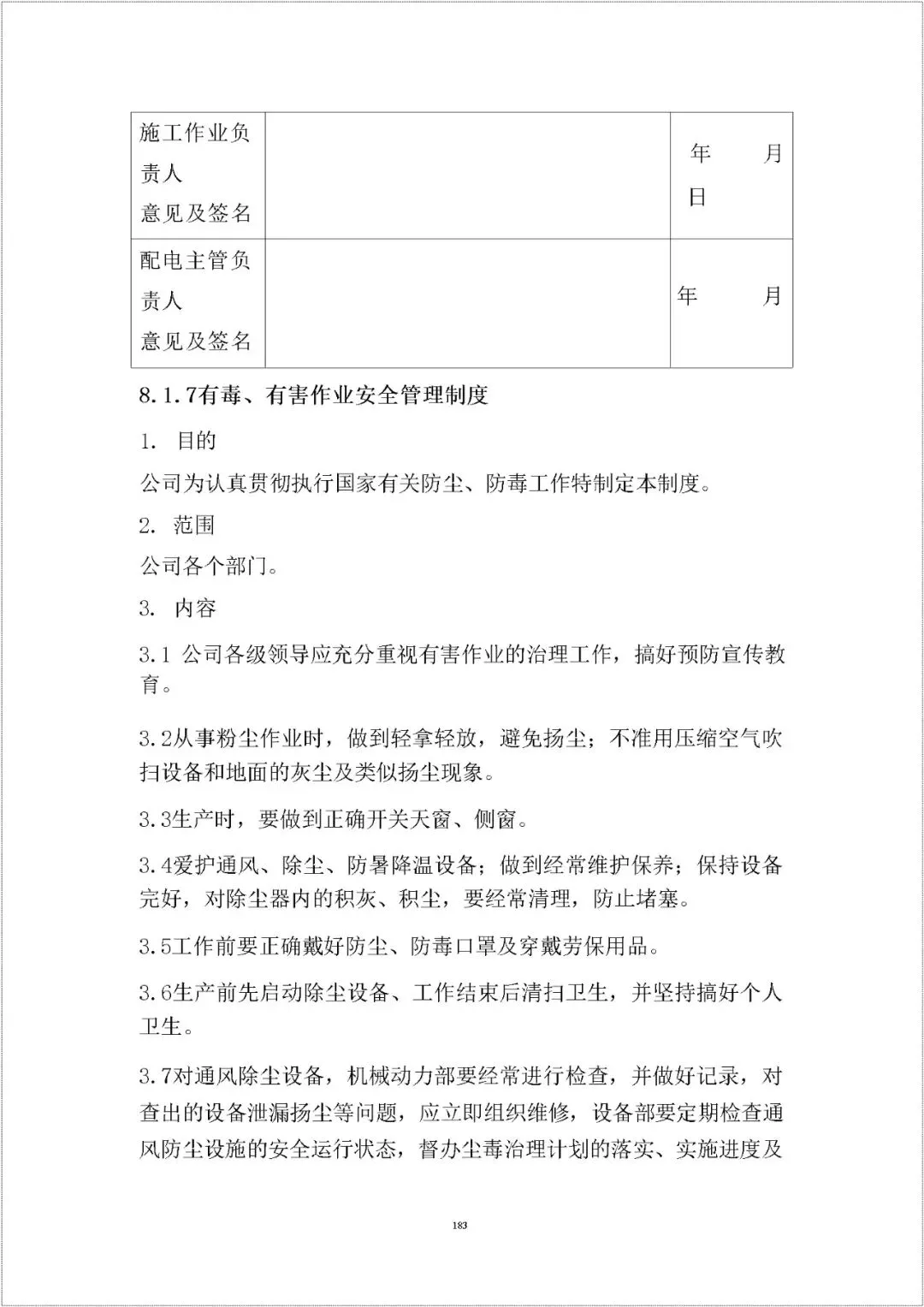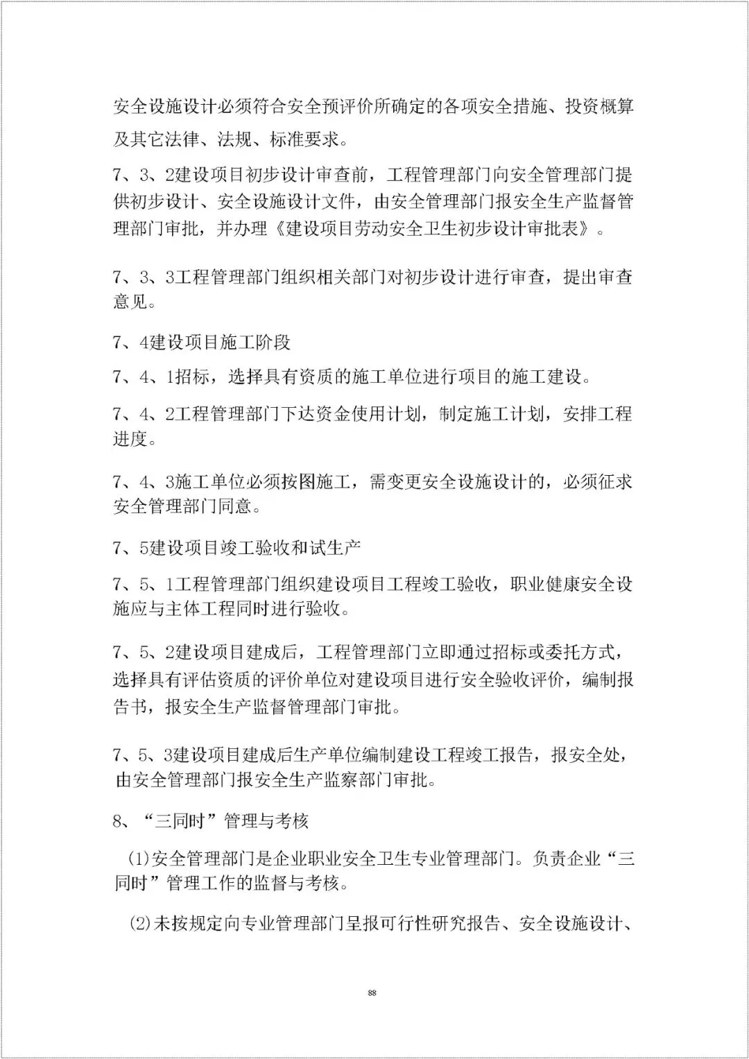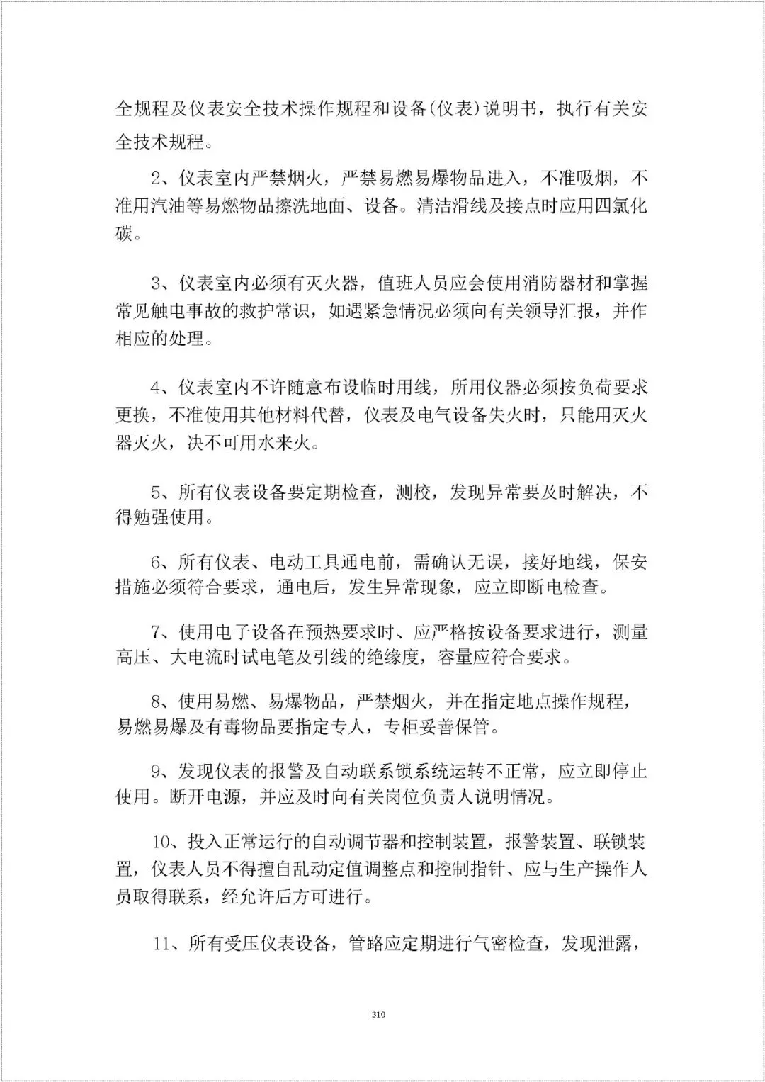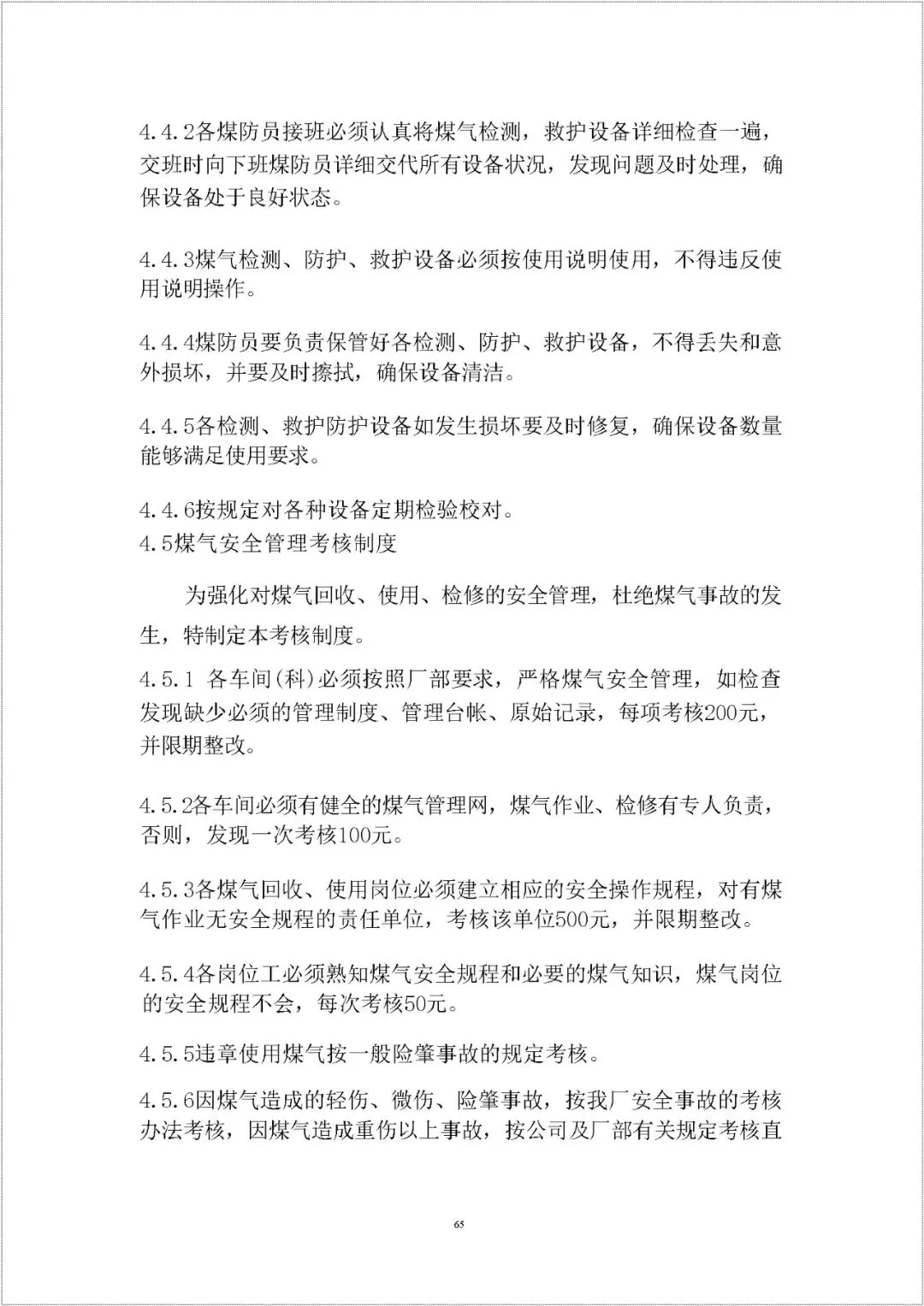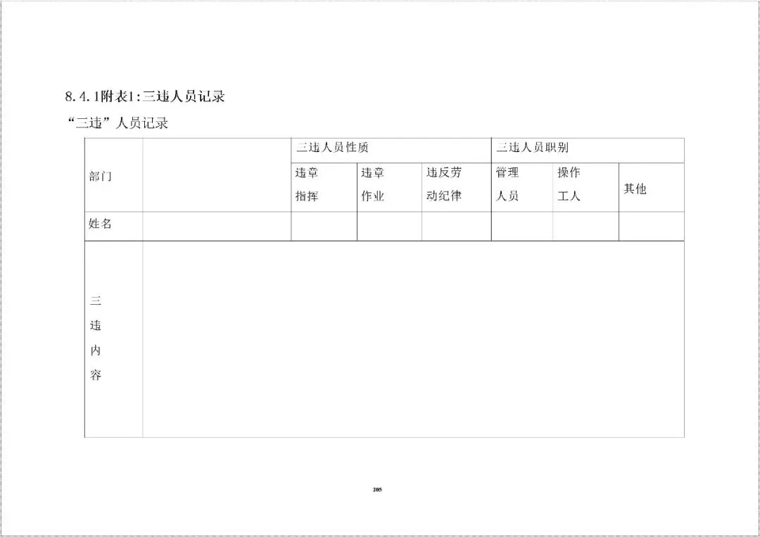 5.2 危险源点管理制度 575.3 煤气安全管理制度 605.4 安全检查制度 675.5 安全基础设施管理制度 705.6 安全奖惩制度 755.7 安全管理奖发放与考核办法 775.8 安全生产“挂牌”竞赛及安全先进评比办法 785.9 消防安全管理制度 795.10 特种作业人员管理制度 825.11 安全投入保障制度 895.12 劳动防护用品(具)和保健品发放管理制度 905.13 事故管理制度 905.14 职业卫生管理制度 925.15 安全生产会议管理制度 93第 6 章 教育培训 956.1 安全教育培训管理制度 956.2 年度安全教育培训计划 996.2.1 附表1:三级教育 1036.2.2 附表2:培训记录 1066.2.3 附表3:人员持证台账 108第 7 章 生产设备设施 1097.1 建设项目安全“三同时”管理制度 1097.2 设备设施安全管理制度 1127.3 生产设备、设施验收管理制度 1177.4 生产设施设备检修、维修和保养的安全管理制度 1197.5 生产设施安全拆除和报废管理制度 1217.6 电气设施安全管理制度 1247.7 特种设备安全管理制度汇编 1307.7.1 附表1:特种设备统计台账 1377.8 特种(设备)作业人员管理制度 138第 8 章 作业安全 1428.1 危险作业管理制度 1428.1.1 交叉作业管理制度 1428.1.2 受限空间作业安全管理制度 1518.1.3 动火作业安全管理制度 1588.1.4 大型吊装作业安全管理制度 1658.1.5 高处作业管理制度 1738.1.6 临时用电安全管理制度 1788.1.7 有毒、有害作业安全管理制度 1838.1.8 能源介质安全作业管理制度 1868.2 警示标志和安全防护管理制度 1918.3 变更管理制度 1938.3.1 附表1:变更申请表 1968.3.2 附表2:变更验收表 198