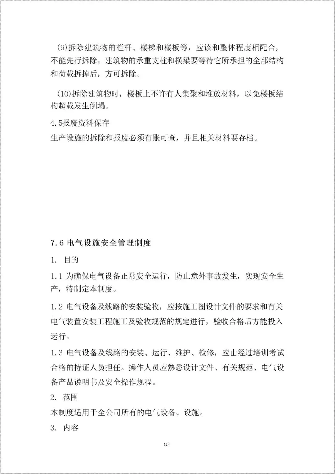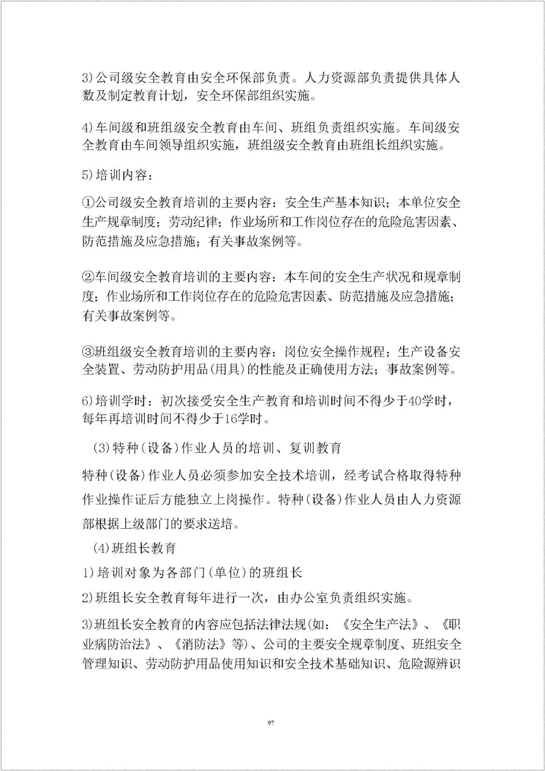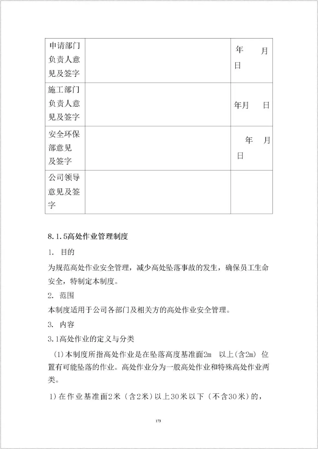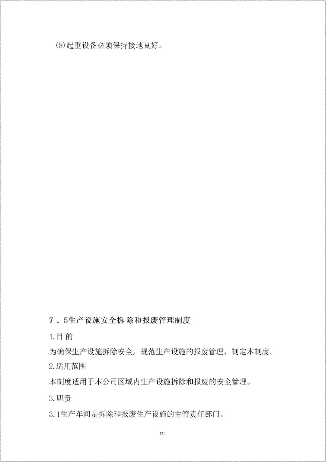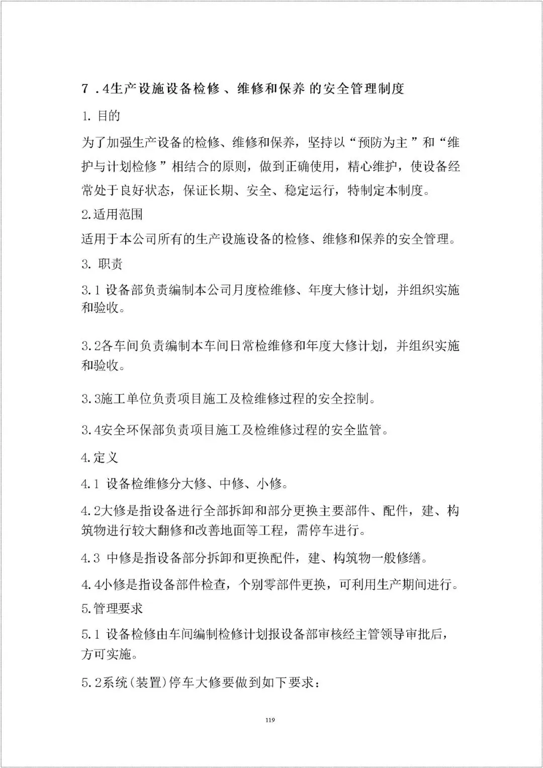 5.2 危险源点管理制度 575.3 煤气安全管理制度 605.4 安全检查制度 675.5 安全基础设施管理制度 705.6 安全奖惩制度 755.7 安全管理奖发放与考核办法 775.8 安全生产“挂牌”竞赛及安全先进评比办法 785.9 消防安全管理制度 795.10 特种作业人员管理制度 825.11 安全投入保障制度 895.12 劳动防护用品(具)和保健品发放管理制度 905.13 事故管理制度 905.14 职业卫生管理制度 925.15 安全生产会议管理制度 93第 6 章 教育培训 956.1 安全教育培训管理制度 956.2 年度安全教育培训计划 996.2.1 附表1:三级教育 1036.2.2 附表2:培训记录 1066.2.3 附表3:人员持证台账 108第 7 章 生产设备设施 1097.1 建设项目安全“三同时”管理制度 1097.2 设备设施安全管理制度 1127.3 生产设备、设施验收管理制度 1177.4 生产设施设备检修、维修和保养的安全管理制度 1197.5 生产设施安全拆除和报废管理制度 1217.6 电气设施安全管理制度 1247.7 特种设备安全管理制度汇编 1307.7.1 附表1:特种设备统计台账 1377.8 特种(设备)作业人员管理制度 138第 8 章 作业安全 1428.1 危险作业管理制度 1428.1.1 交叉作业管理制度 1428.1.2 受限空间作业安全管理制度 1518.1.3 动火作业安全管理制度 1588.1.4 大型吊装作业安全管理制度 1658.1.5 高处作业管理制度 1738.1.6 临时用电安全管理制度 1788.1.7 有毒、有害作业安全管理制度 1838.1.8 能源介质安全作业管理制度 1868.2 警示标志和安全防护管理制度 1918.3 变更管理制度 1938.3.1 附表1:变更申请表 1968.3.2 附表2:变更验收表 198