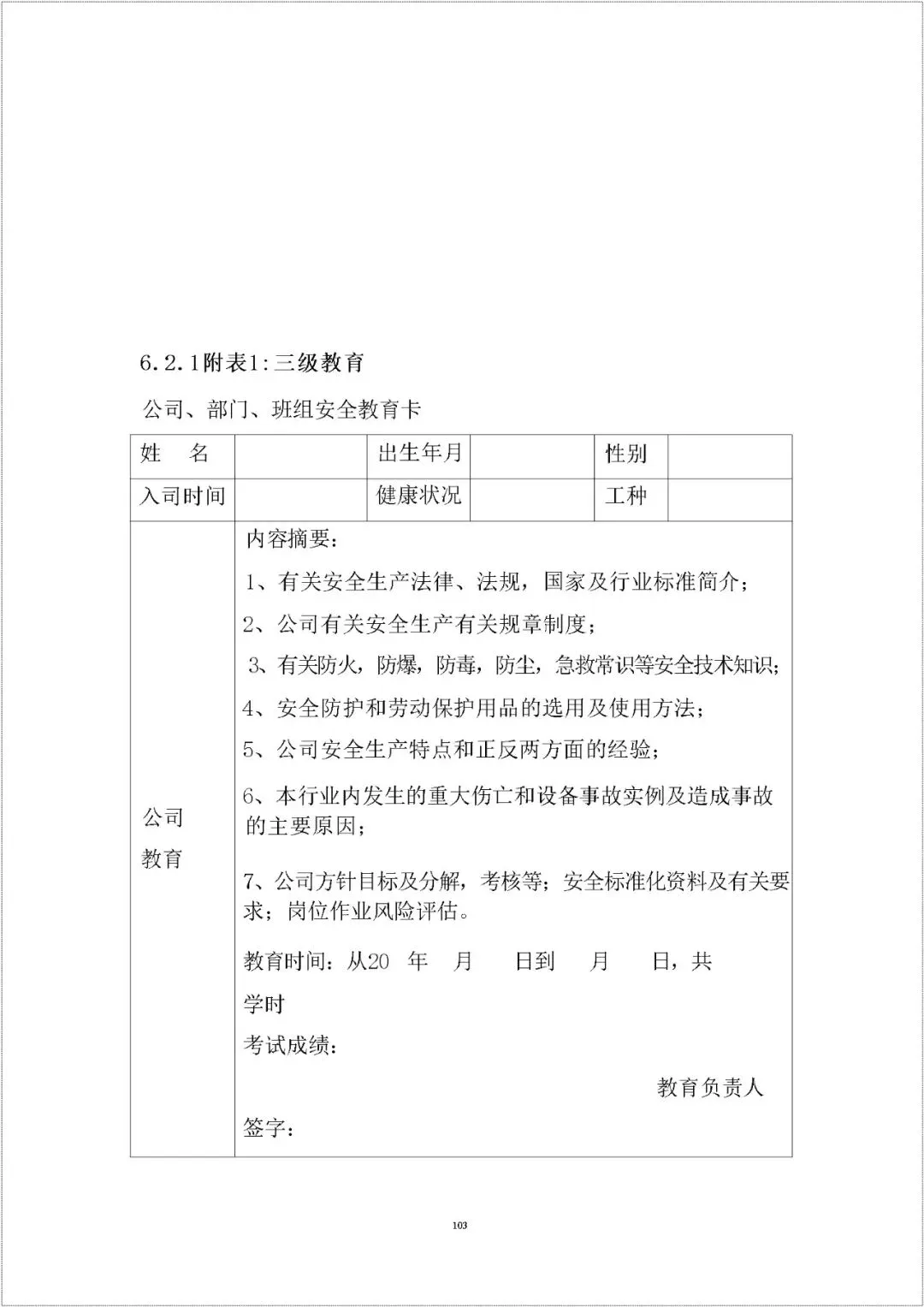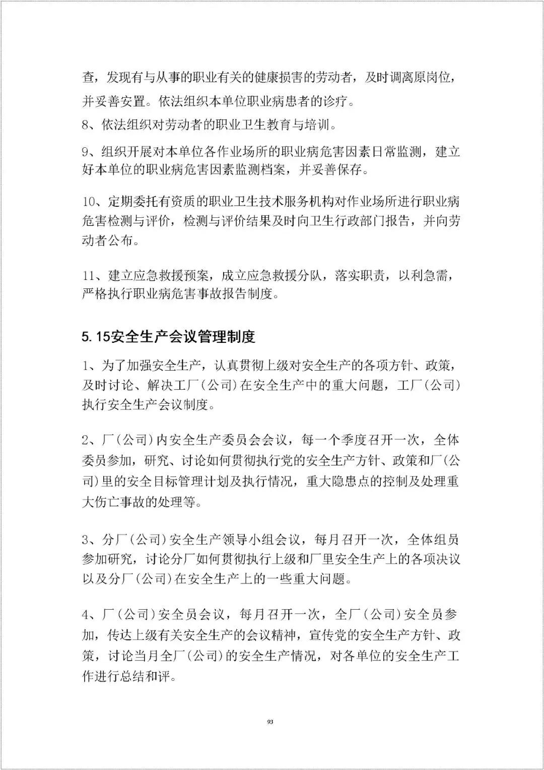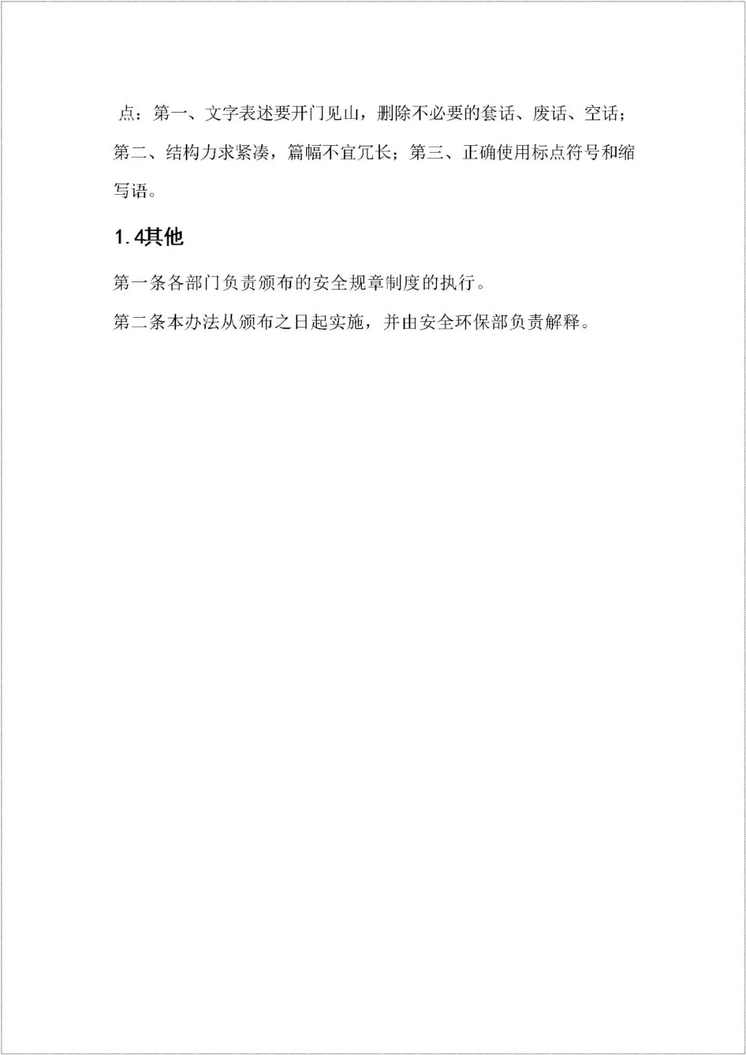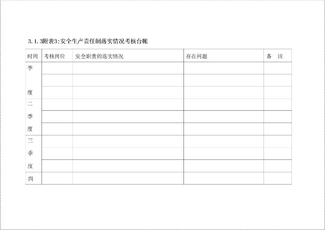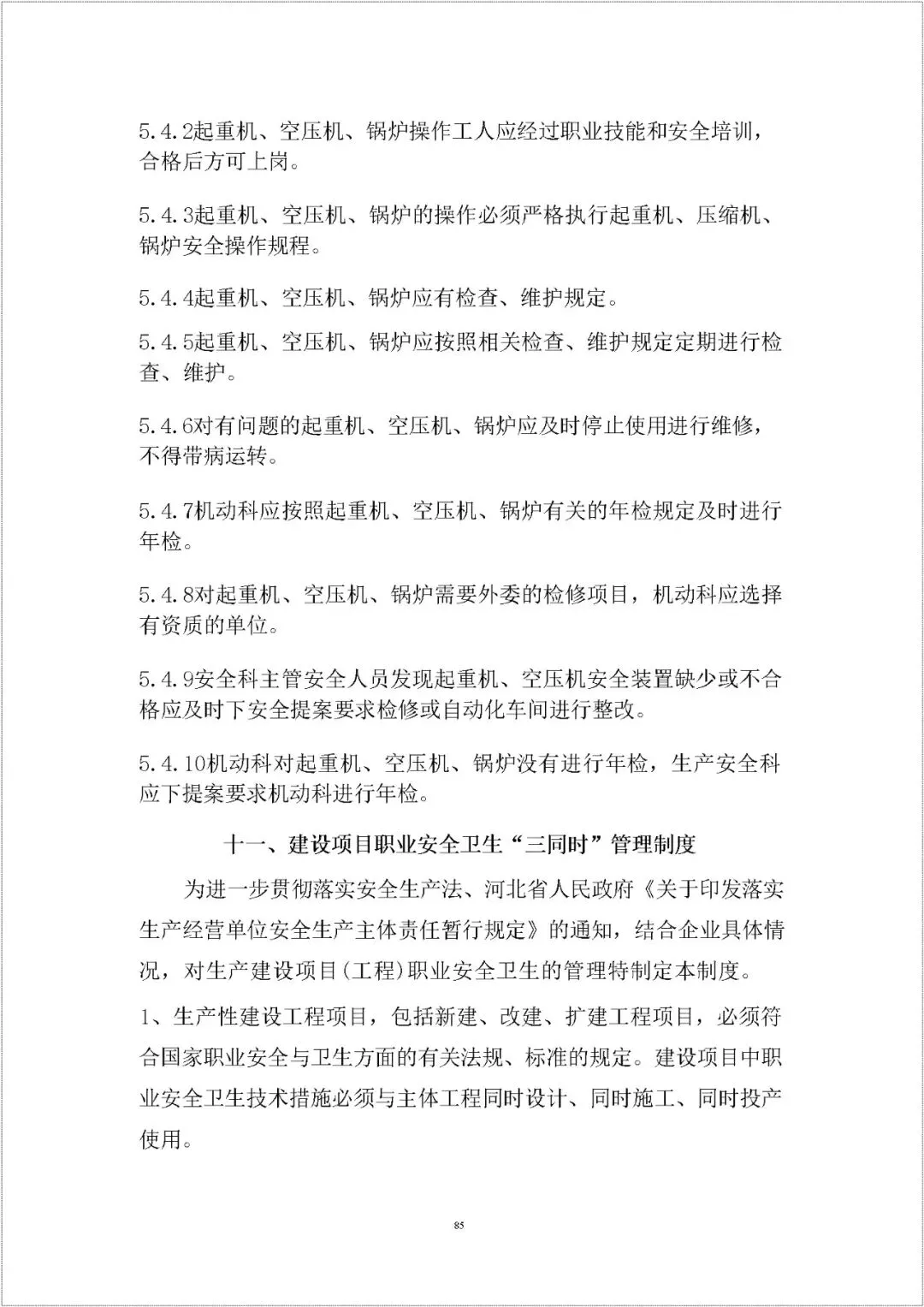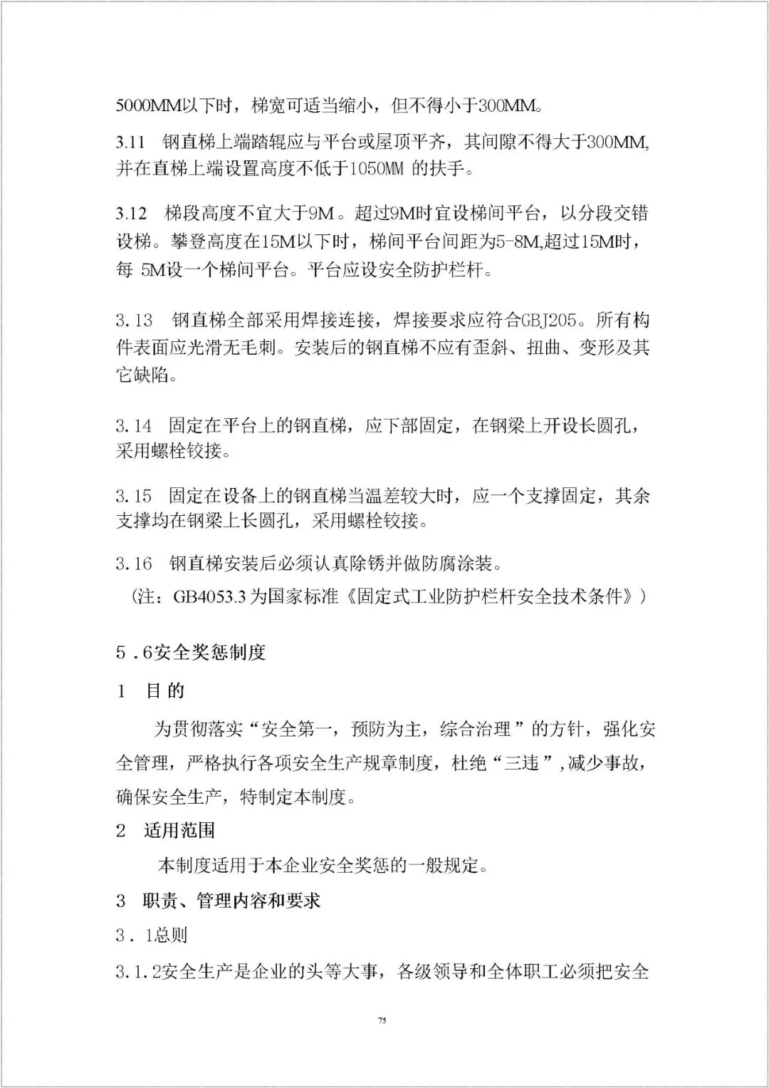 5.2 危险源点管理制度 575.3 煤气安全管理制度 605.4 安全检查制度 675.5 安全基础设施管理制度 705.6 安全奖惩制度 755.7 安全管理奖发放与考核办法 775.8 安全生产“挂牌”竞赛及安全先进评比办法 785.9 消防安全管理制度 795.10 特种作业人员管理制度 825.11 安全投入保障制度 895.12 劳动防护用品(具)和保健品发放管理制度 905.13 事故管理制度 905.14 职业卫生管理制度 925.15 安全生产会议管理制度 93第 6 章 教育培训 956.1 安全教育培训管理制度 956.2 年度安全教育培训计划 996.2.1 附表1:三级教育 1036.2.2 附表2:培训记录 1066.2.3 附表3:人员持证台账 108第 7 章 生产设备设施 1097.1 建设项目安全“三同时”管理制度 1097.2 设备设施安全管理制度 1127.3 生产设备、设施验收管理制度 1177.4 生产设施设备检修、维修和保养的安全管理制度 1197.5 生产设施安全拆除和报废管理制度 1217.6 电气设施安全管理制度 1247.7 特种设备安全管理制度汇编 1307.7.1 附表1:特种设备统计台账 1377.8 特种(设备)作业人员管理制度 138第 8 章 作业安全 1428.1 危险作业管理制度 1428.1.1 交叉作业管理制度 1428.1.2 受限空间作业安全管理制度 1518.1.3 动火作业安全管理制度 1588.1.4 大型吊装作业安全管理制度 1658.1.5 高处作业管理制度 1738.1.6 临时用电安全管理制度 1788.1.7 有毒、有害作业安全管理制度 1838.1.8 能源介质安全作业管理制度 1868.2 警示标志和安全防护管理制度 1918.3 变更管理制度 1938.3.1 附表1:变更申请表 1968.3.2 附表2:变更验收表 198