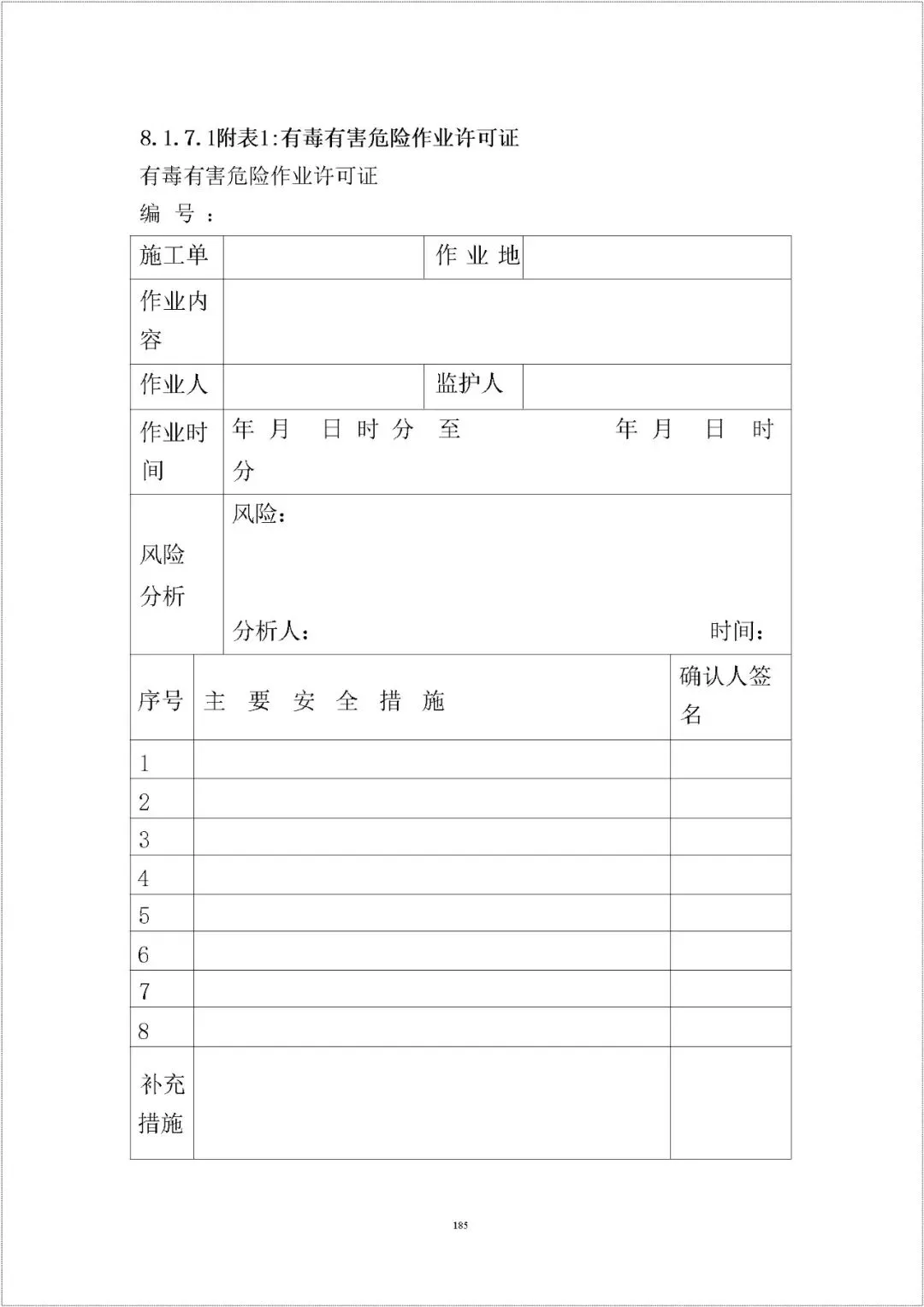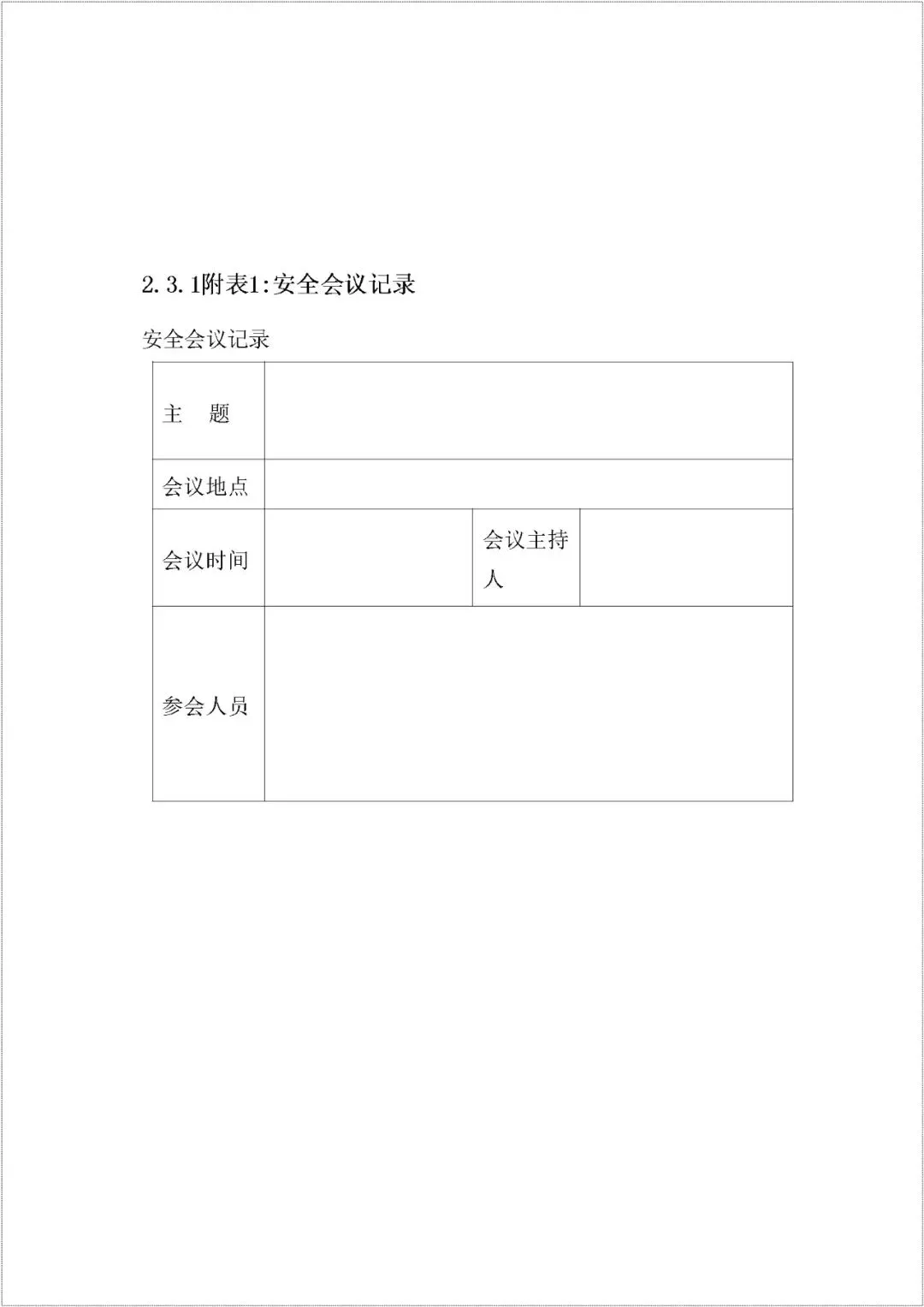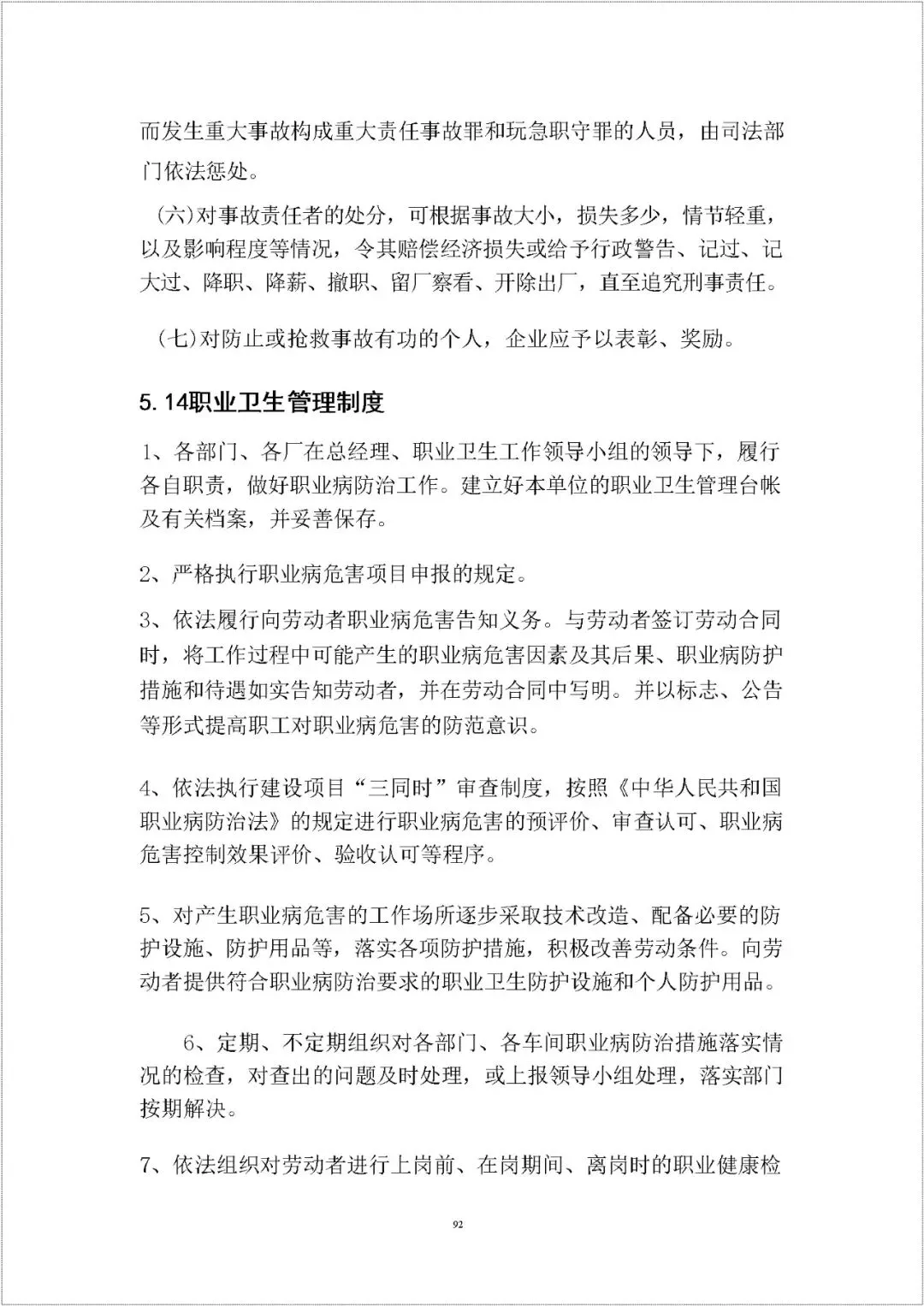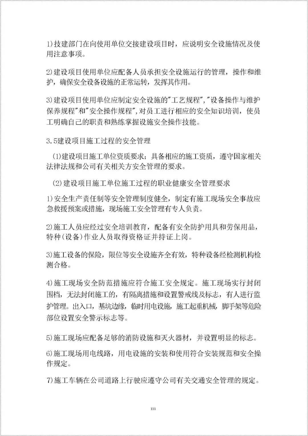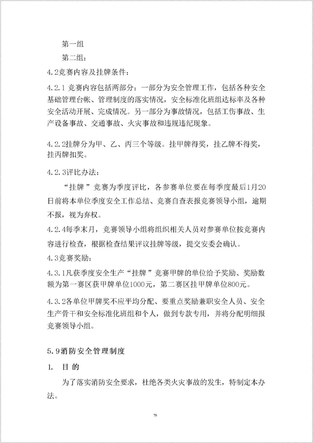 5.2 危险源点管理制度 575.3 煤气安全管理制度 605.4 安全检查制度 675.5 安全基础设施管理制度 705.6 安全奖惩制度 755.7 安全管理奖发放与考核办法 775.8 安全生产“挂牌”竞赛及安全先进评比办法 785.9 消防安全管理制度 795.10 特种作业人员管理制度 825.11 安全投入保障制度 895.12 劳动防护用品(具)和保健品发放管理制度 905.13 事故管理制度 905.14 职业卫生管理制度 925.15 安全生产会议管理制度 93第 6 章 教育培训 956.1 安全教育培训管理制度 956.2 年度安全教育培训计划 996.2.1 附表1:三级教育 1036.2.2 附表2:培训记录 1066.2.3 附表3:人员持证台账 108第 7 章 生产设备设施 1097.1 建设项目安全“三同时”管理制度 1097.2 设备设施安全管理制度 1127.3 生产设备、设施验收管理制度 1177.4 生产设施设备检修、维修和保养的安全管理制度 1197.5 生产设施安全拆除和报废管理制度 1217.6 电气设施安全管理制度 1247.7 特种设备安全管理制度汇编 1307.7.1 附表1:特种设备统计台账 1377.8 特种(设备)作业人员管理制度 138第 8 章 作业安全 1428.1 危险作业管理制度 1428.1.1 交叉作业管理制度 1428.1.2 受限空间作业安全管理制度 1518.1.3 动火作业安全管理制度 1588.1.4 大型吊装作业安全管理制度 1658.1.5 高处作业管理制度 1738.1.6 临时用电安全管理制度 1788.1.7 有毒、有害作业安全管理制度 1838.1.8 能源介质安全作业管理制度 1868.2 警示标志和安全防护管理制度 1918.3 变更管理制度 1938.3.1 附表1:变更申请表 1968.3.2 附表2:变更验收表 198