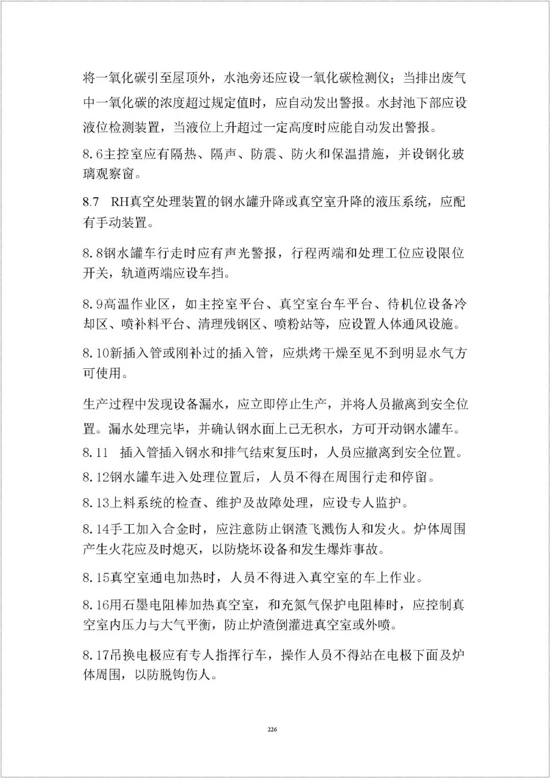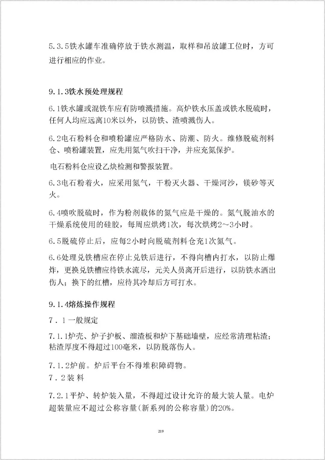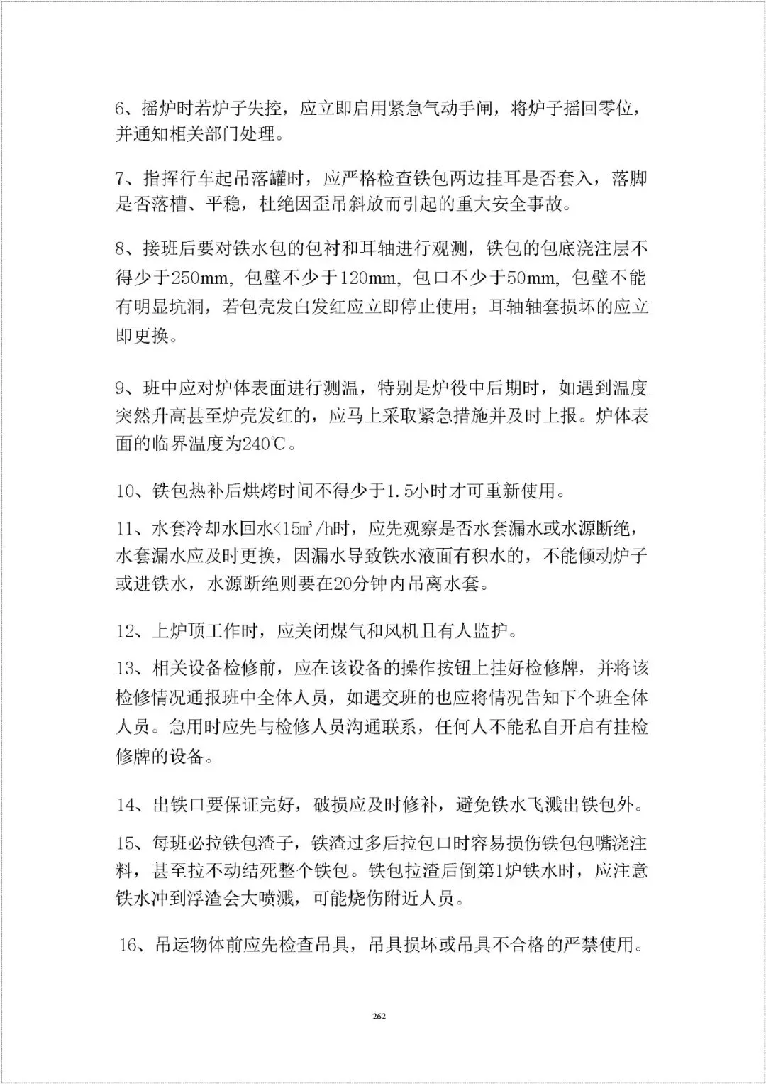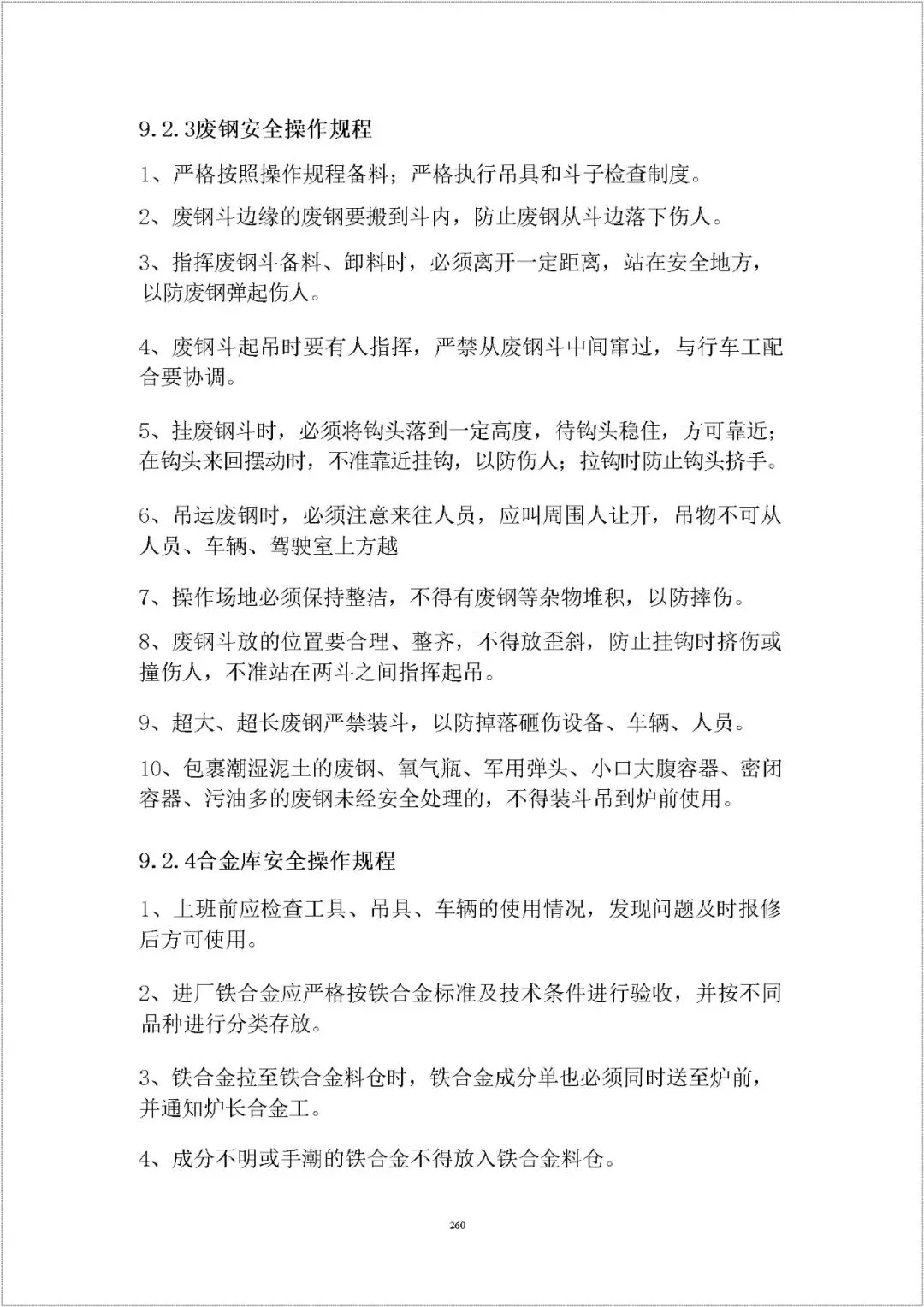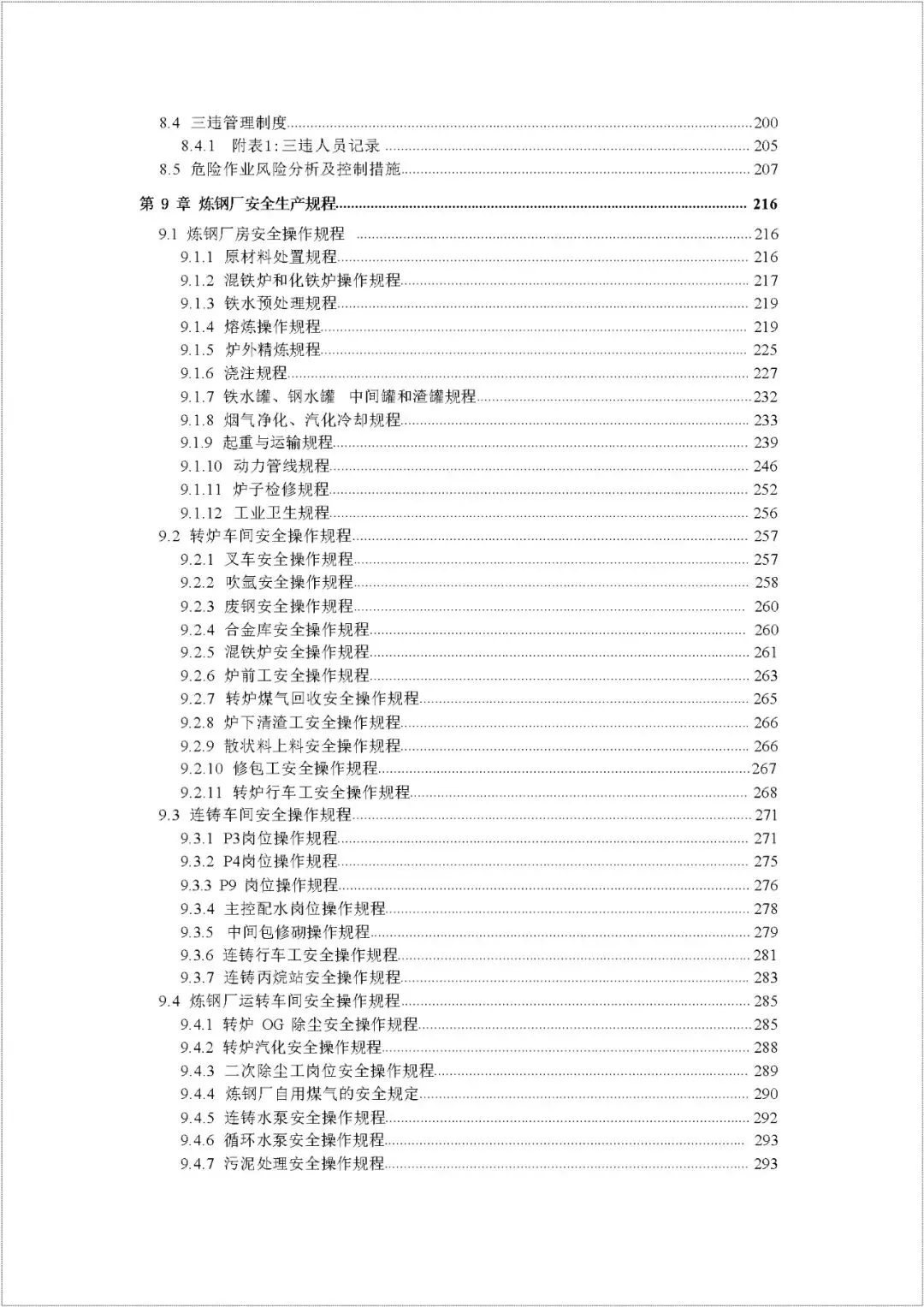 8.4 三违管理制度 2008.4.1 附表1:三违人员记录 2058.5 危险作业风险分析及控制措施 207第 9 章 炼钢厂安全生产规程 2169.1 炼钢厂房安全操作规程 2169.1.1 原材料处置规程 2169.1.2 混铁炉和化铁炉操作规程 2179.1.3 铁水预处理规程 2199.1.4 熔炼操作规程 2199.1.5 炉外精炼规程 2259.1.6 浇注规程 2279.1.7 铁水罐、钢水罐 中间罐和渣罐规程 2329.1.8 烟气净化、汽化冷却规程 2339.1.9 起重与运输规程 2399.1.10 动力管线规程 2469.1.11 炉子检修规程 2529.1.12 工业卫生规程 2569.2 转炉车间安全操作规程 2579.2.1 叉车安全操作规程 2579.2.2 吹氩安全操作规程 2589.2.3 废钢安全操作规程 2609.2.4 合金库安全操作规程 2609.2.5 混铁炉安全操作规程 2619.2.6 炉前工安全操作规程 2639.2.7 转炉煤气回收安全操作规程 2659.2.8 炉下清渣工安全操作规程 2669.2.9 散状料上料安全操作规程 2669.2.10 修包工安全操作规程 2679.2.11 转炉行车工安全操作规程 2689.3 连铸车间安全操作规程 2719.3.1 P3岗位操作规程 2719.3.2 P4岗位操作规程 2759.3.3 P9 岗位操作规程 2769.3.4 主控配水岗位操作规程 2789.3.5 中间包修砌操作规程 2799.3.6 连铸行车工安全操作规程 2819.3.7 连铸丙烷站安全操作规程 2839.4 炼钢厂运转车间安全操作规程 2859.4.1 转炉 OG 除尘安全操作规程 2859.4.2 转炉汽化安全操作规程 2889.4.3 二次除尘工岗位安全操作规程 2899.4.4 炼钢厂自用煤气的安全规定 2909.4.5 连铸水泵安全操作规程 2929.4.6 循环水泵安全操作规程 2939.4.7 污泥处理安全操作规程 293