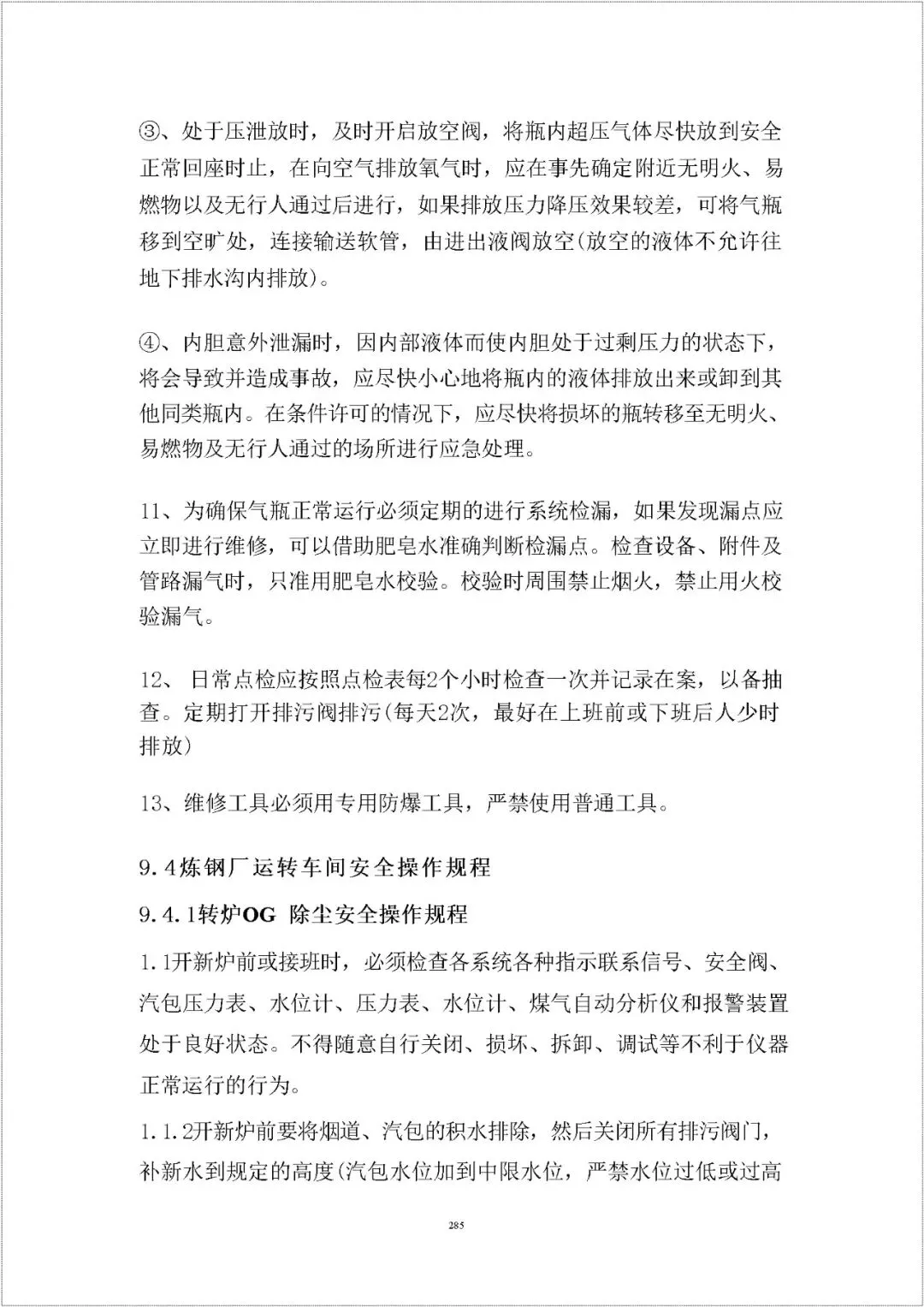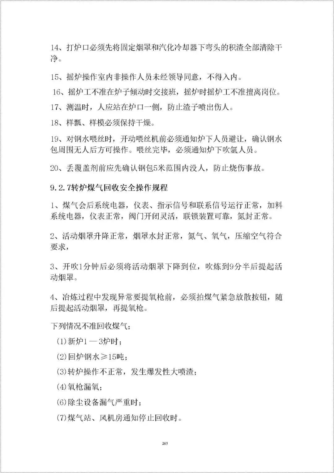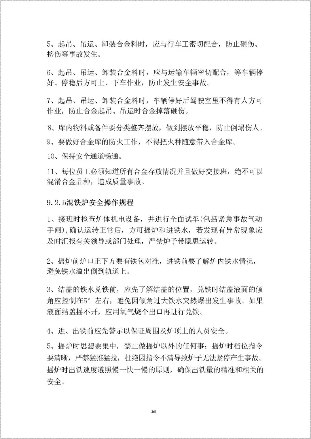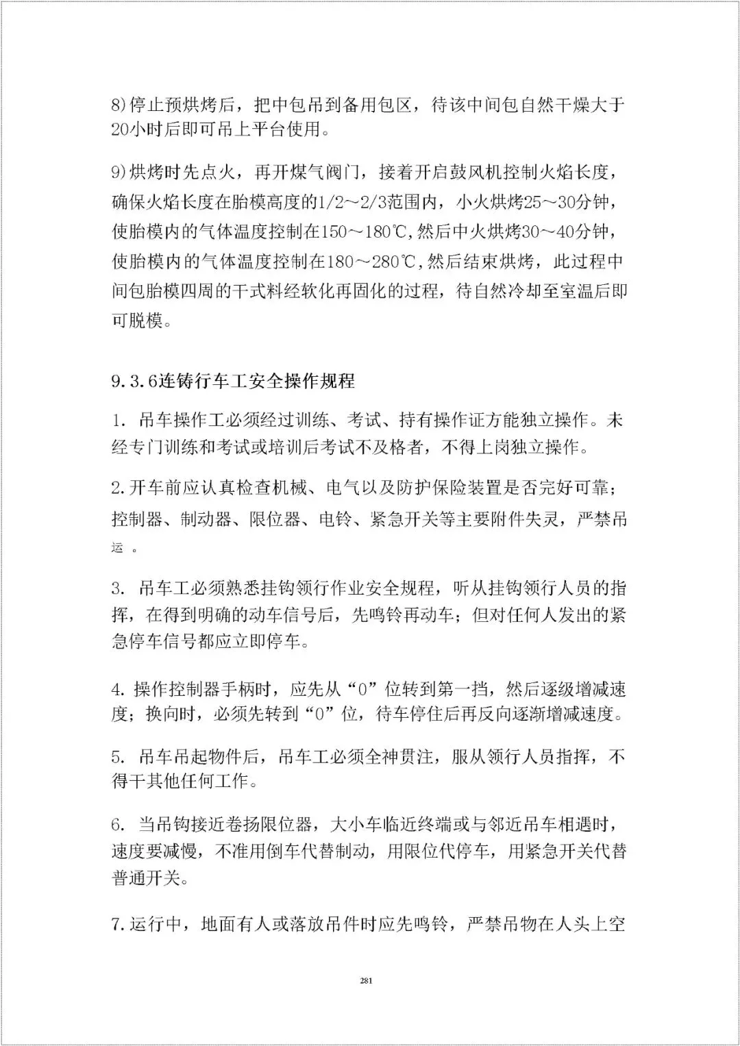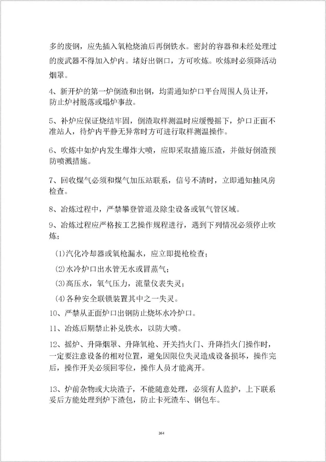 8.4 三违管理制度 2008.4.1 附表1:三违人员记录 2058.5 危险作业风险分析及控制措施 207第 9 章 炼钢厂安全生产规程 2169.1 炼钢厂房安全操作规程 2169.1.1 原材料处置规程 2169.1.2 混铁炉和化铁炉操作规程 2179.1.3 铁水预处理规程 2199.1.4 熔炼操作规程 2199.1.5 炉外精炼规程 2259.1.6 浇注规程 2279.1.7 铁水罐、钢水罐 中间罐和渣罐规程 2329.1.8 烟气净化、汽化冷却规程 2339.1.9 起重与运输规程 2399.1.10 动力管线规程 2469.1.11 炉子检修规程 2529.1.12 工业卫生规程 2569.2 转炉车间安全操作规程 2579.2.1 叉车安全操作规程 2579.2.2 吹氩安全操作规程 2589.2.3 废钢安全操作规程 2609.2.4 合金库安全操作规程 2609.2.5 混铁炉安全操作规程 2619.2.6 炉前工安全操作规程 2639.2.7 转炉煤气回收安全操作规程 2659.2.8 炉下清渣工安全操作规程 2669.2.9 散状料上料安全操作规程 2669.2.10 修包工安全操作规程 2679.2.11 转炉行车工安全操作规程 2689.3 连铸车间安全操作规程 2719.3.1 P3岗位操作规程 2719.3.2 P4岗位操作规程 2759.3.3 P9 岗位操作规程 2769.3.4 主控配水岗位操作规程 2789.3.5 中间包修砌操作规程 2799.3.6 连铸行车工安全操作规程 2819.3.7 连铸丙烷站安全操作规程 2839.4 炼钢厂运转车间安全操作规程 2859.4.1 转炉 OG 除尘安全操作规程 2859.4.2 转炉汽化安全操作规程 2889.4.3 二次除尘工岗位安全操作规程 2899.4.4 炼钢厂自用煤气的安全规定 2909.4.5 连铸水泵安全操作规程 2929.4.6 循环水泵安全操作规程 2939.4.7 污泥处理安全操作规程 293