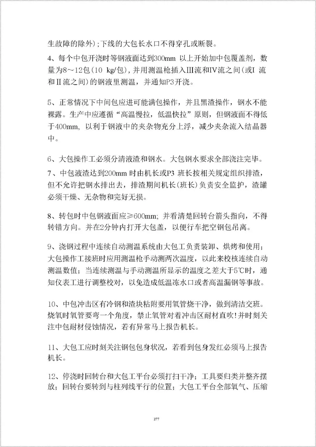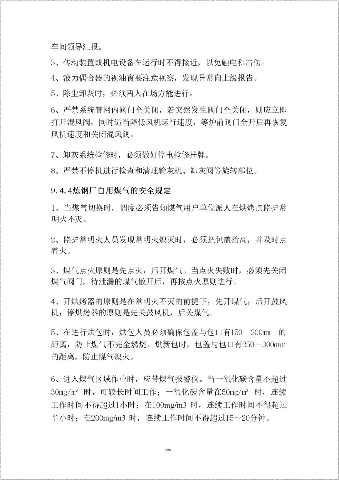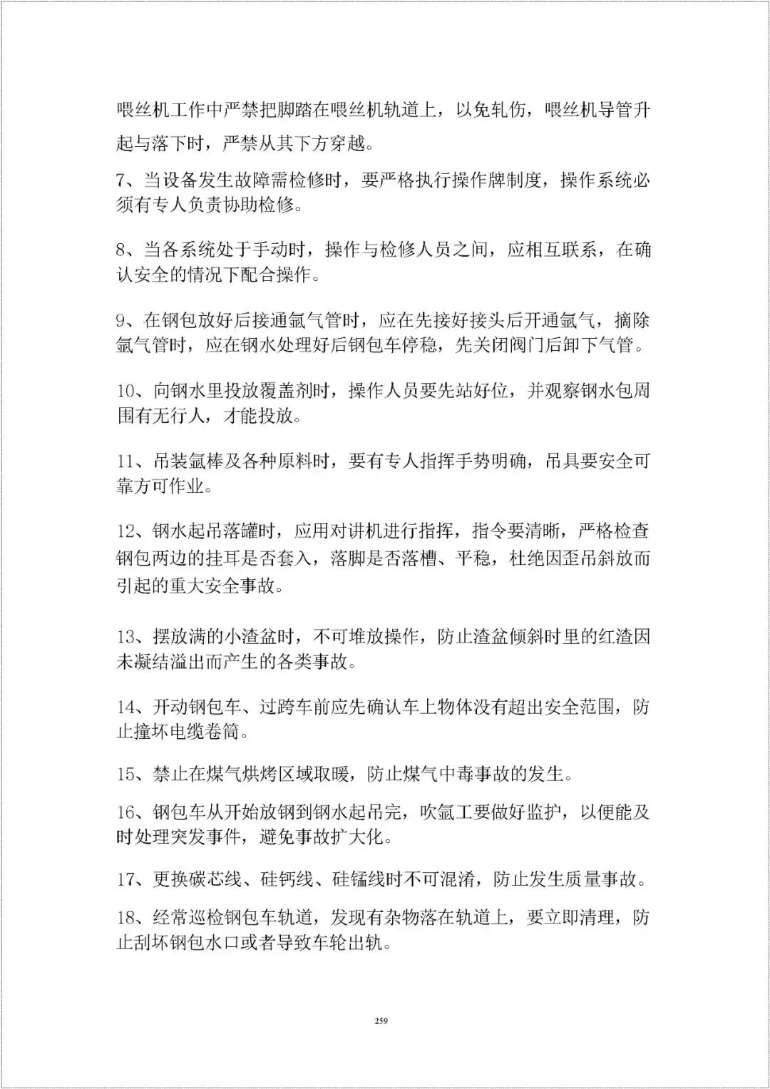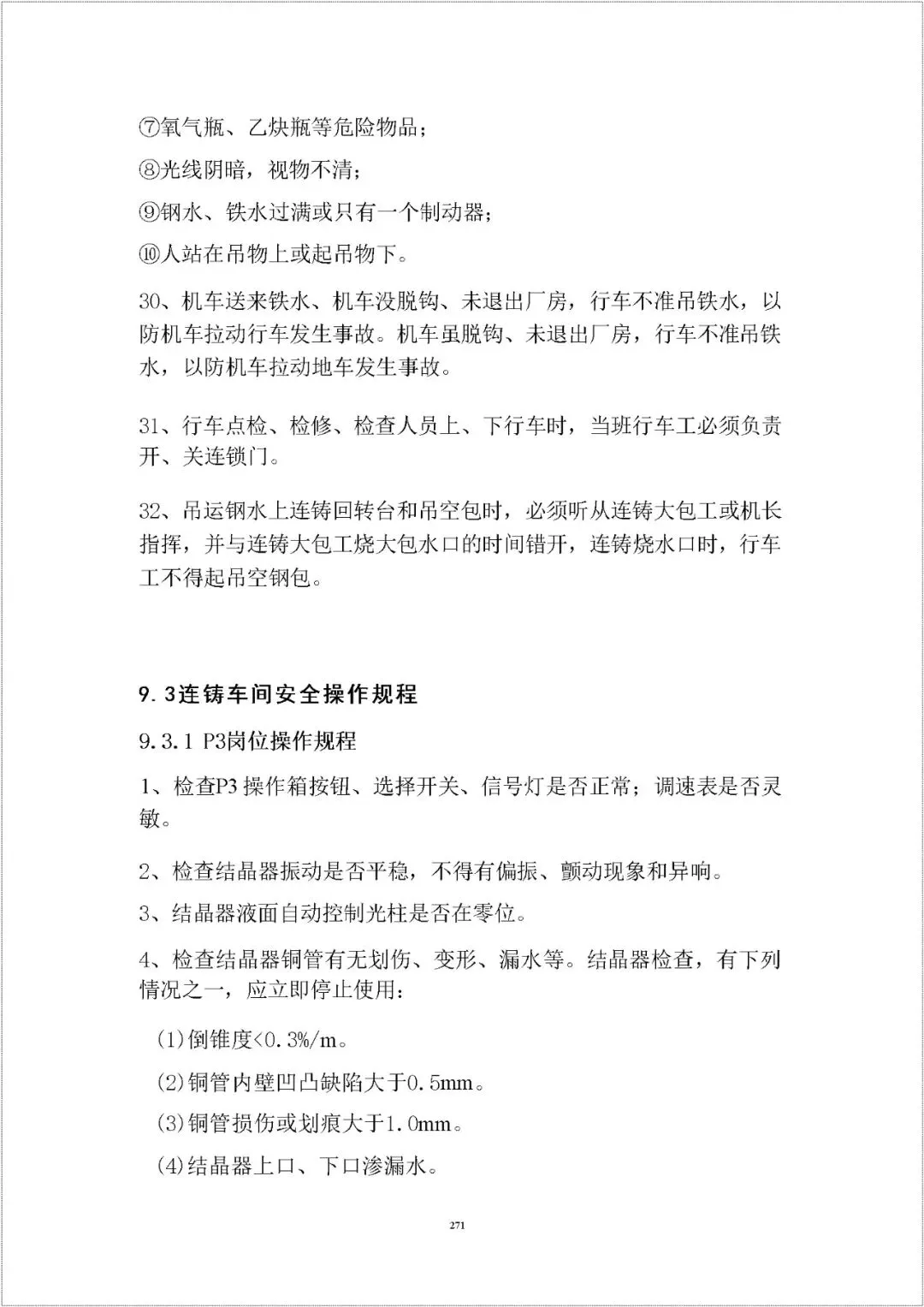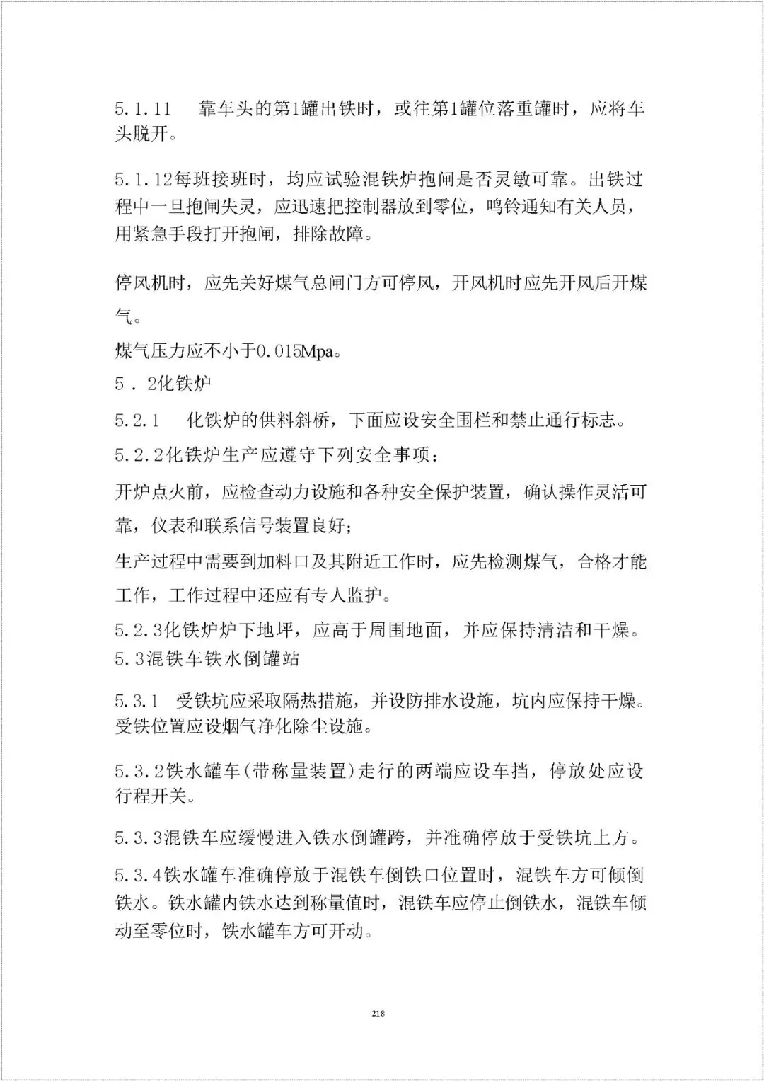 8.4 三违管理制度 2008.4.1 附表1:三违人员记录 2058.5 危险作业风险分析及控制措施 207第 9 章 炼钢厂安全生产规程 2169.1 炼钢厂房安全操作规程 2169.1.1 原材料处置规程 2169.1.2 混铁炉和化铁炉操作规程 2179.1.3 铁水预处理规程 2199.1.4 熔炼操作规程 2199.1.5 炉外精炼规程 2259.1.6 浇注规程 2279.1.7 铁水罐、钢水罐 中间罐和渣罐规程 2329.1.8 烟气净化、汽化冷却规程 2339.1.9 起重与运输规程 2399.1.10 动力管线规程 2469.1.11 炉子检修规程 2529.1.12 工业卫生规程 2569.2 转炉车间安全操作规程 2579.2.1 叉车安全操作规程 2579.2.2 吹氩安全操作规程 2589.2.3 废钢安全操作规程 2609.2.4 合金库安全操作规程 2609.2.5 混铁炉安全操作规程 2619.2.6 炉前工安全操作规程 2639.2.7 转炉煤气回收安全操作规程 2659.2.8 炉下清渣工安全操作规程 2669.2.9 散状料上料安全操作规程 2669.2.10 修包工安全操作规程 2679.2.11 转炉行车工安全操作规程 2689.3 连铸车间安全操作规程 2719.3.1 P3岗位操作规程 2719.3.2 P4岗位操作规程 2759.3.3 P9 岗位操作规程 2769.3.4 主控配水岗位操作规程 2789.3.5 中间包修砌操作规程 2799.3.6 连铸行车工安全操作规程 2819.3.7 连铸丙烷站安全操作规程 2839.4 炼钢厂运转车间安全操作规程 2859.4.1 转炉 OG 除尘安全操作规程 2859.4.2 转炉汽化安全操作规程 2889.4.3 二次除尘工岗位安全操作规程 2899.4.4 炼钢厂自用煤气的安全规定 2909.4.5 连铸水泵安全操作规程 2929.4.6 循环水泵安全操作规程 2939.4.7 污泥处理安全操作规程 293