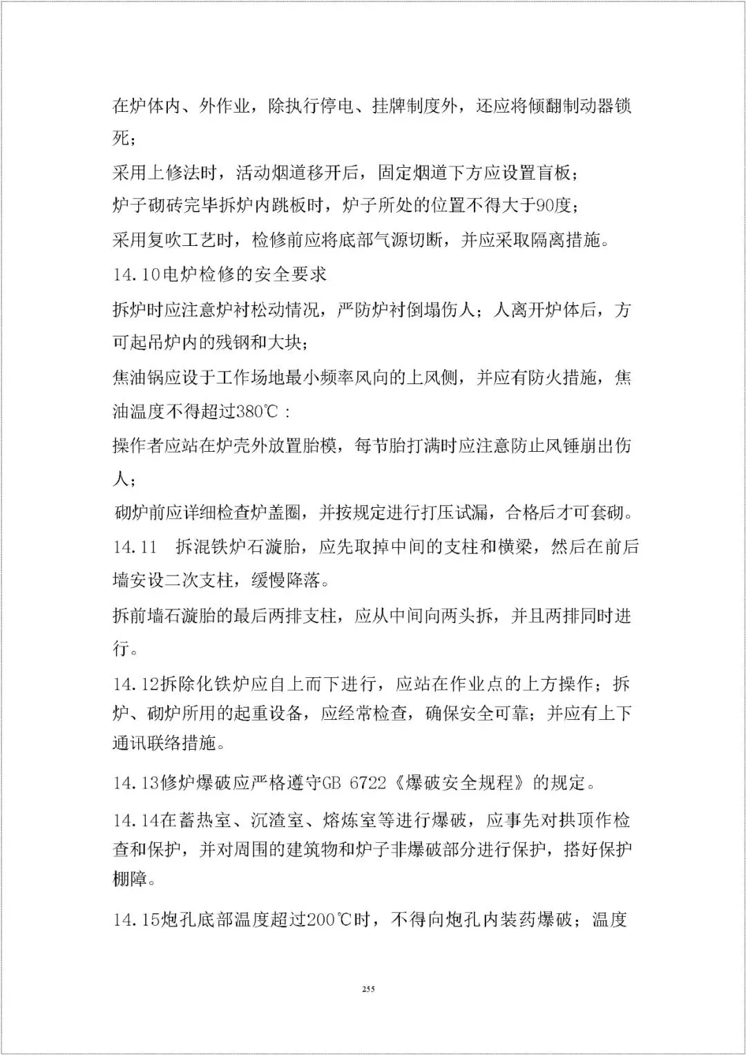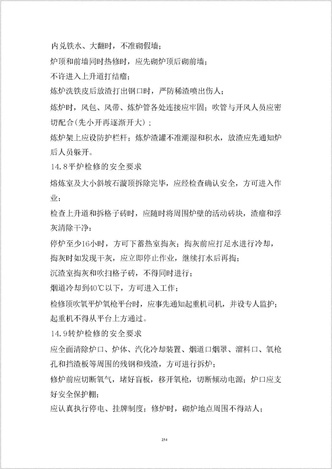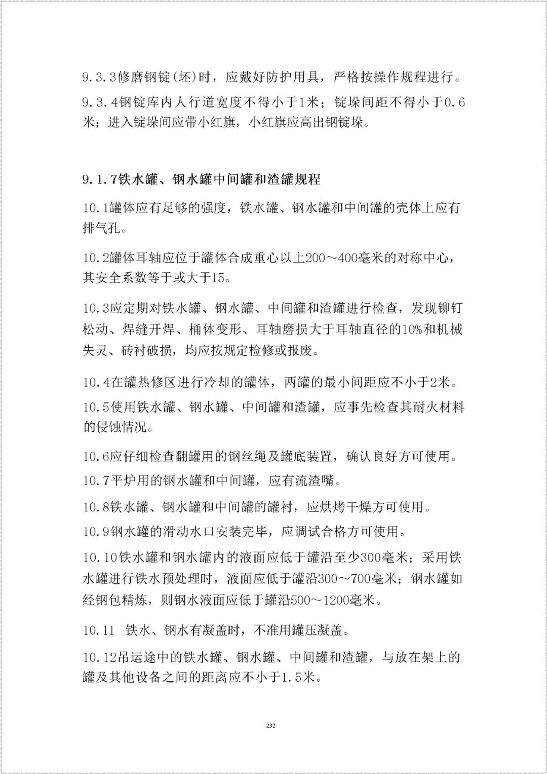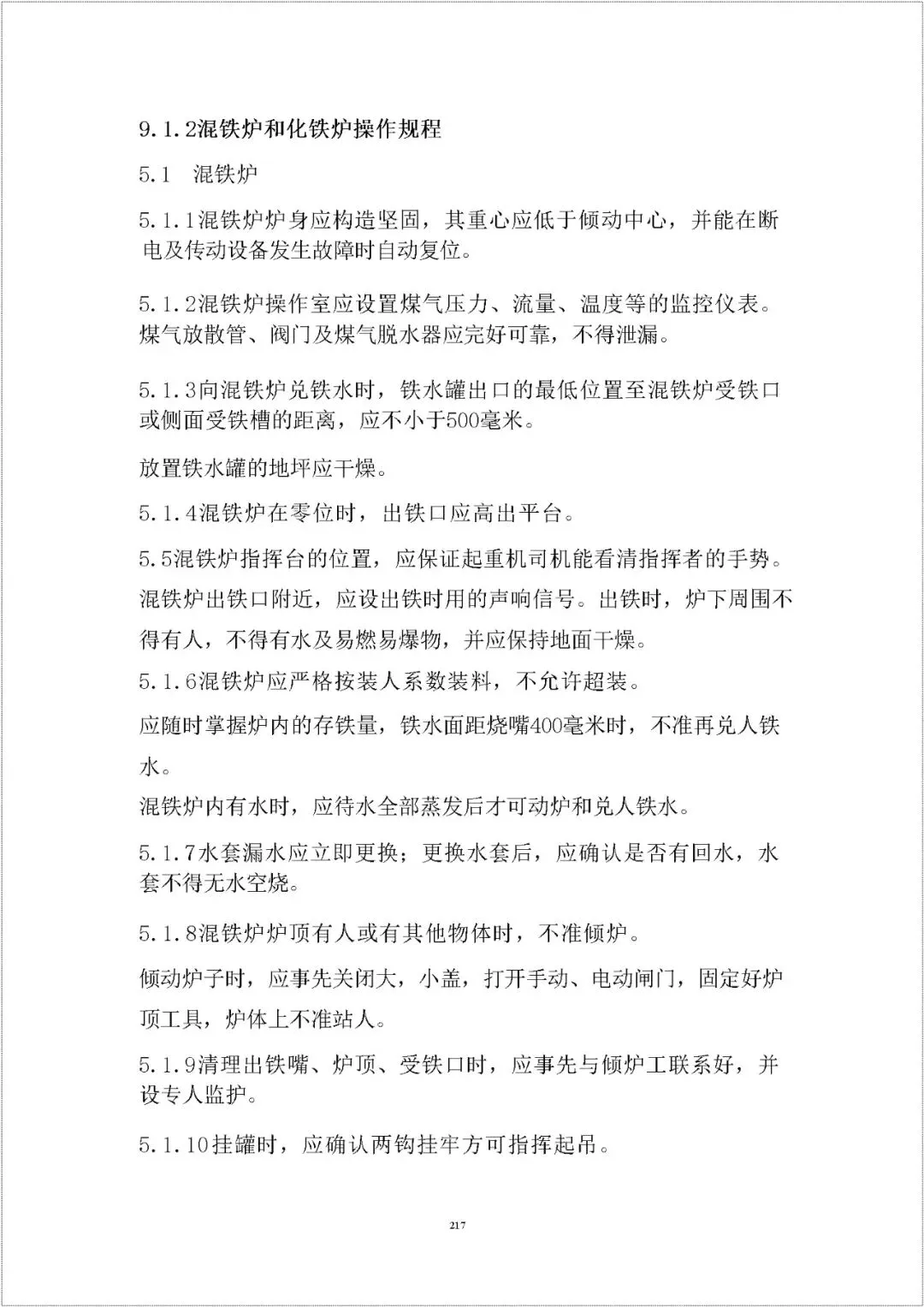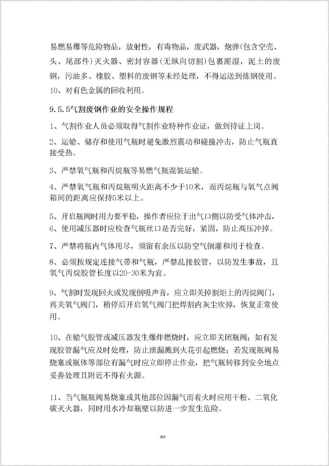 8.4 三违管理制度 2008.4.1 附表1:三违人员记录 2058.5 危险作业风险分析及控制措施 207第 9 章 炼钢厂安全生产规程 2169.1 炼钢厂房安全操作规程 2169.1.1 原材料处置规程 2169.1.2 混铁炉和化铁炉操作规程 2179.1.3 铁水预处理规程 2199.1.4 熔炼操作规程 2199.1.5 炉外精炼规程 2259.1.6 浇注规程 2279.1.7 铁水罐、钢水罐 中间罐和渣罐规程 2329.1.8 烟气净化、汽化冷却规程 2339.1.9 起重与运输规程 2399.1.10 动力管线规程 2469.1.11 炉子检修规程 2529.1.12 工业卫生规程 2569.2 转炉车间安全操作规程 2579.2.1 叉车安全操作规程 2579.2.2 吹氩安全操作规程 2589.2.3 废钢安全操作规程 2609.2.4 合金库安全操作规程 2609.2.5 混铁炉安全操作规程 2619.2.6 炉前工安全操作规程 2639.2.7 转炉煤气回收安全操作规程 2659.2.8 炉下清渣工安全操作规程 2669.2.9 散状料上料安全操作规程 2669.2.10 修包工安全操作规程 2679.2.11 转炉行车工安全操作规程 2689.3 连铸车间安全操作规程 2719.3.1 P3岗位操作规程 2719.3.2 P4岗位操作规程 2759.3.3 P9 岗位操作规程 2769.3.4 主控配水岗位操作规程 2789.3.5 中间包修砌操作规程 2799.3.6 连铸行车工安全操作规程 2819.3.7 连铸丙烷站安全操作规程 2839.4 炼钢厂运转车间安全操作规程 2859.4.1 转炉 OG 除尘安全操作规程 2859.4.2 转炉汽化安全操作规程 2889.4.3 二次除尘工岗位安全操作规程 2899.4.4 炼钢厂自用煤气的安全规定 2909.4.5 连铸水泵安全操作规程 2929.4.6 循环水泵安全操作规程 2939.4.7 污泥处理安全操作规程 293