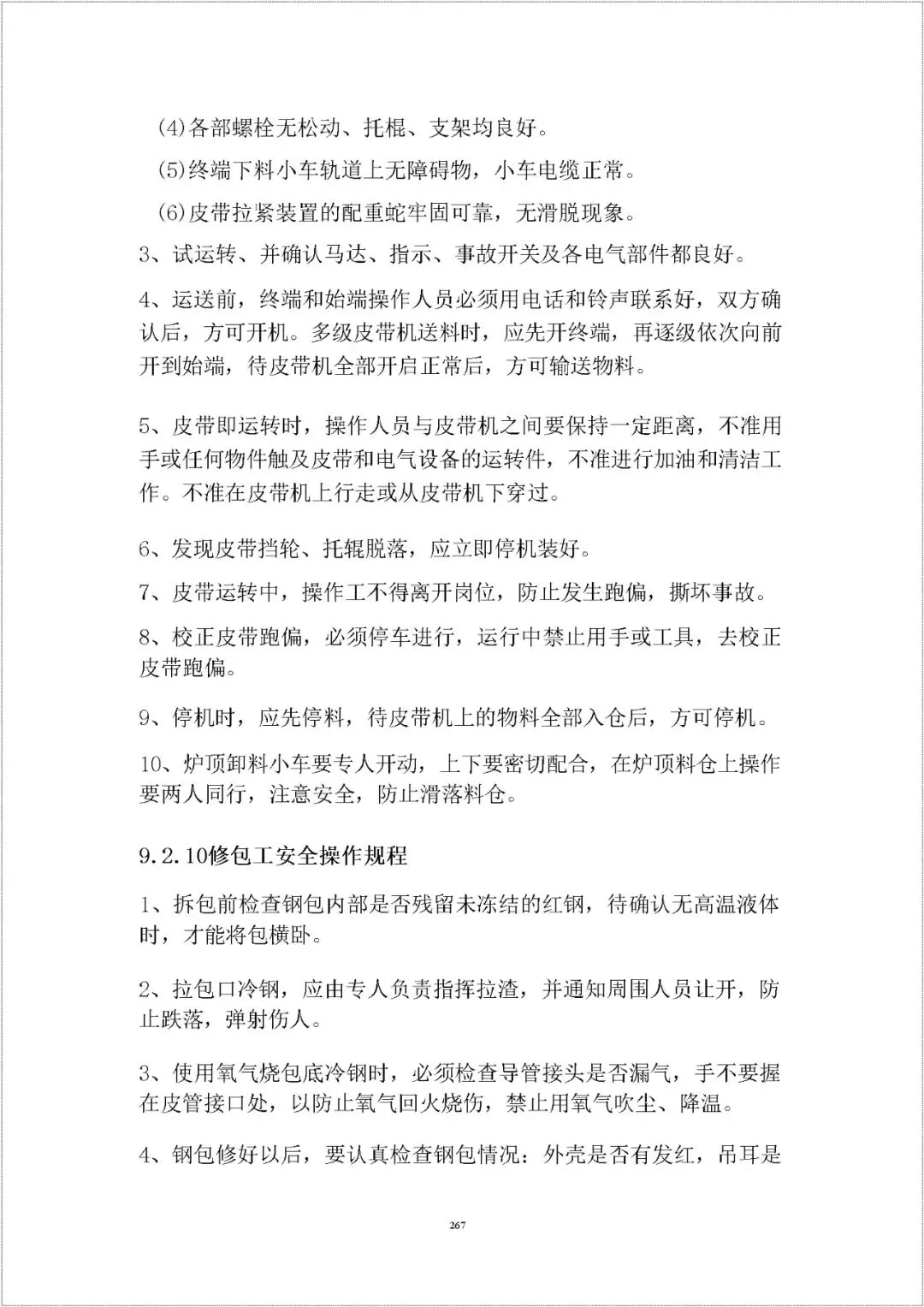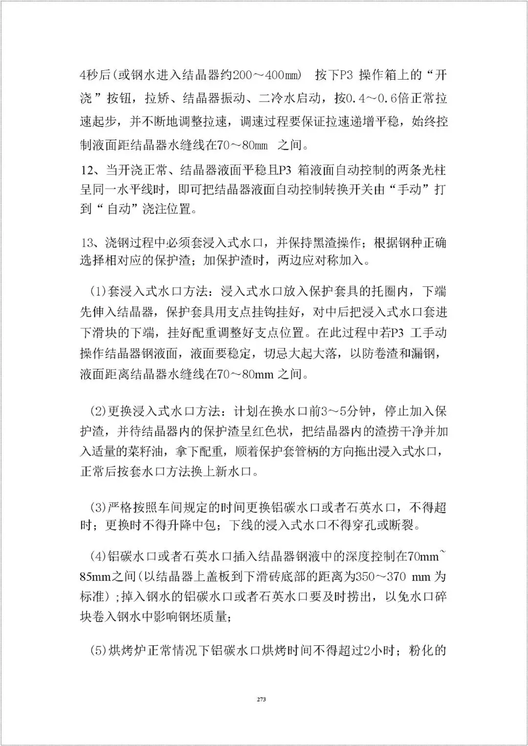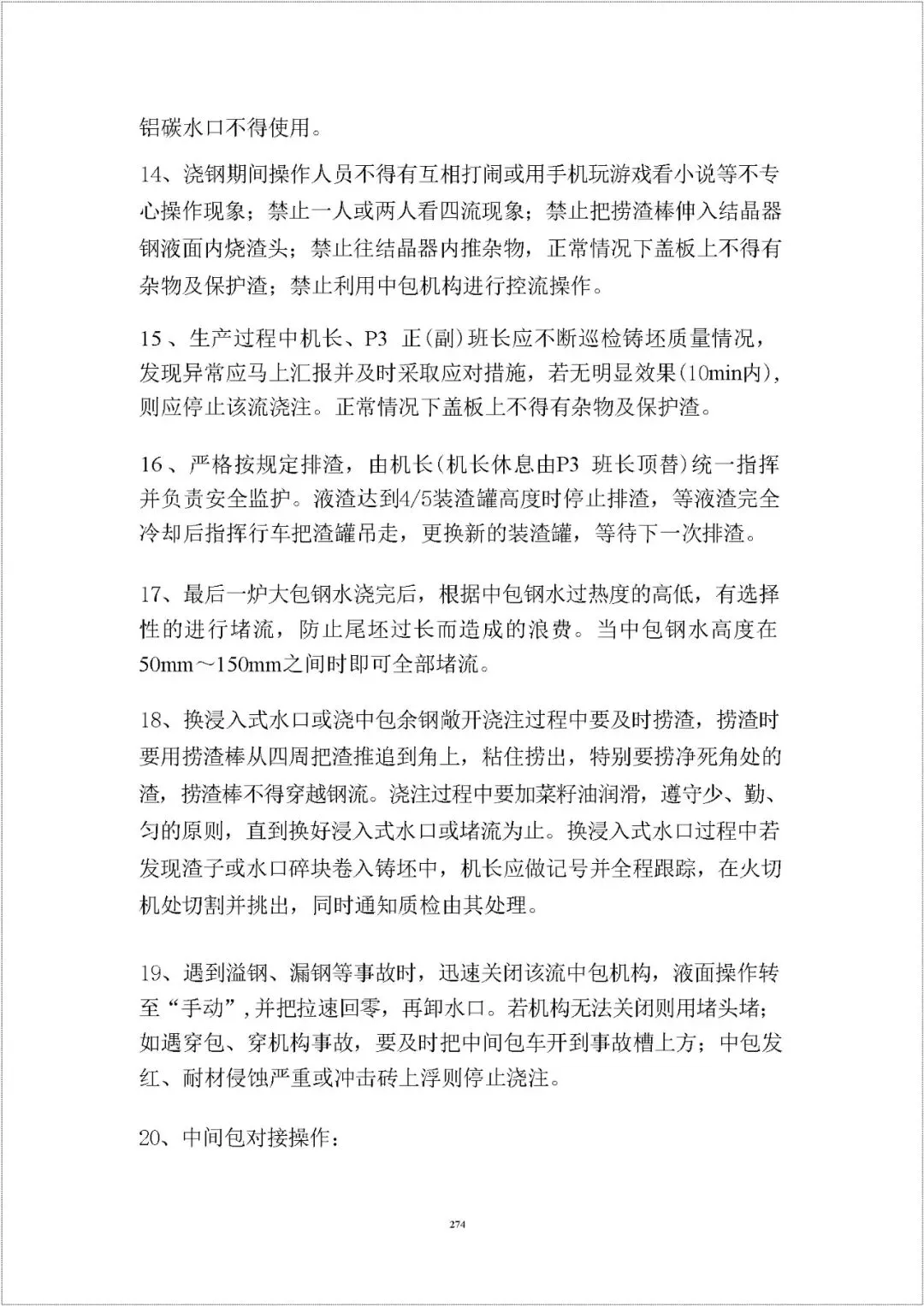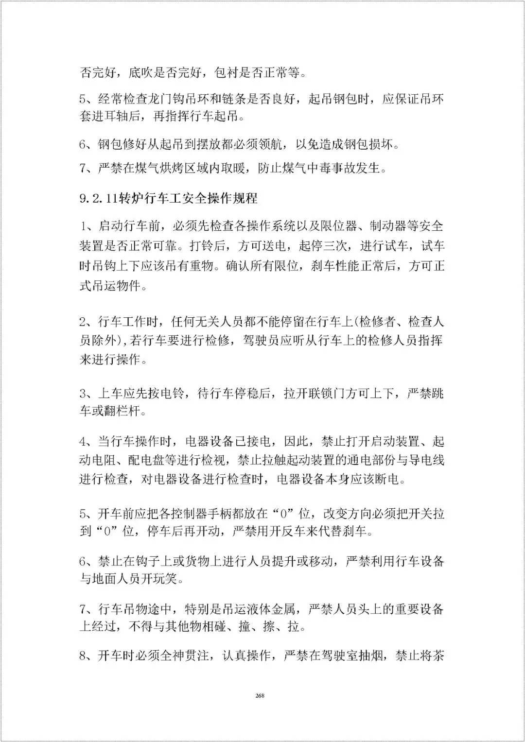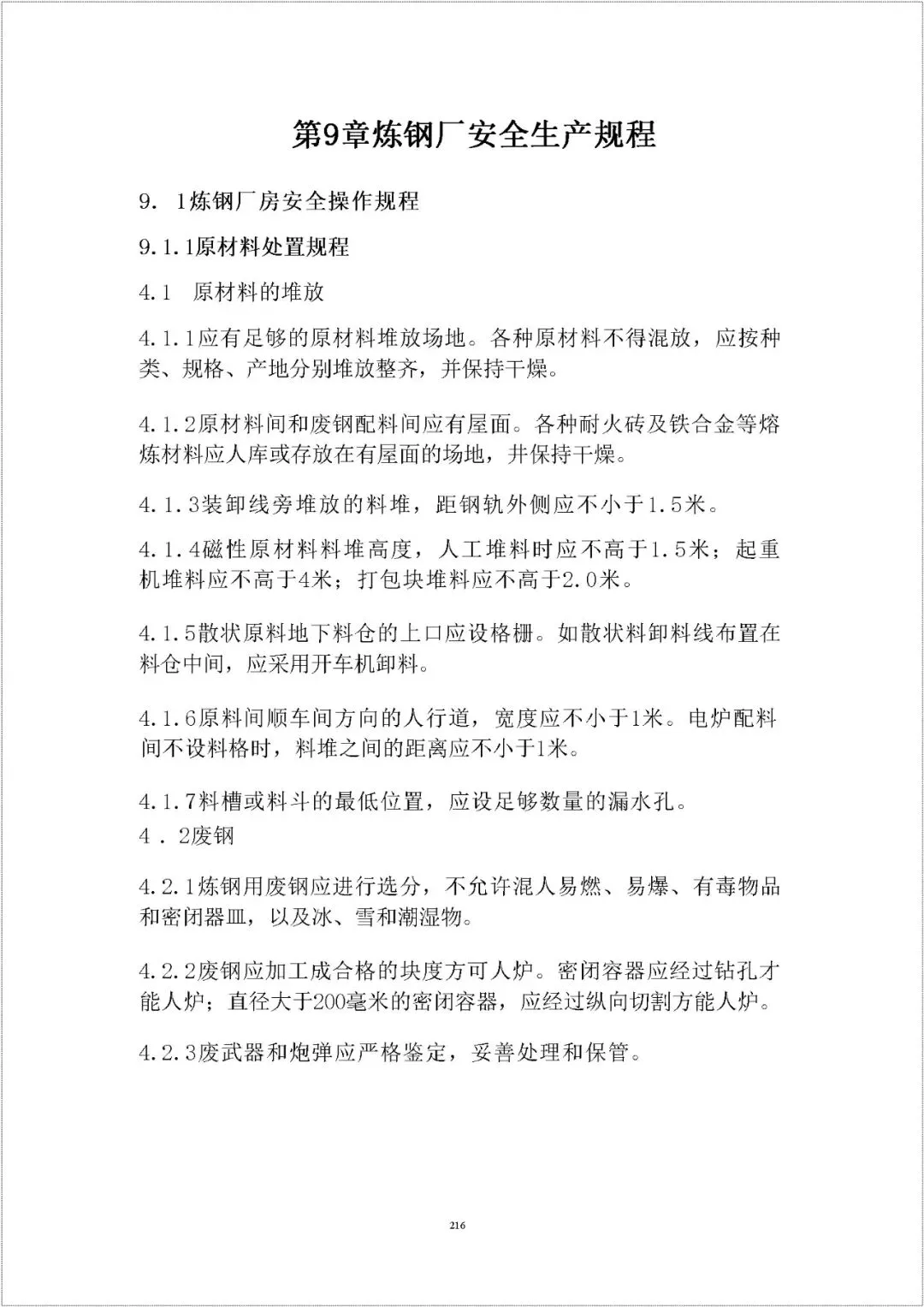 8.4 三违管理制度 2008.4.1 附表1:三违人员记录 2058.5 危险作业风险分析及控制措施 207第 9 章 炼钢厂安全生产规程 2169.1 炼钢厂房安全操作规程 2169.1.1 原材料处置规程 2169.1.2 混铁炉和化铁炉操作规程 2179.1.3 铁水预处理规程 2199.1.4 熔炼操作规程 2199.1.5 炉外精炼规程 2259.1.6 浇注规程 2279.1.7 铁水罐、钢水罐 中间罐和渣罐规程 2329.1.8 烟气净化、汽化冷却规程 2339.1.9 起重与运输规程 2399.1.10 动力管线规程 2469.1.11 炉子检修规程 2529.1.12 工业卫生规程 2569.2 转炉车间安全操作规程 2579.2.1 叉车安全操作规程 2579.2.2 吹氩安全操作规程 2589.2.3 废钢安全操作规程 2609.2.4 合金库安全操作规程 2609.2.5 混铁炉安全操作规程 2619.2.6 炉前工安全操作规程 2639.2.7 转炉煤气回收安全操作规程 2659.2.8 炉下清渣工安全操作规程 2669.2.9 散状料上料安全操作规程 2669.2.10 修包工安全操作规程 2679.2.11 转炉行车工安全操作规程 2689.3 连铸车间安全操作规程 2719.3.1 P3岗位操作规程 2719.3.2 P4岗位操作规程 2759.3.3 P9 岗位操作规程 2769.3.4 主控配水岗位操作规程 2789.3.5 中间包修砌操作规程 2799.3.6 连铸行车工安全操作规程 2819.3.7 连铸丙烷站安全操作规程 2839.4 炼钢厂运转车间安全操作规程 2859.4.1 转炉 OG 除尘安全操作规程 2859.4.2 转炉汽化安全操作规程 2889.4.3 二次除尘工岗位安全操作规程 2899.4.4 炼钢厂自用煤气的安全规定 2909.4.5 连铸水泵安全操作规程 2929.4.6 循环水泵安全操作规程 2939.4.7 污泥处理安全操作规程 293