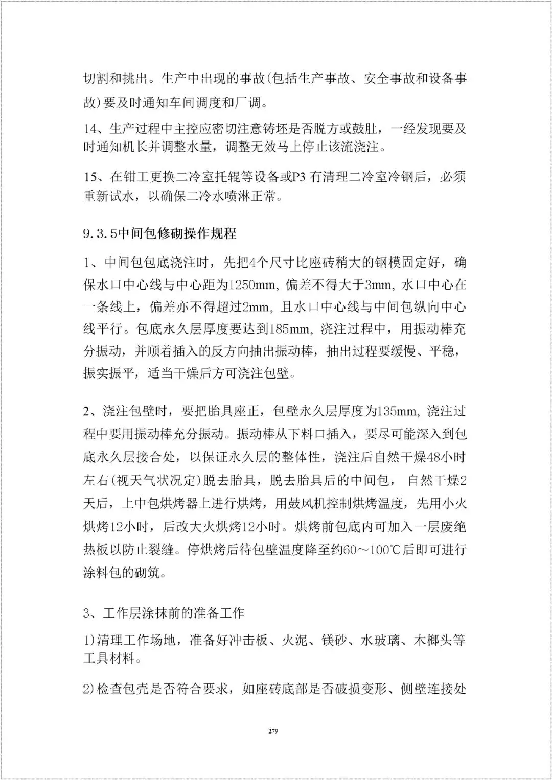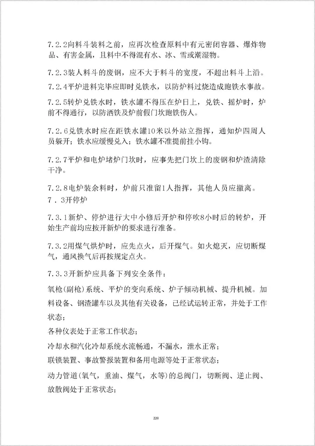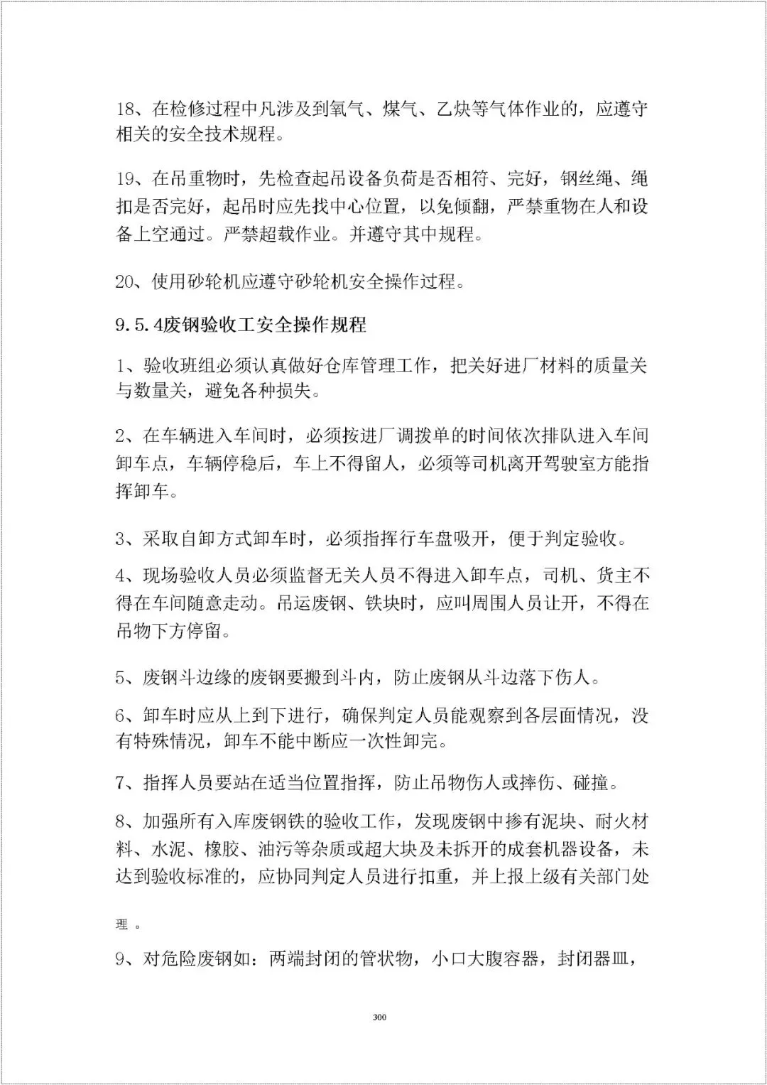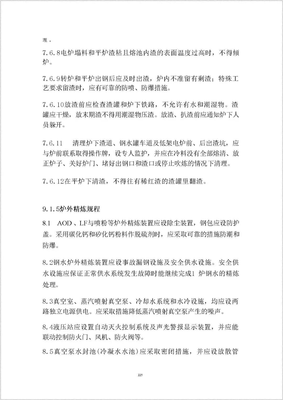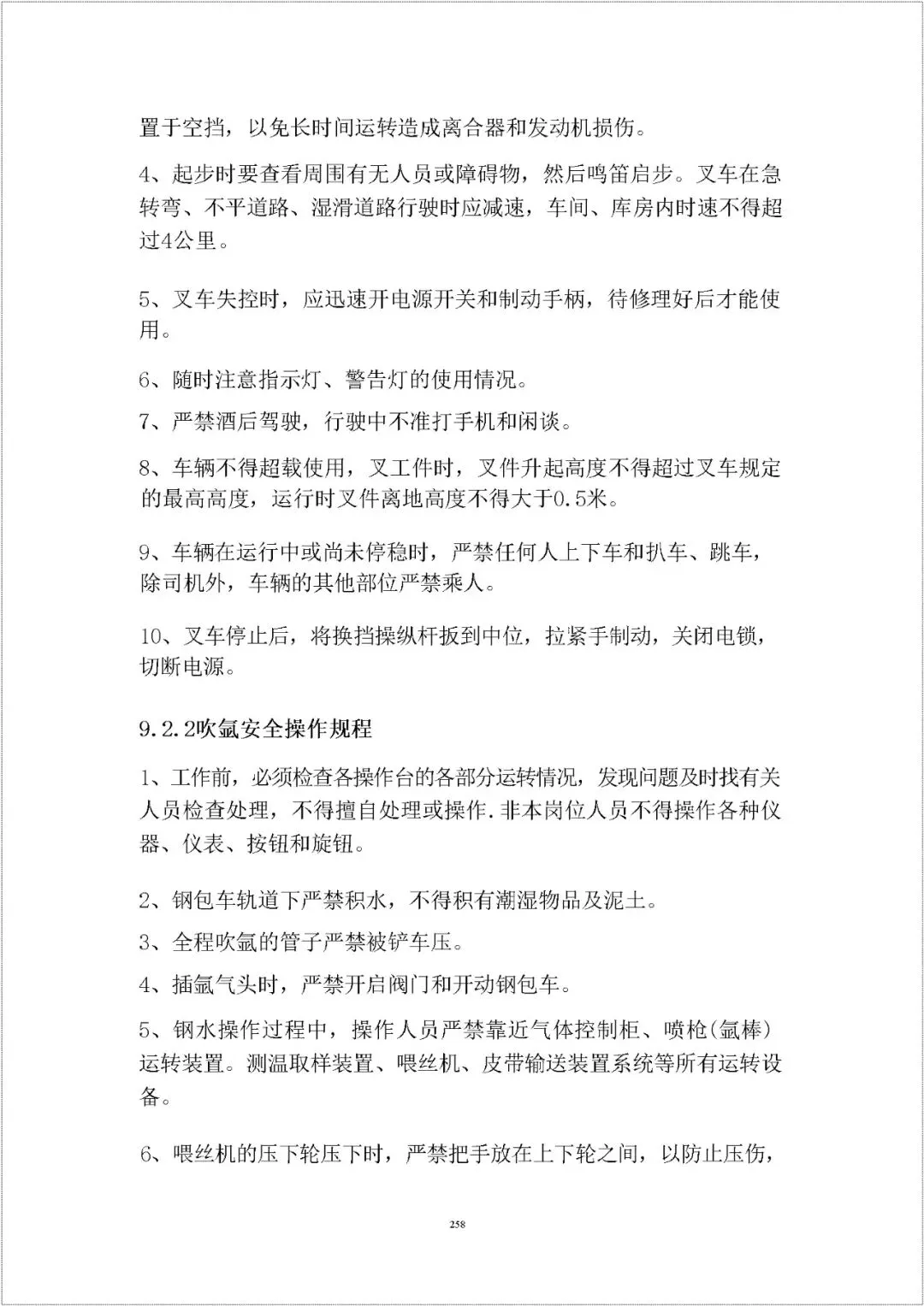 8.4 三违管理制度 2008.4.1 附表1:三违人员记录 2058.5 危险作业风险分析及控制措施 207第 9 章 炼钢厂安全生产规程 2169.1 炼钢厂房安全操作规程 2169.1.1 原材料处置规程 2169.1.2 混铁炉和化铁炉操作规程 2179.1.3 铁水预处理规程 2199.1.4 熔炼操作规程 2199.1.5 炉外精炼规程 2259.1.6 浇注规程 2279.1.7 铁水罐、钢水罐 中间罐和渣罐规程 2329.1.8 烟气净化、汽化冷却规程 2339.1.9 起重与运输规程 2399.1.10 动力管线规程 2469.1.11 炉子检修规程 2529.1.12 工业卫生规程 2569.2 转炉车间安全操作规程 2579.2.1 叉车安全操作规程 2579.2.2 吹氩安全操作规程 2589.2.3 废钢安全操作规程 2609.2.4 合金库安全操作规程 2609.2.5 混铁炉安全操作规程 2619.2.6 炉前工安全操作规程 2639.2.7 转炉煤气回收安全操作规程 2659.2.8 炉下清渣工安全操作规程 2669.2.9 散状料上料安全操作规程 2669.2.10 修包工安全操作规程 2679.2.11 转炉行车工安全操作规程 2689.3 连铸车间安全操作规程 2719.3.1 P3岗位操作规程 2719.3.2 P4岗位操作规程 2759.3.3 P9 岗位操作规程 2769.3.4 主控配水岗位操作规程 2789.3.5 中间包修砌操作规程 2799.3.6 连铸行车工安全操作规程 2819.3.7 连铸丙烷站安全操作规程 2839.4 炼钢厂运转车间安全操作规程 2859.4.1 转炉 OG 除尘安全操作规程 2859.4.2 转炉汽化安全操作规程 2889.4.3 二次除尘工岗位安全操作规程 2899.4.4 炼钢厂自用煤气的安全规定 2909.4.5 连铸水泵安全操作规程 2929.4.6 循环水泵安全操作规程 2939.4.7 污泥处理安全操作规程 293