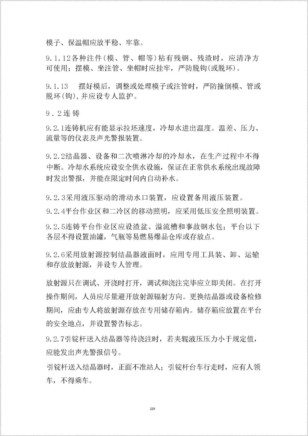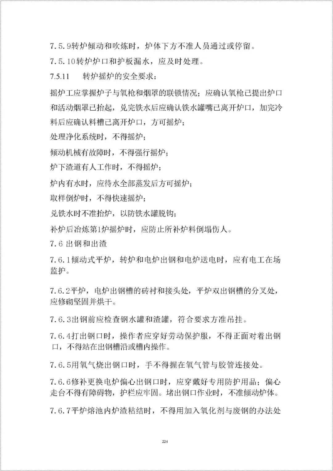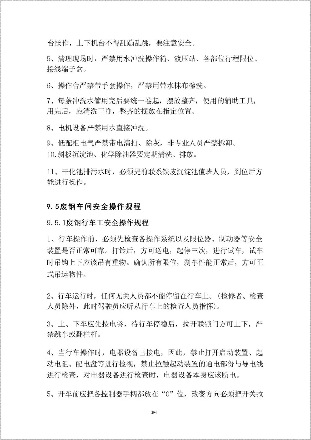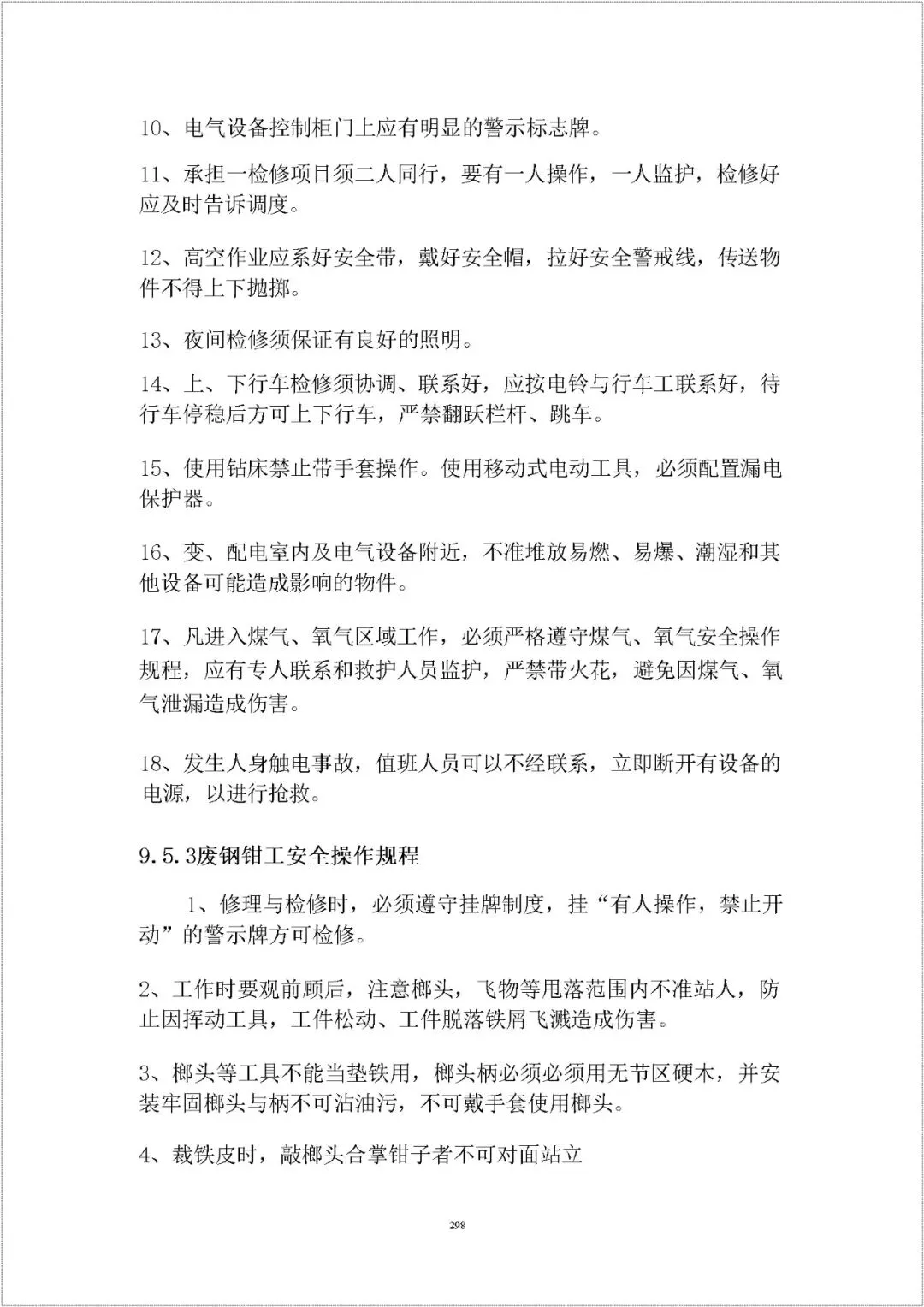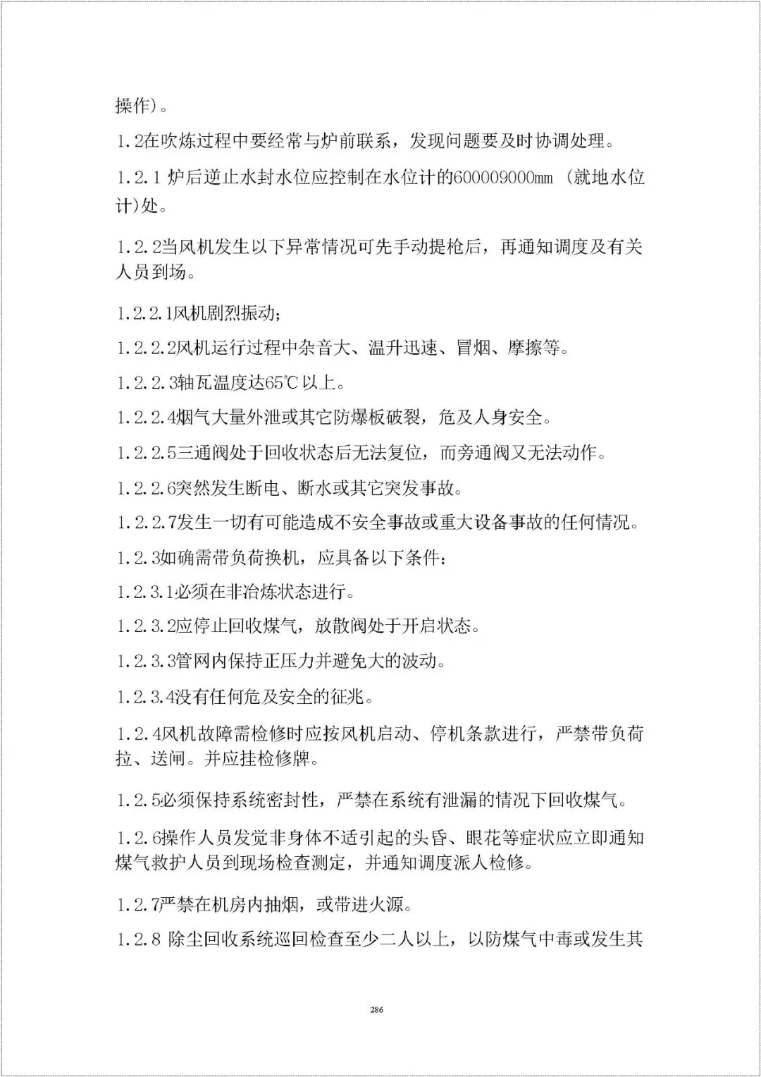 8.4 三违管理制度 2008.4.1 附表1:三违人员记录 2058.5 危险作业风险分析及控制措施 207第 9 章 炼钢厂安全生产规程 2169.1 炼钢厂房安全操作规程 2169.1.1 原材料处置规程 2169.1.2 混铁炉和化铁炉操作规程 2179.1.3 铁水预处理规程 2199.1.4 熔炼操作规程 2199.1.5 炉外精炼规程 2259.1.6 浇注规程 2279.1.7 铁水罐、钢水罐 中间罐和渣罐规程 2329.1.8 烟气净化、汽化冷却规程 2339.1.9 起重与运输规程 2399.1.10 动力管线规程 2469.1.11 炉子检修规程 2529.1.12 工业卫生规程 2569.2 转炉车间安全操作规程 2579.2.1 叉车安全操作规程 2579.2.2 吹氩安全操作规程 2589.2.3 废钢安全操作规程 2609.2.4 合金库安全操作规程 2609.2.5 混铁炉安全操作规程 2619.2.6 炉前工安全操作规程 2639.2.7 转炉煤气回收安全操作规程 2659.2.8 炉下清渣工安全操作规程 2669.2.9 散状料上料安全操作规程 2669.2.10 修包工安全操作规程 2679.2.11 转炉行车工安全操作规程 2689.3 连铸车间安全操作规程 2719.3.1 P3岗位操作规程 2719.3.2 P4岗位操作规程 2759.3.3 P9 岗位操作规程 2769.3.4 主控配水岗位操作规程 2789.3.5 中间包修砌操作规程 2799.3.6 连铸行车工安全操作规程 2819.3.7 连铸丙烷站安全操作规程 2839.4 炼钢厂运转车间安全操作规程 2859.4.1 转炉 OG 除尘安全操作规程 2859.4.2 转炉汽化安全操作规程 2889.4.3 二次除尘工岗位安全操作规程 2899.4.4 炼钢厂自用煤气的安全规定 2909.4.5 连铸水泵安全操作规程 2929.4.6 循环水泵安全操作规程 2939.4.7 污泥处理安全操作规程 293
