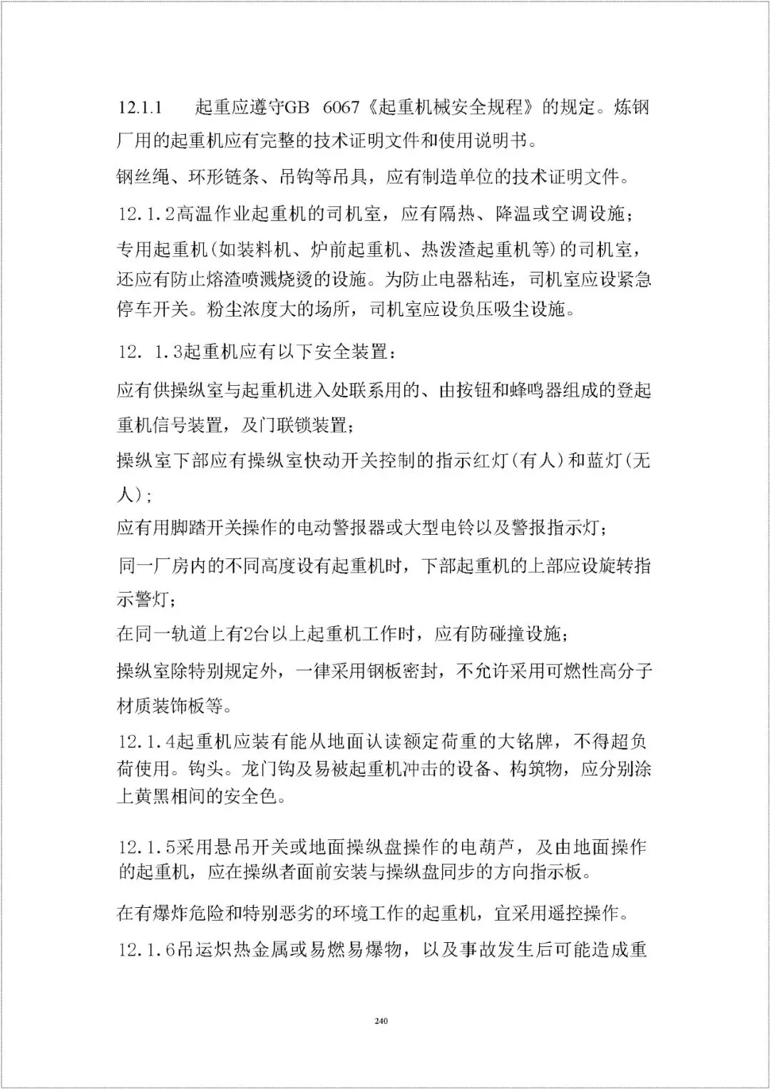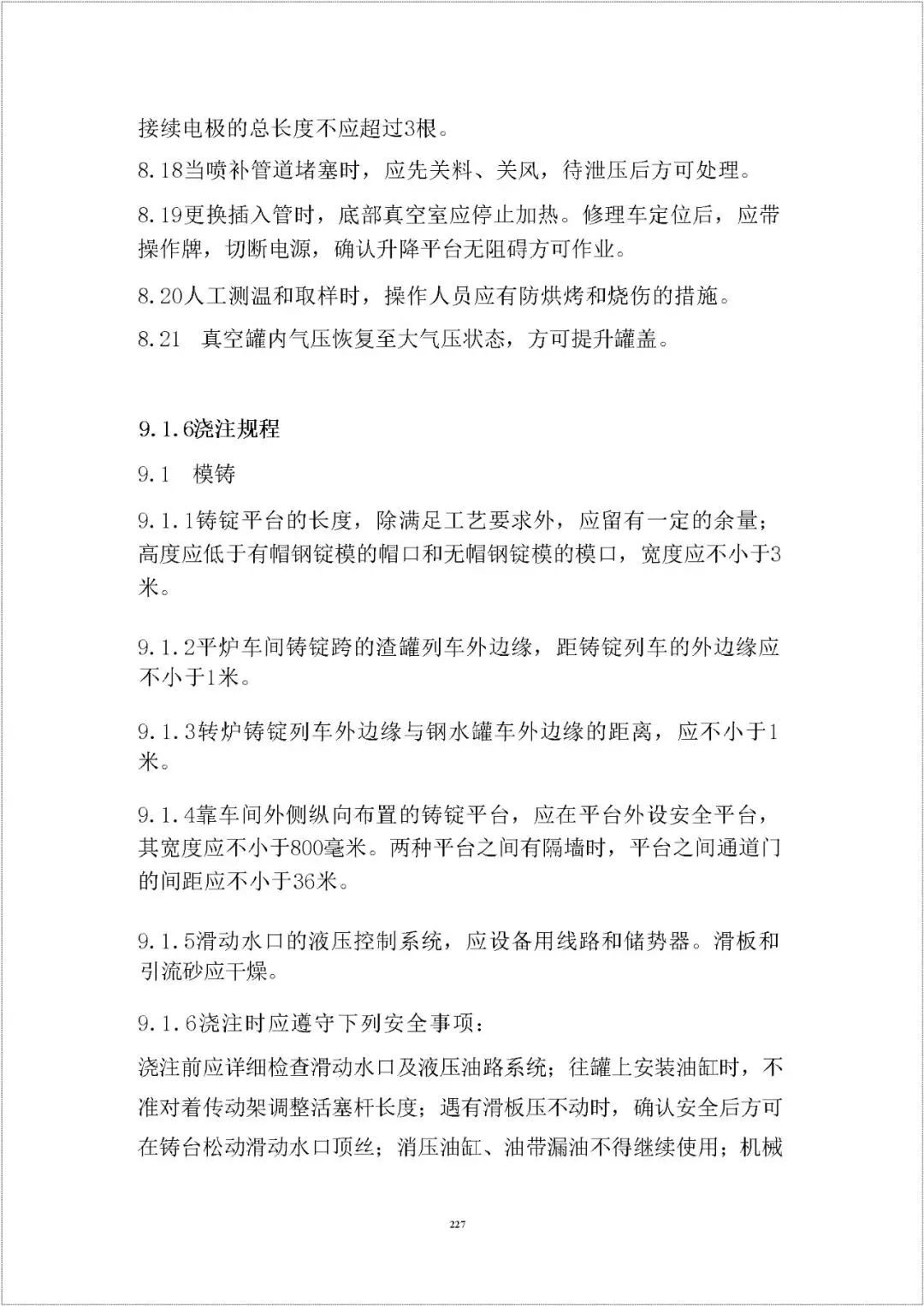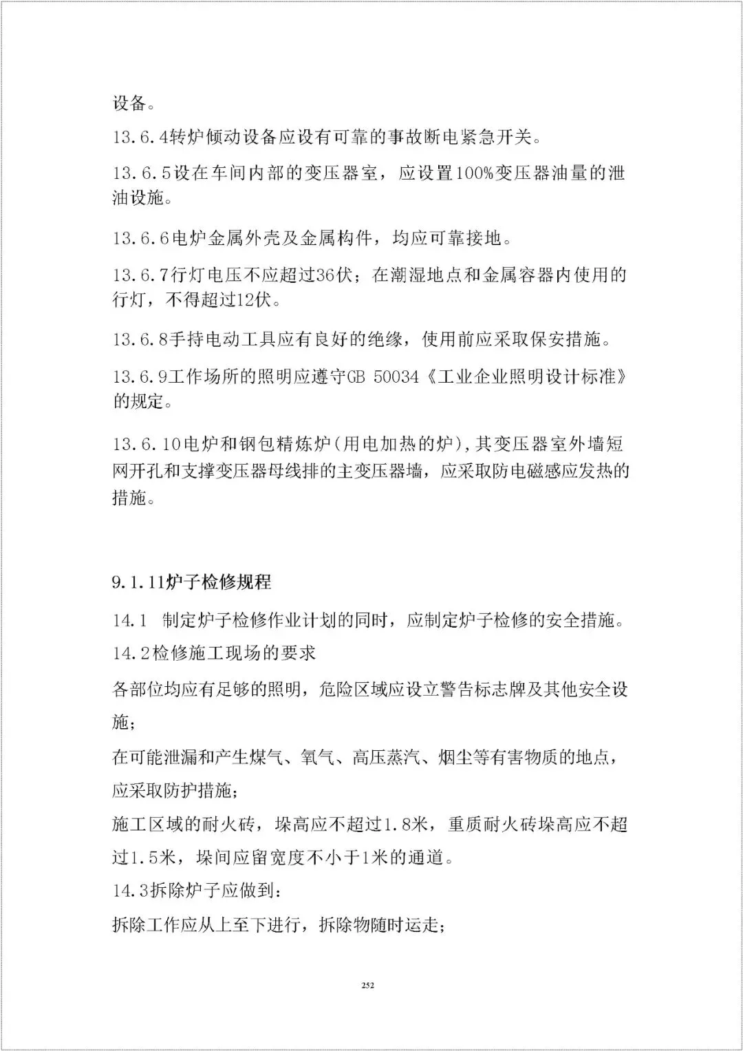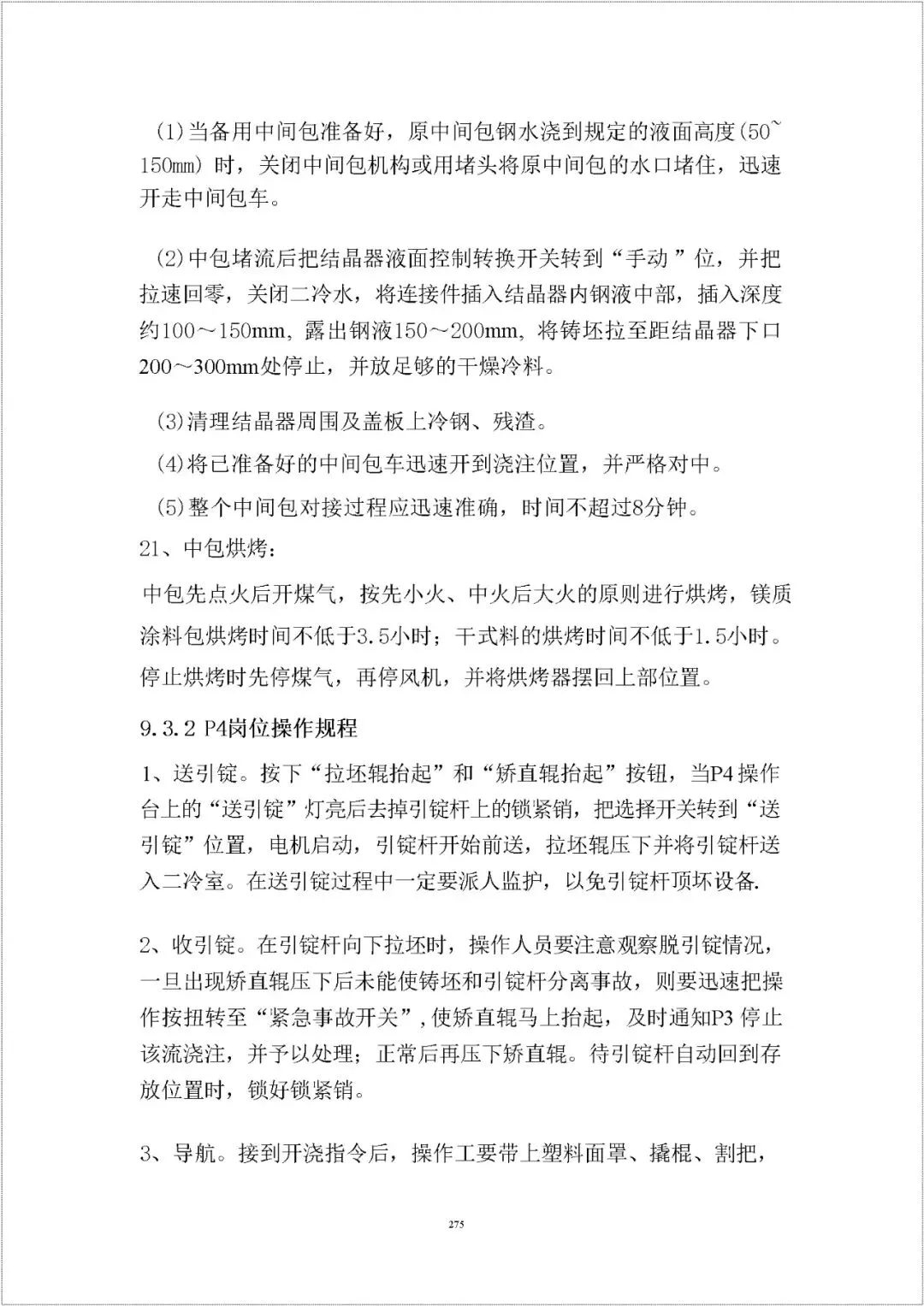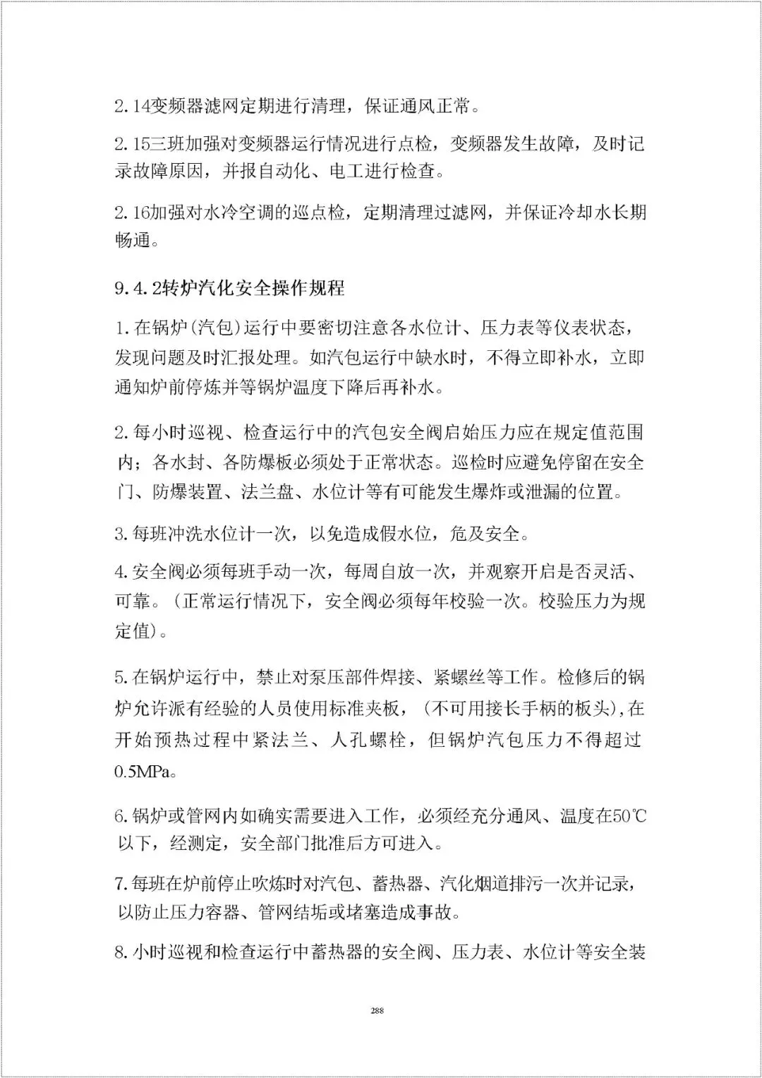 8.4 三违管理制度 2008.4.1 附表1:三违人员记录 2058.5 危险作业风险分析及控制措施 207第 9 章 炼钢厂安全生产规程 2169.1 炼钢厂房安全操作规程 2169.1.1 原材料处置规程 2169.1.2 混铁炉和化铁炉操作规程 2179.1.3 铁水预处理规程 2199.1.4 熔炼操作规程 2199.1.5 炉外精炼规程 2259.1.6 浇注规程 2279.1.7 铁水罐、钢水罐 中间罐和渣罐规程 2329.1.8 烟气净化、汽化冷却规程 2339.1.9 起重与运输规程 2399.1.10 动力管线规程 2469.1.11 炉子检修规程 2529.1.12 工业卫生规程 2569.2 转炉车间安全操作规程 2579.2.1 叉车安全操作规程 2579.2.2 吹氩安全操作规程 2589.2.3 废钢安全操作规程 2609.2.4 合金库安全操作规程 2609.2.5 混铁炉安全操作规程 2619.2.6 炉前工安全操作规程 2639.2.7 转炉煤气回收安全操作规程 2659.2.8 炉下清渣工安全操作规程 2669.2.9 散状料上料安全操作规程 2669.2.10 修包工安全操作规程 2679.2.11 转炉行车工安全操作规程 2689.3 连铸车间安全操作规程 2719.3.1 P3岗位操作规程 2719.3.2 P4岗位操作规程 2759.3.3 P9 岗位操作规程 2769.3.4 主控配水岗位操作规程 2789.3.5 中间包修砌操作规程 2799.3.6 连铸行车工安全操作规程 2819.3.7 连铸丙烷站安全操作规程 2839.4 炼钢厂运转车间安全操作规程 2859.4.1 转炉 OG 除尘安全操作规程 2859.4.2 转炉汽化安全操作规程 2889.4.3 二次除尘工岗位安全操作规程 2899.4.4 炼钢厂自用煤气的安全规定 2909.4.5 连铸水泵安全操作规程 2929.4.6 循环水泵安全操作规程 2939.4.7 污泥处理安全操作规程 293
