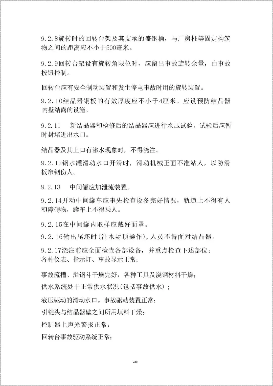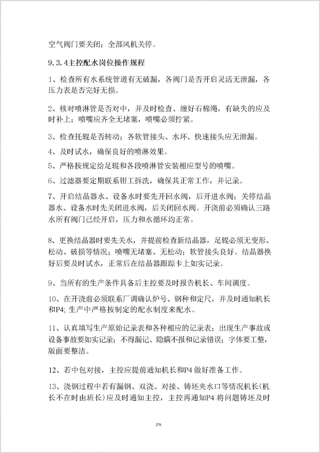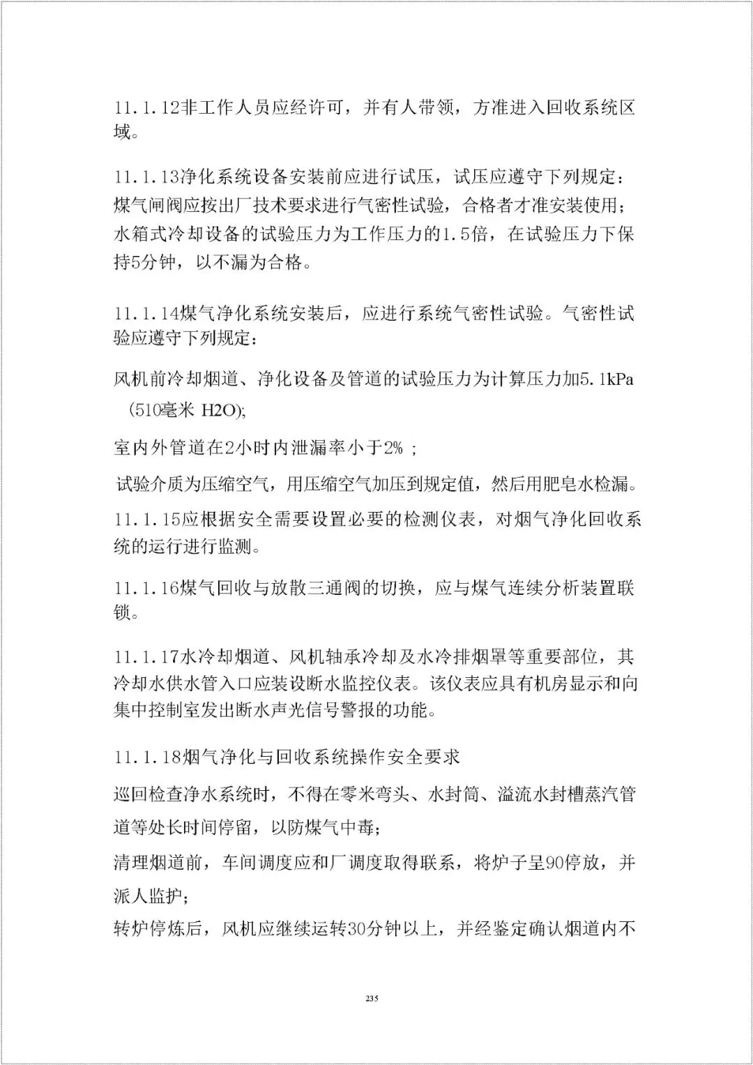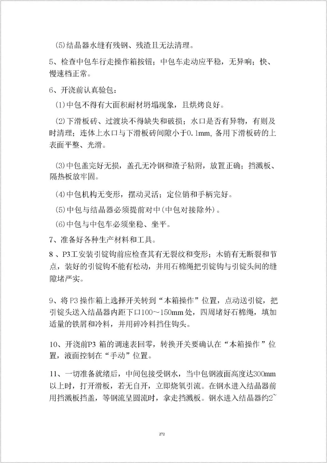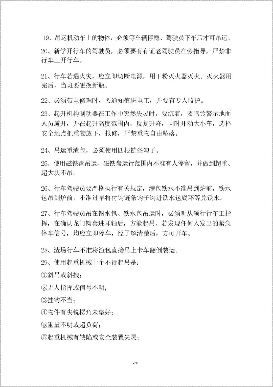 8.4 三违管理制度 2008.4.1 附表1:三违人员记录 2058.5 危险作业风险分析及控制措施 207第 9 章 炼钢厂安全生产规程 2169.1 炼钢厂房安全操作规程 2169.1.1 原材料处置规程 2169.1.2 混铁炉和化铁炉操作规程 2179.1.3 铁水预处理规程 2199.1.4 熔炼操作规程 2199.1.5 炉外精炼规程 2259.1.6 浇注规程 2279.1.7 铁水罐、钢水罐 中间罐和渣罐规程 2329.1.8 烟气净化、汽化冷却规程 2339.1.9 起重与运输规程 2399.1.10 动力管线规程 2469.1.11 炉子检修规程 2529.1.12 工业卫生规程 2569.2 转炉车间安全操作规程 2579.2.1 叉车安全操作规程 2579.2.2 吹氩安全操作规程 2589.2.3 废钢安全操作规程 2609.2.4 合金库安全操作规程 2609.2.5 混铁炉安全操作规程 2619.2.6 炉前工安全操作规程 2639.2.7 转炉煤气回收安全操作规程 2659.2.8 炉下清渣工安全操作规程 2669.2.9 散状料上料安全操作规程 2669.2.10 修包工安全操作规程 2679.2.11 转炉行车工安全操作规程 2689.3 连铸车间安全操作规程 2719.3.1 P3岗位操作规程 2719.3.2 P4岗位操作规程 2759.3.3 P9 岗位操作规程 2769.3.4 主控配水岗位操作规程 2789.3.5 中间包修砌操作规程 2799.3.6 连铸行车工安全操作规程 2819.3.7 连铸丙烷站安全操作规程 2839.4 炼钢厂运转车间安全操作规程 2859.4.1 转炉 OG 除尘安全操作规程 2859.4.2 转炉汽化安全操作规程 2889.4.3 二次除尘工岗位安全操作规程 2899.4.4 炼钢厂自用煤气的安全规定 2909.4.5 连铸水泵安全操作规程 2929.4.6 循环水泵安全操作规程 2939.4.7 污泥处理安全操作规程 293