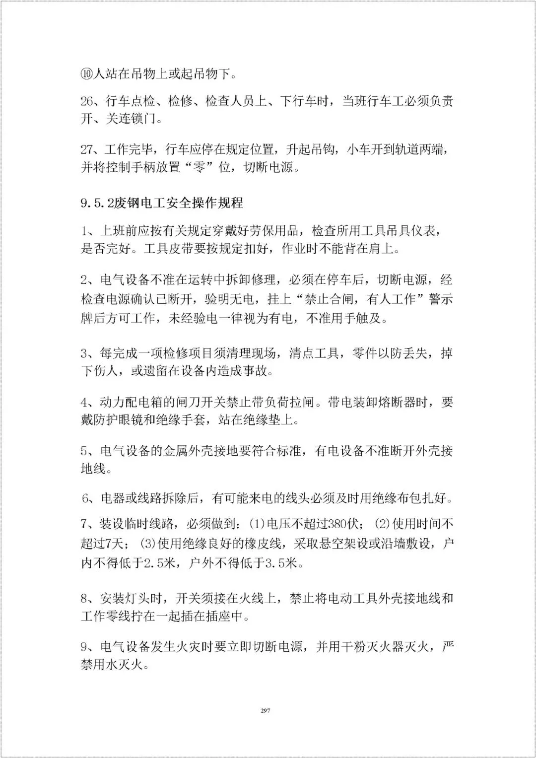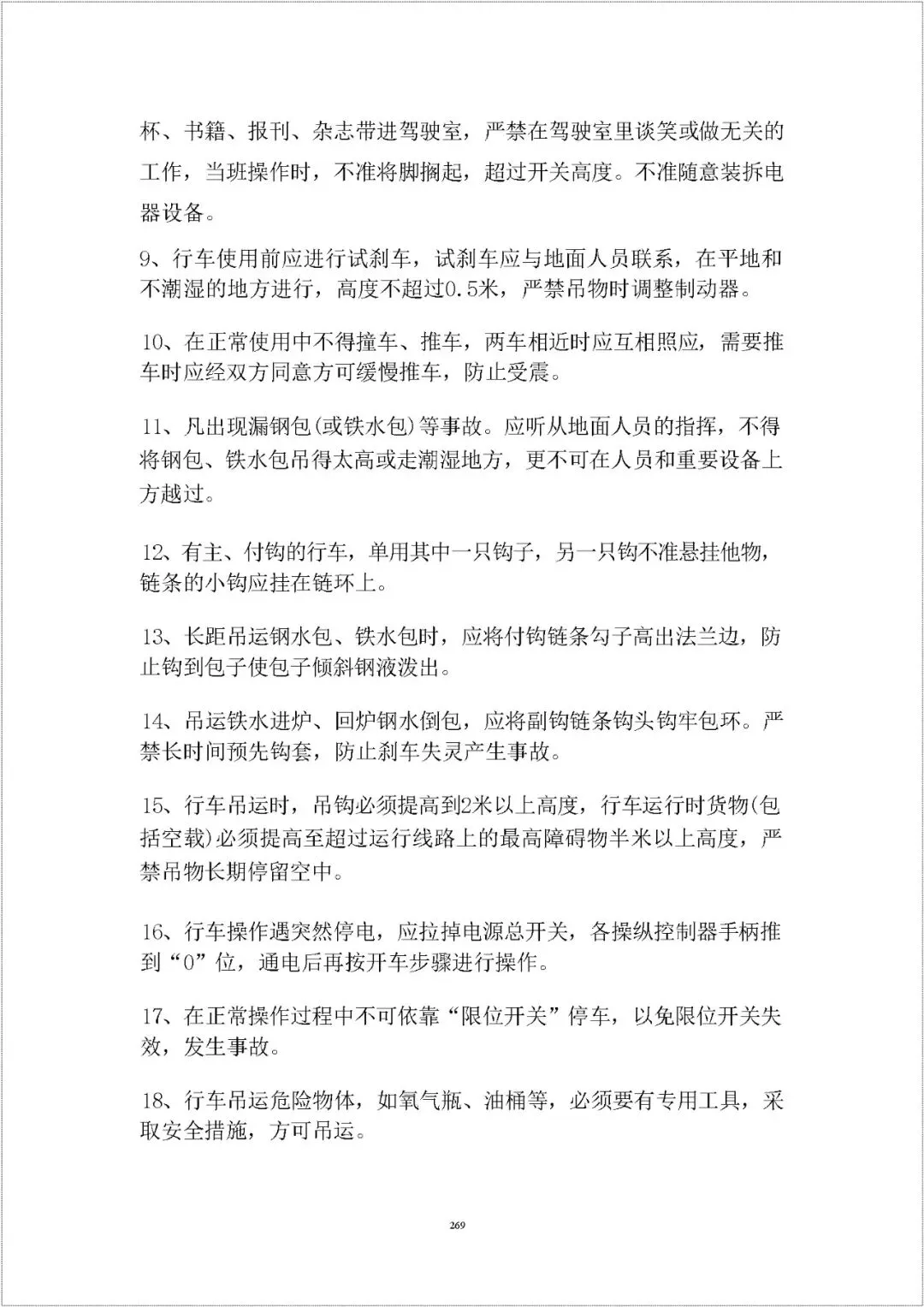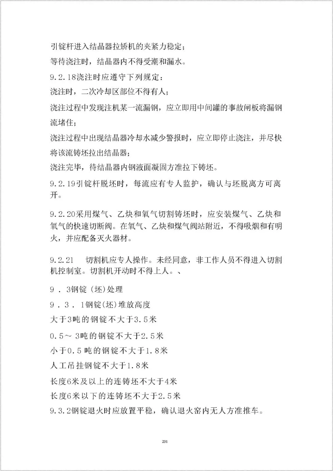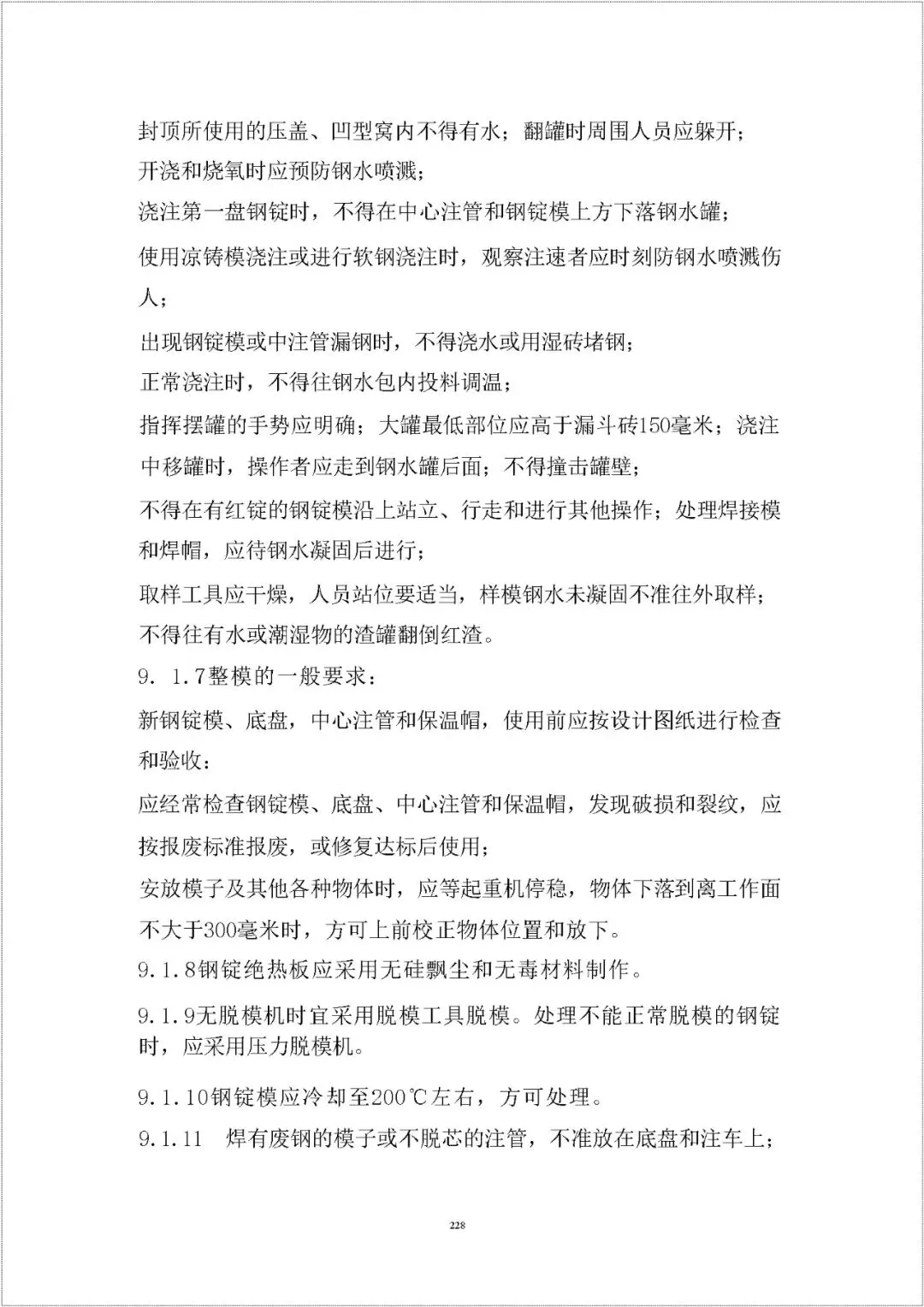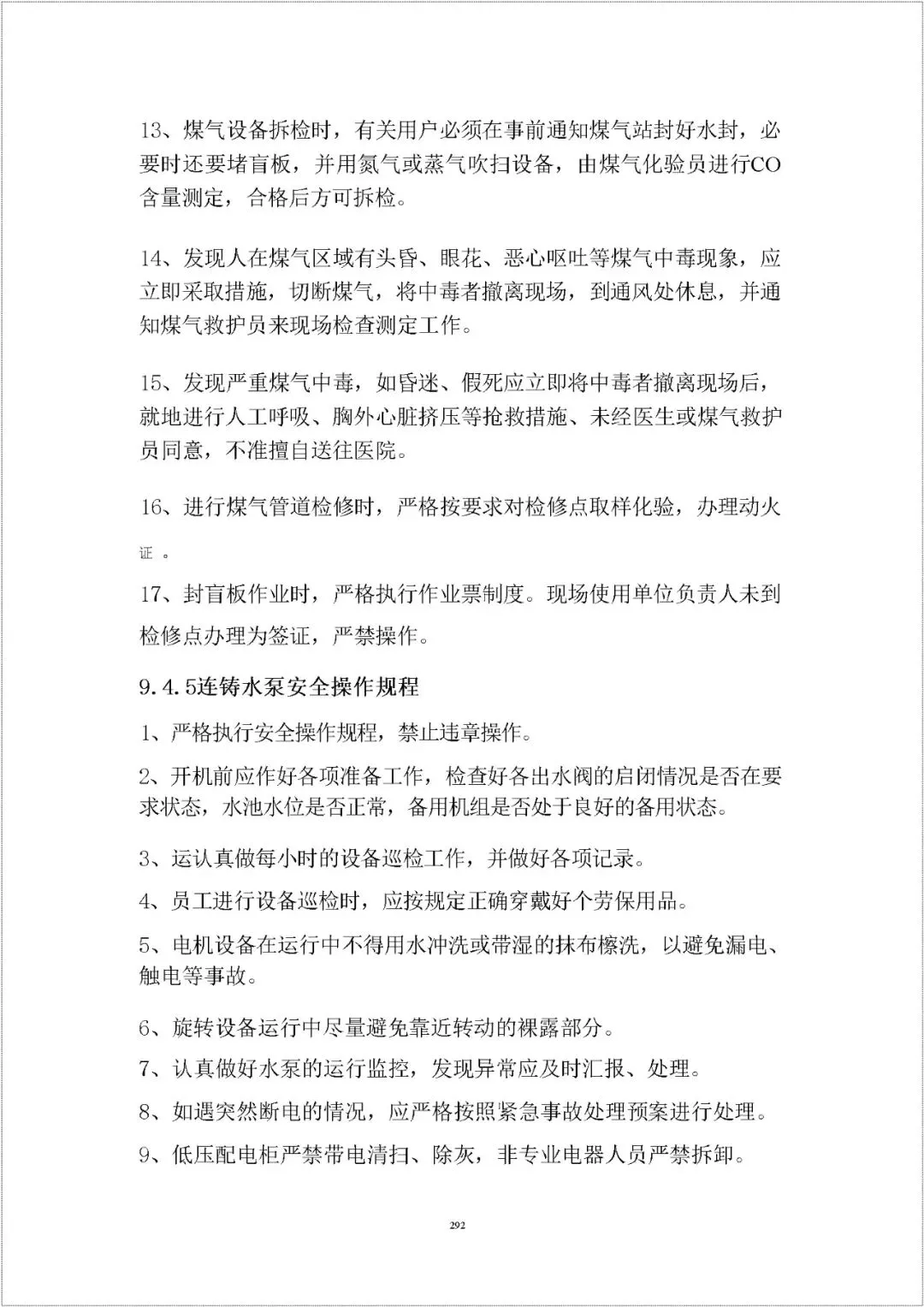 8.4 三违管理制度 2008.4.1 附表1:三违人员记录 2058.5 危险作业风险分析及控制措施 207第 9 章 炼钢厂安全生产规程 2169.1 炼钢厂房安全操作规程 2169.1.1 原材料处置规程 2169.1.2 混铁炉和化铁炉操作规程 2179.1.3 铁水预处理规程 2199.1.4 熔炼操作规程 2199.1.5 炉外精炼规程 2259.1.6 浇注规程 2279.1.7 铁水罐、钢水罐 中间罐和渣罐规程 2329.1.8 烟气净化、汽化冷却规程 2339.1.9 起重与运输规程 2399.1.10 动力管线规程 2469.1.11 炉子检修规程 2529.1.12 工业卫生规程 2569.2 转炉车间安全操作规程 2579.2.1 叉车安全操作规程 2579.2.2 吹氩安全操作规程 2589.2.3 废钢安全操作规程 2609.2.4 合金库安全操作规程 2609.2.5 混铁炉安全操作规程 2619.2.6 炉前工安全操作规程 2639.2.7 转炉煤气回收安全操作规程 2659.2.8 炉下清渣工安全操作规程 2669.2.9 散状料上料安全操作规程 2669.2.10 修包工安全操作规程 2679.2.11 转炉行车工安全操作规程 2689.3 连铸车间安全操作规程 2719.3.1 P3岗位操作规程 2719.3.2 P4岗位操作规程 2759.3.3 P9 岗位操作规程 2769.3.4 主控配水岗位操作规程 2789.3.5 中间包修砌操作规程 2799.3.6 连铸行车工安全操作规程 2819.3.7 连铸丙烷站安全操作规程 2839.4 炼钢厂运转车间安全操作规程 2859.4.1 转炉 OG 除尘安全操作规程 2859.4.2 转炉汽化安全操作规程 2889.4.3 二次除尘工岗位安全操作规程 2899.4.4 炼钢厂自用煤气的安全规定 2909.4.5 连铸水泵安全操作规程 2929.4.6 循环水泵安全操作规程 2939.4.7 污泥处理安全操作规程 293