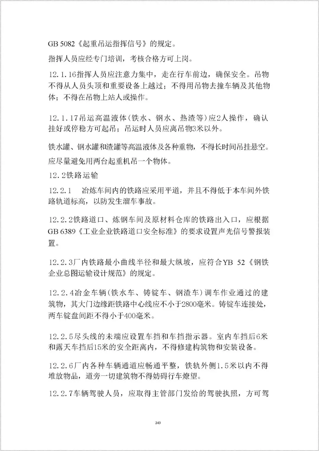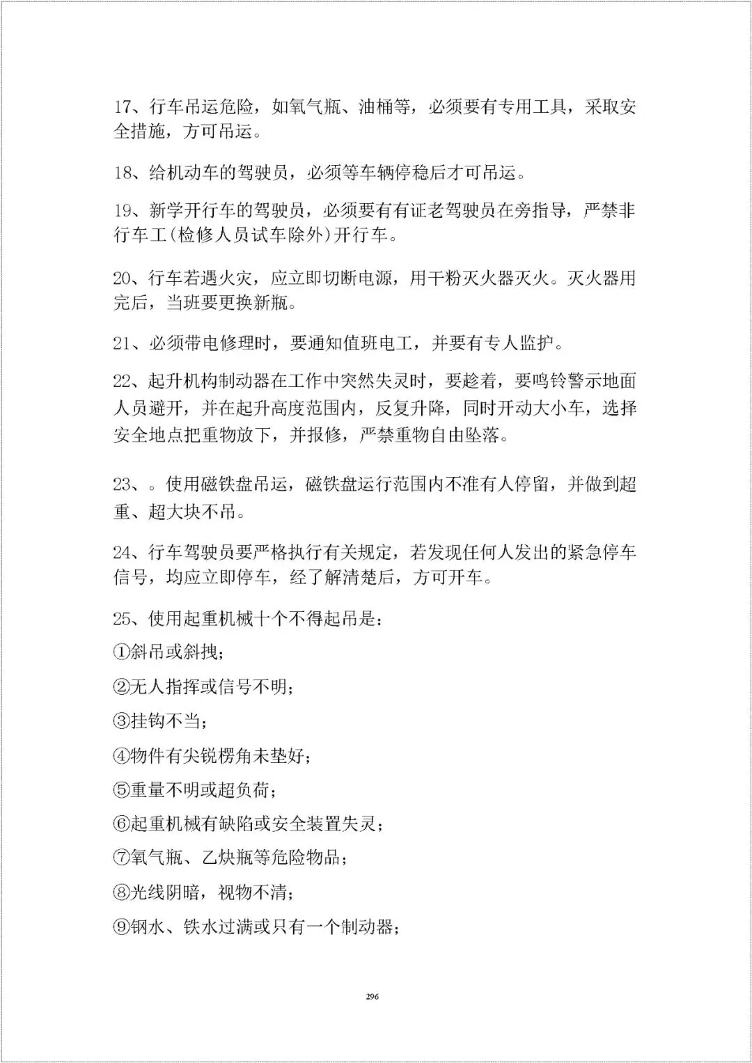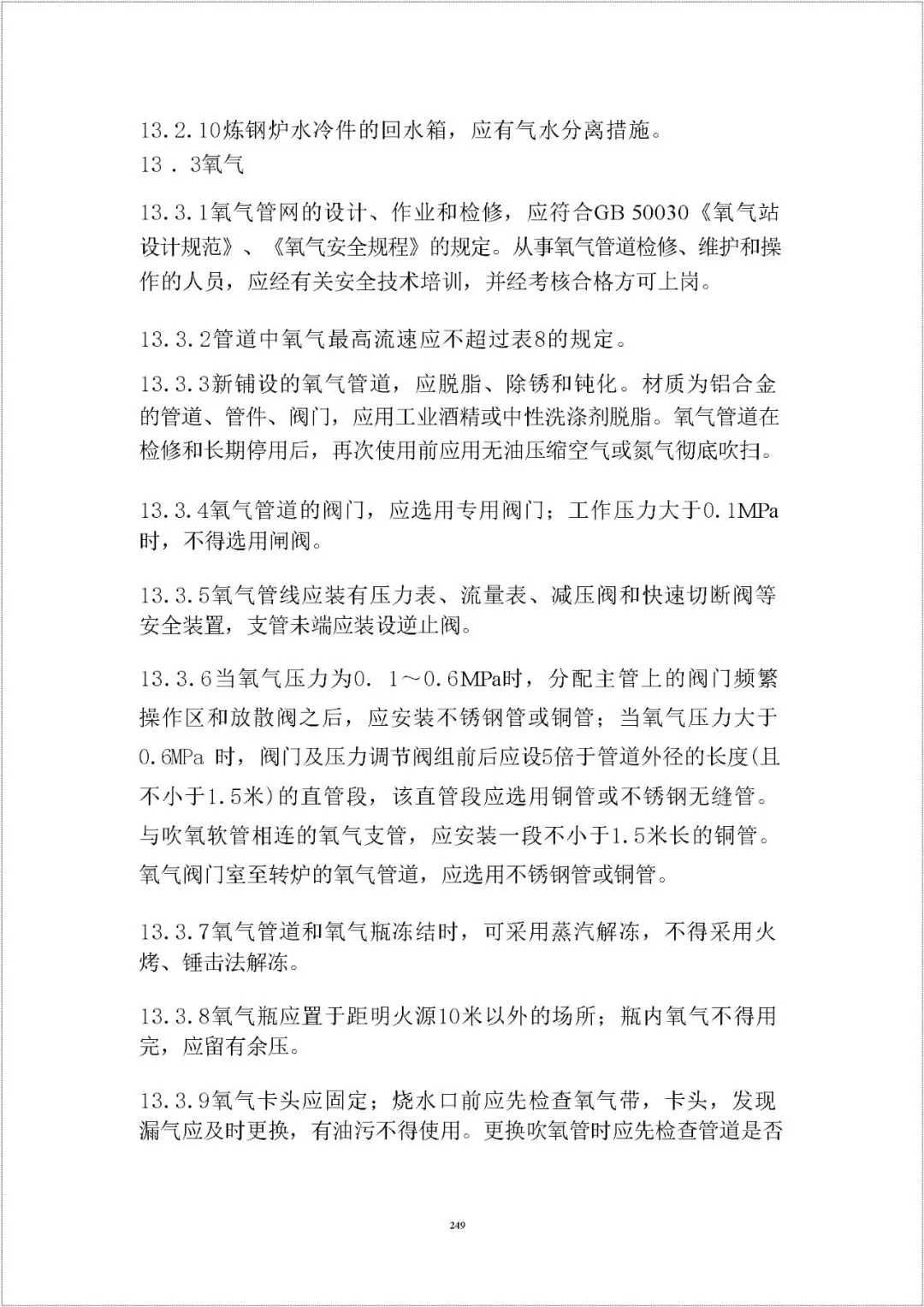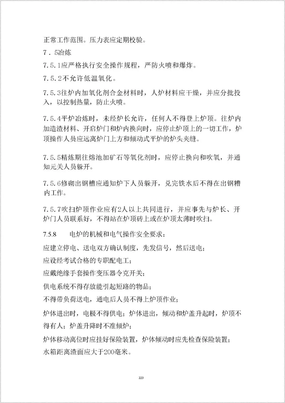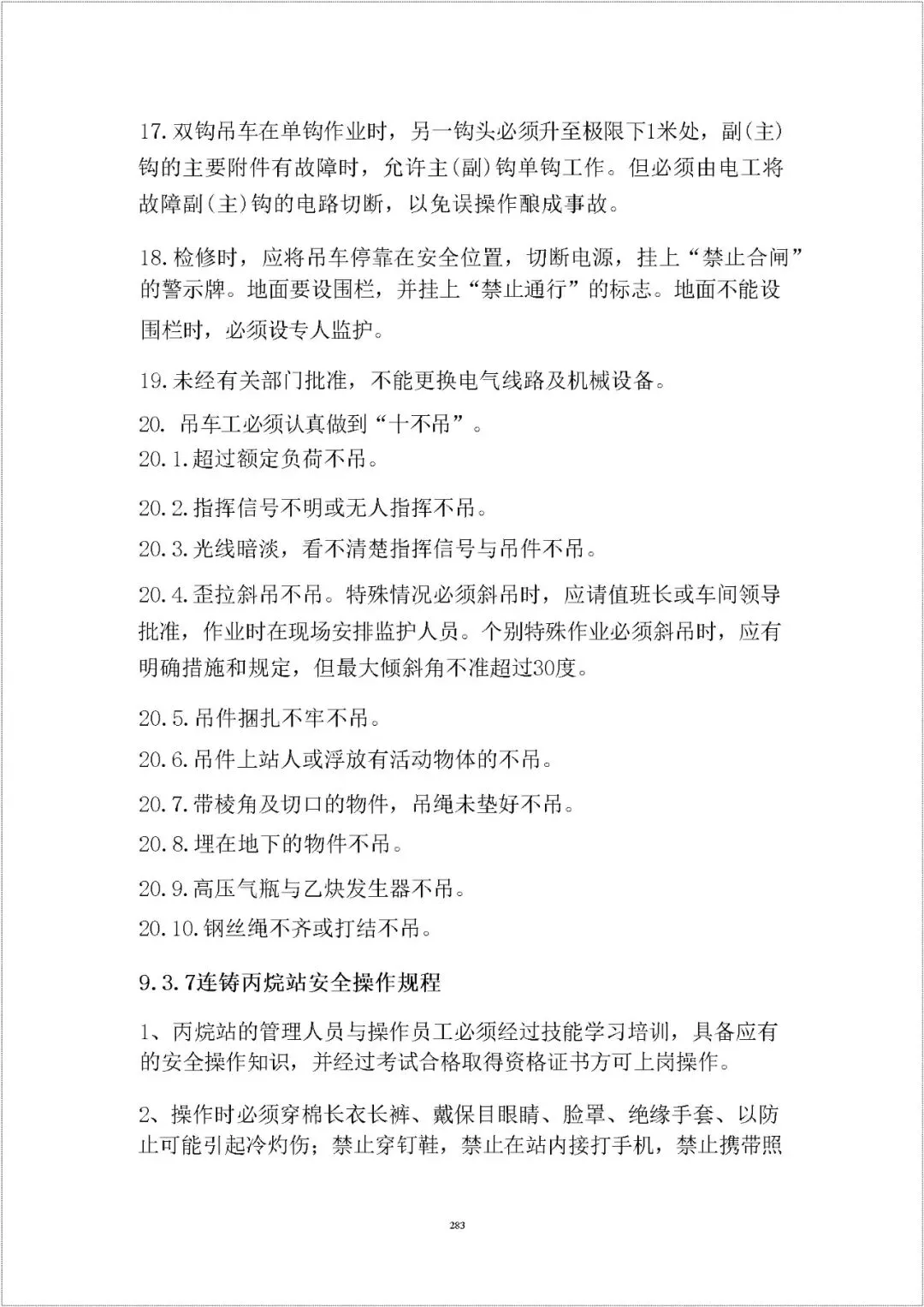 8.4 三违管理制度 2008.4.1 附表1:三违人员记录 2058.5 危险作业风险分析及控制措施 207第 9 章 炼钢厂安全生产规程 2169.1 炼钢厂房安全操作规程 2169.1.1 原材料处置规程 2169.1.2 混铁炉和化铁炉操作规程 2179.1.3 铁水预处理规程 2199.1.4 熔炼操作规程 2199.1.5 炉外精炼规程 2259.1.6 浇注规程 2279.1.7 铁水罐、钢水罐 中间罐和渣罐规程 2329.1.8 烟气净化、汽化冷却规程 2339.1.9 起重与运输规程 2399.1.10 动力管线规程 2469.1.11 炉子检修规程 2529.1.12 工业卫生规程 2569.2 转炉车间安全操作规程 2579.2.1 叉车安全操作规程 2579.2.2 吹氩安全操作规程 2589.2.3 废钢安全操作规程 2609.2.4 合金库安全操作规程 2609.2.5 混铁炉安全操作规程 2619.2.6 炉前工安全操作规程 2639.2.7 转炉煤气回收安全操作规程 2659.2.8 炉下清渣工安全操作规程 2669.2.9 散状料上料安全操作规程 2669.2.10 修包工安全操作规程 2679.2.11 转炉行车工安全操作规程 2689.3 连铸车间安全操作规程 2719.3.1 P3岗位操作规程 2719.3.2 P4岗位操作规程 2759.3.3 P9 岗位操作规程 2769.3.4 主控配水岗位操作规程 2789.3.5 中间包修砌操作规程 2799.3.6 连铸行车工安全操作规程 2819.3.7 连铸丙烷站安全操作规程 2839.4 炼钢厂运转车间安全操作规程 2859.4.1 转炉 OG 除尘安全操作规程 2859.4.2 转炉汽化安全操作规程 2889.4.3 二次除尘工岗位安全操作规程 2899.4.4 炼钢厂自用煤气的安全规定 2909.4.5 连铸水泵安全操作规程 2929.4.6 循环水泵安全操作规程 2939.4.7 污泥处理安全操作规程 293
