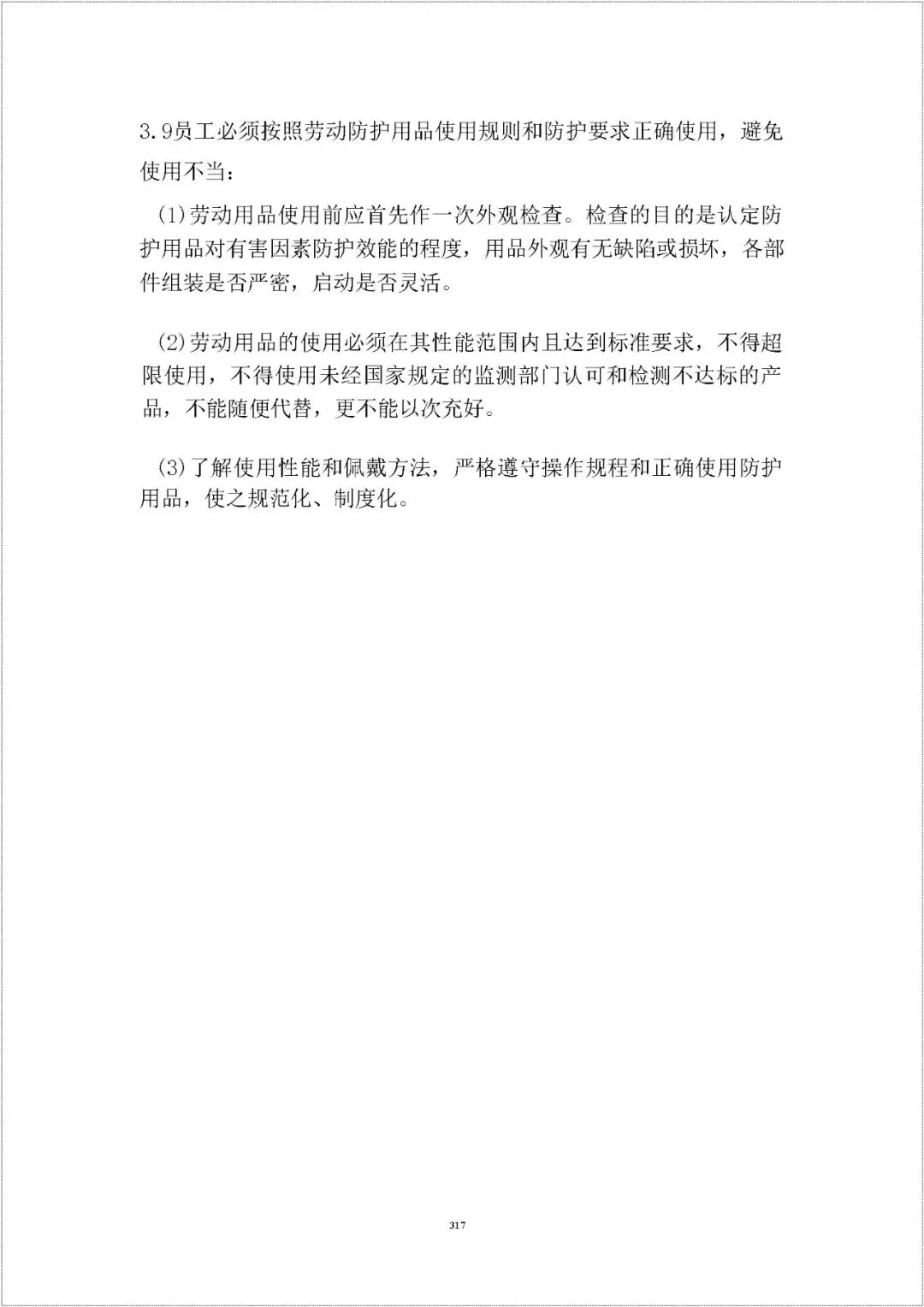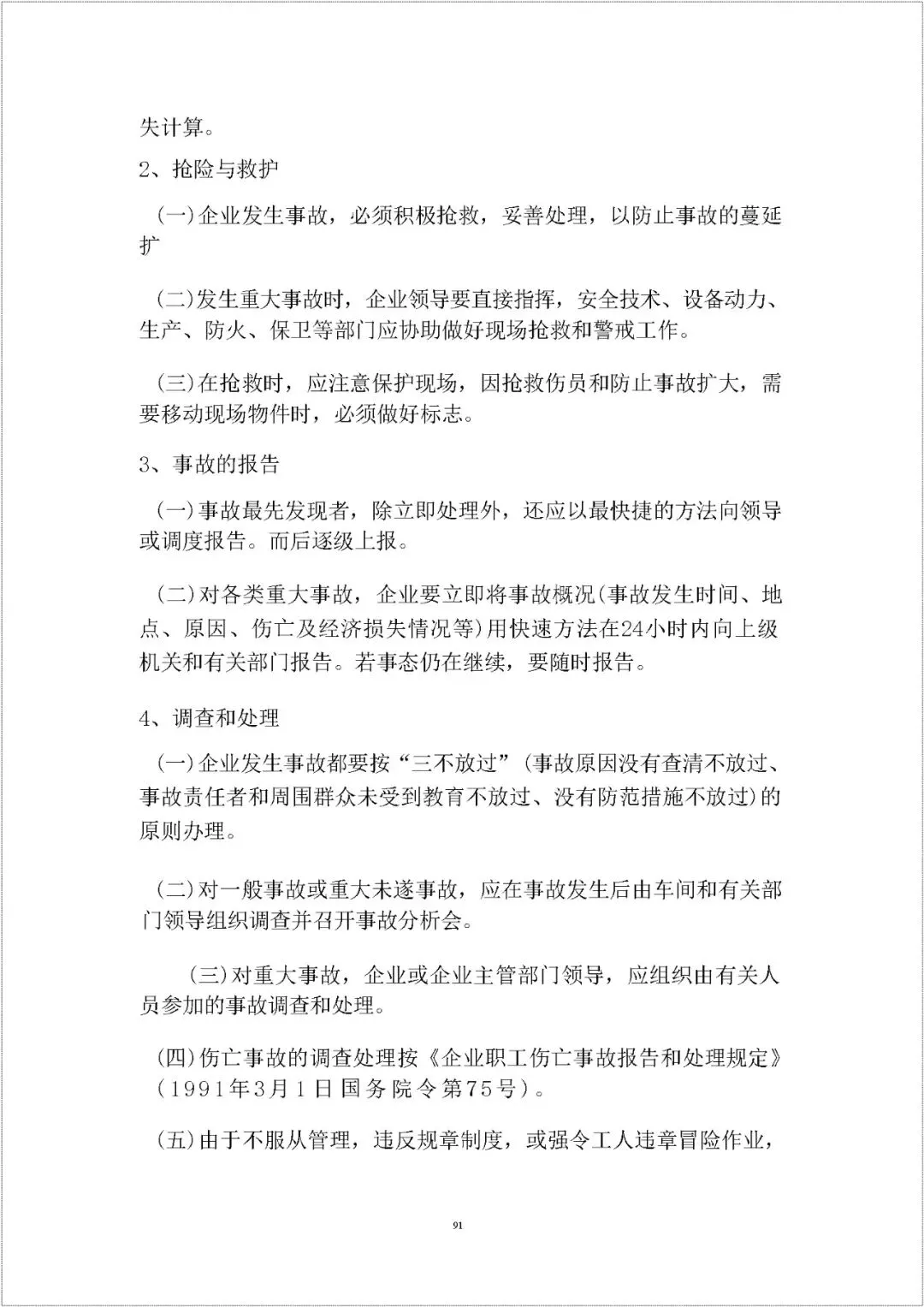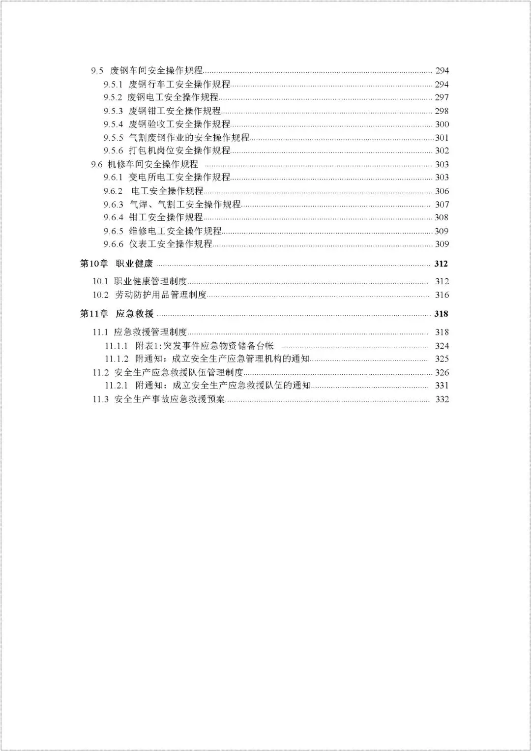 9.5 废钢车间安全操作规程 2949.5.1 废钢行车工安全操作规程 2949.5.2 废钢电工安全操作规程 2979.5.3 废钢钳工安全操作规程 2989.5.4 废钢验收工安全操作规程 3009.5.5 气割废钢作业的安全操作规程 3019.5.6 打包机岗位安全操作规程 3029.6 机修车间安全操作规程 3039.6.1 变电所电工安全操作规程 3039.6.2 电工安全操作规程 3069.6.3 气焊、气割工安全操作规程 3079.6.4 钳工安全操作规程 3089.6.5 维修电工安全操作规程 3099.6.6 仪表工安全操作规程 309第10章 职业健康 31210.1 职业健康管理制度 31210.2 劳动防护用品管理制度 316第11章 应急救援 31811.1 应急救援管理制度 31811.1.1 附表1:突发事件应急物资储备台帐 32411.1.2 附通知:成立安全生产应急管理机构的通知 32511.2 安全生产应急救援队伍管理制度 32611.2.1 附通知:成立安全生产应急救援队伍的通知 33111.3 安全生产事故应急救援预案 332