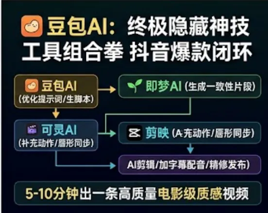 可以先让豆包分析当下抖音热点,再根据热点生成脚本,接着优化提示词,最后规划好即梦、剪映的全套操作流程,全程不用自己费心梳理。