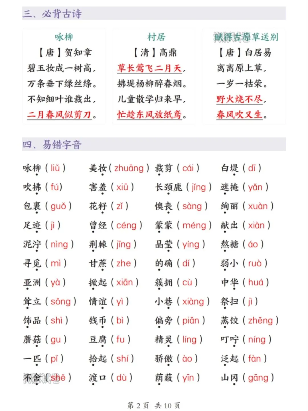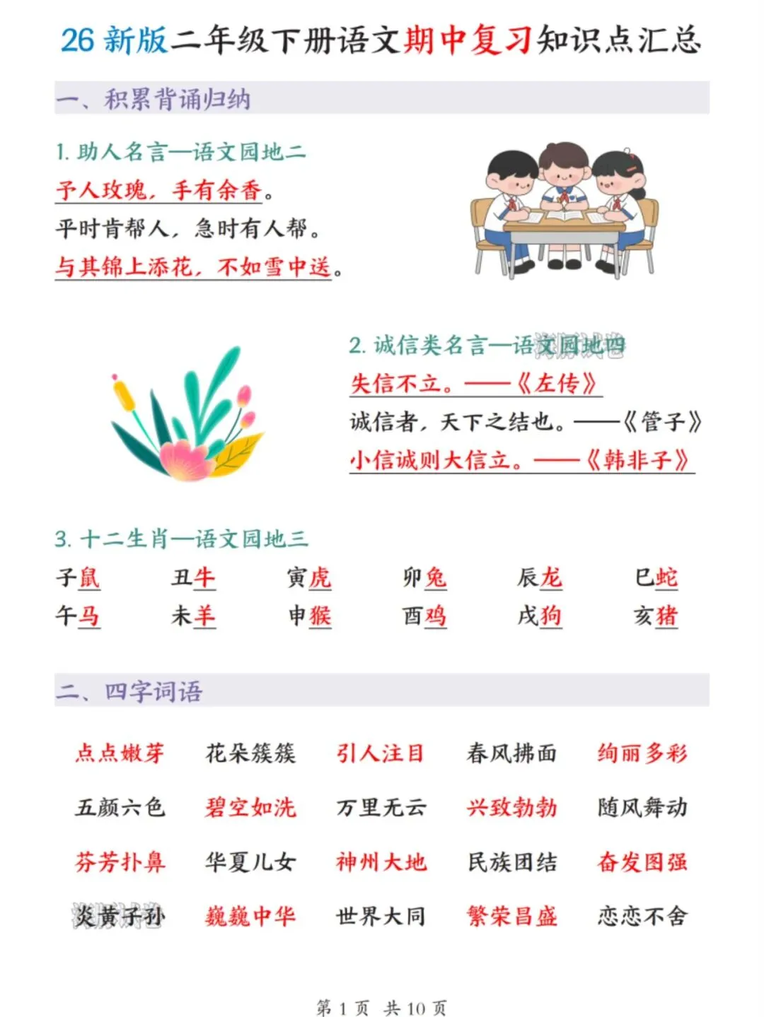 今天给大家分享:26春二年级下册语文期中复习专项,一共10页。