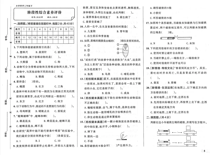 26春三年级教科版科学期中阶段素养评价测试卷 电子版可下载打印