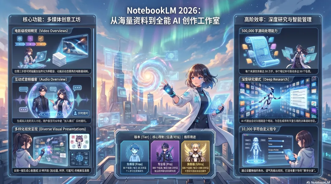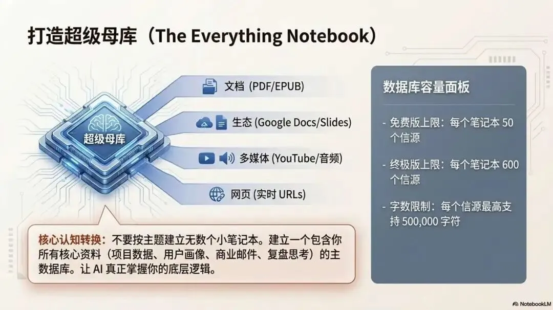 数量与体量:免费档常见为 每个笔记本约 50 个资料源;单个来源可承载很长正文。 -