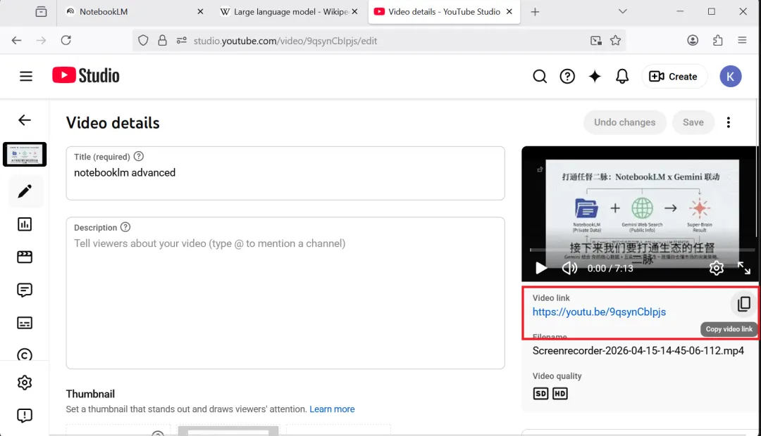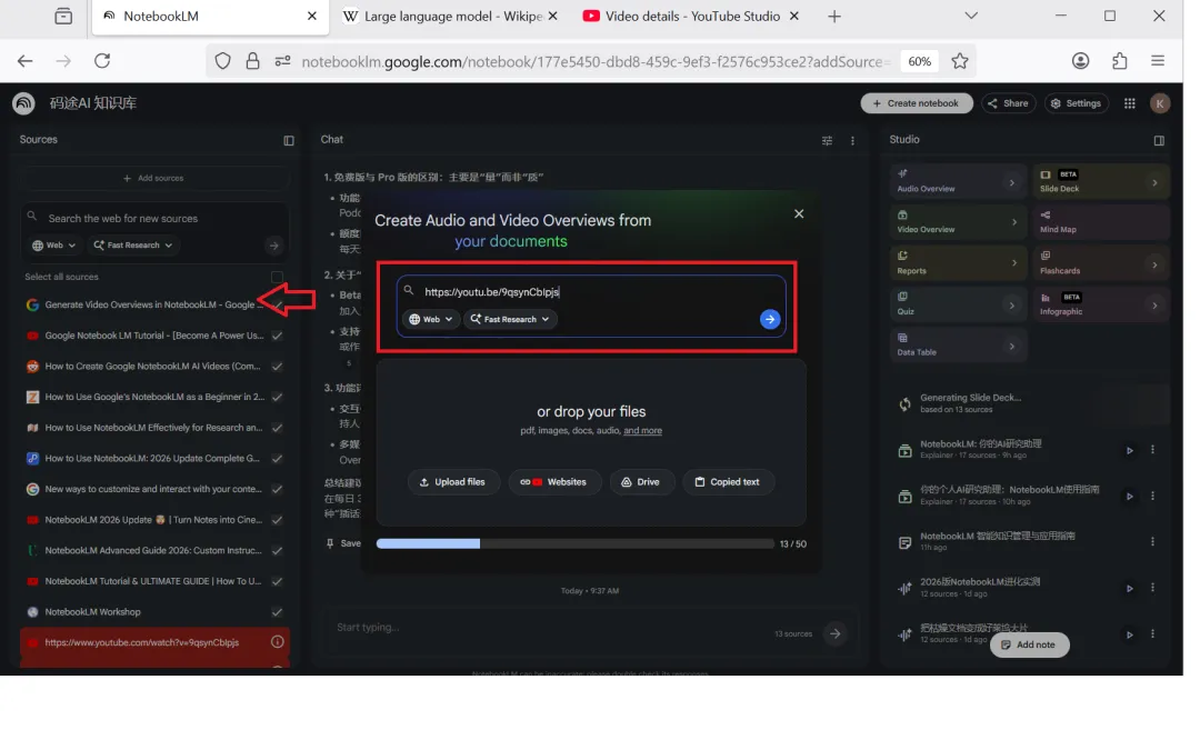 比如长视频(大于200M),我们可以采用上传youtube,然后复制链接到NotebookLM中,会帮我们分析这个视频,整理成笔记。注意一点,需要等youtube将字幕(Subtile/CC)自动生成后,大约1~4个小时(时间依赖于视频时长)。
