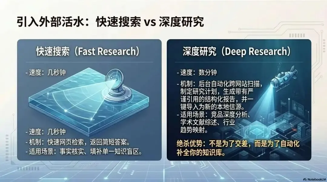 当你手边材料还不够、又需要快速补课或扫一圈公开信息时,可以试用 web搜索或者Deep Research:按你的目标做检索与整合,添加到你的知识库中去。