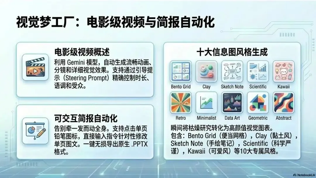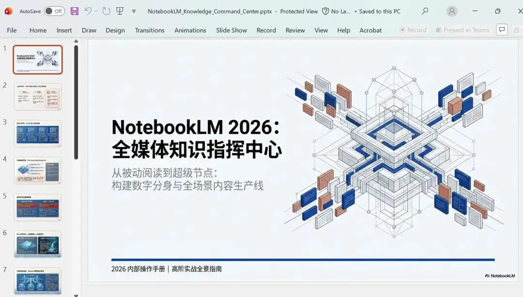可生成幻灯片结构;若支持 按页修改,可用自然语言例如「帮我润色一下第 4 页的措辞」,支持导出 PPTX。NotebookLM使用了nanobanana2制作图片,效果还是很不错的,可下载直接用。下面是生成的幻灯片,根据知识库内容长度,一共帮我我生成了15张slides。