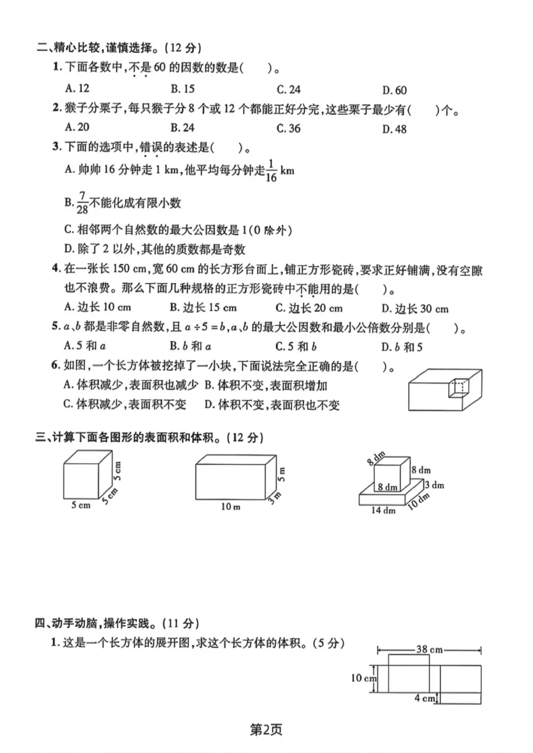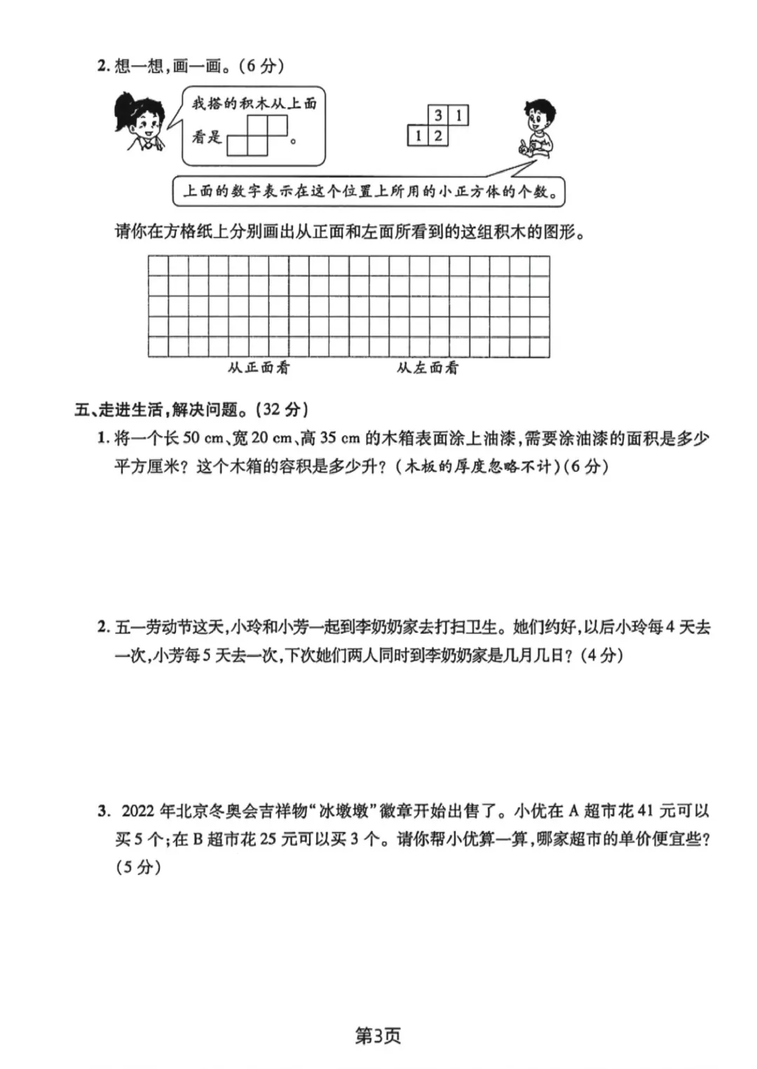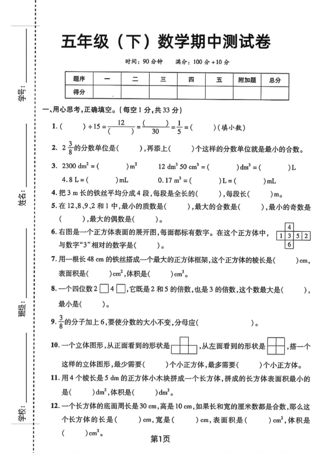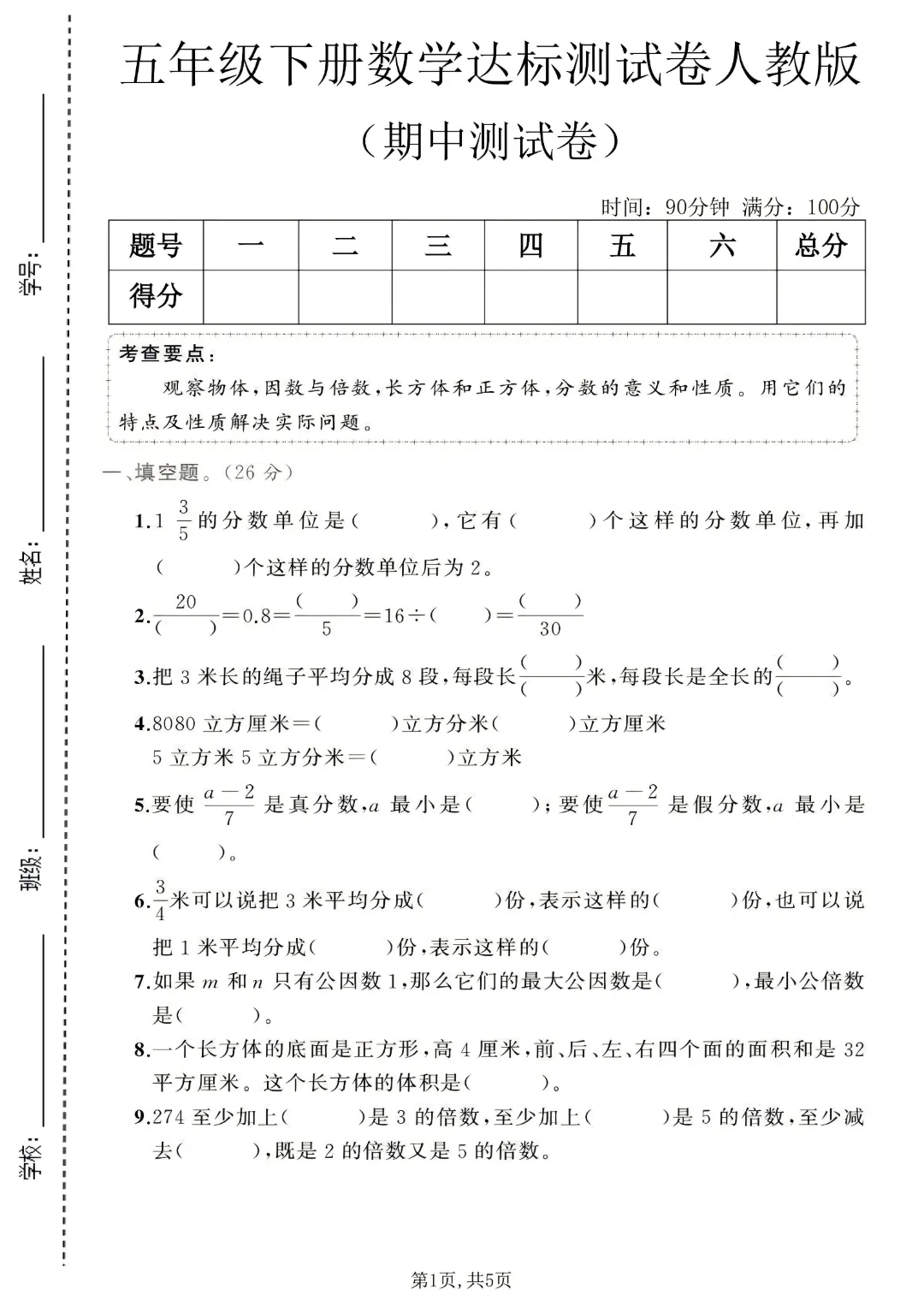 2026年春人教版五下数学期中测试卷电子版可打印