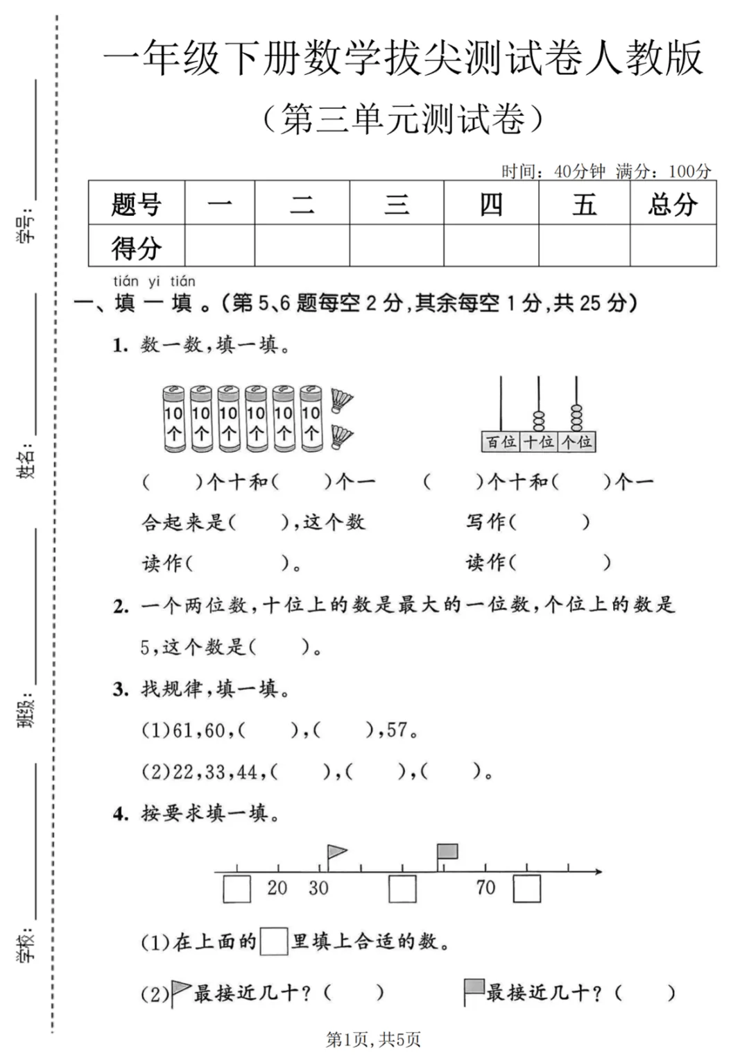 【免费下载】一年级(下)数学 第三单元拔尖测试卷《人教版》,PDF电子版,可打印