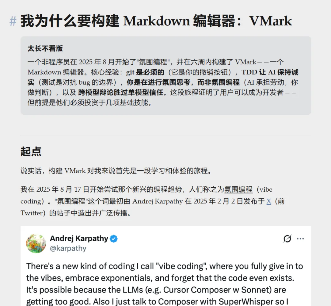 李笑来老师给他的产品 VMark 写的文档,值得推荐给所有的 Vibe Coder!哪怕只是 AI 圈边上观望的人。公众号文章确实有几万阅读,但文档的流量可能就少得多。