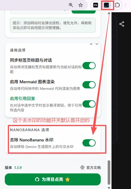 如果没有去除成功的话,你可以去点击浏览器右上角的这个插件图标,划到最底下,看下这个去除Nanobanana水印的开关有没有开启。
