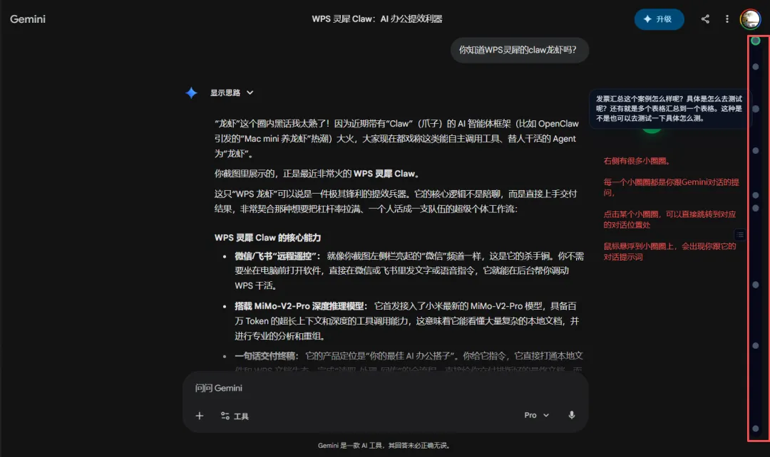Voyager直接给你在右侧侧边栏生成了一个带有一个一个小圈圈的图标,它就是时间轴,每一个小圈圈都是你跟Gemini的一次提问。