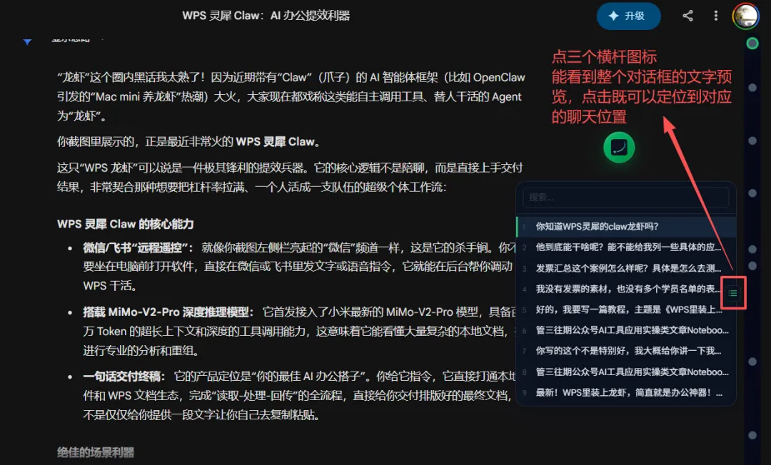 另外,右侧还有三个横杆的图标,点击之后,能看到整个对话框的文字预览,点击既可以定位到对应的聊天位置。