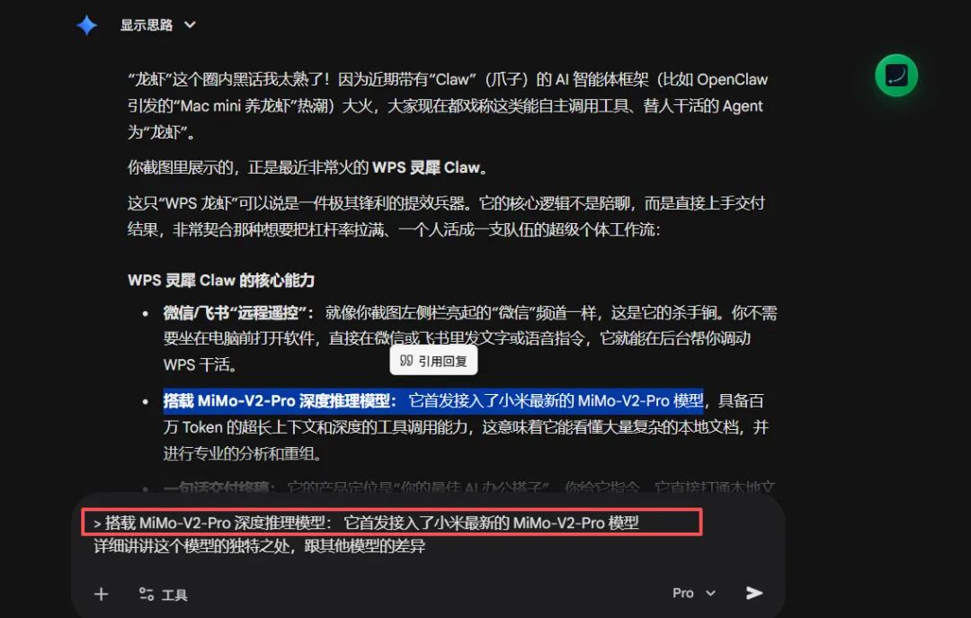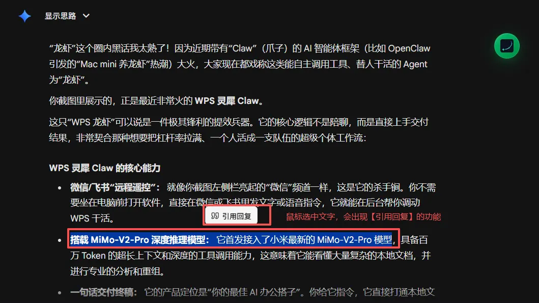 这跟咱们平时用微信群聊的“引用回复”一模一样,能保持上下文绝对精准,局部修正 AI 错误超级省时间。