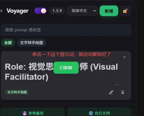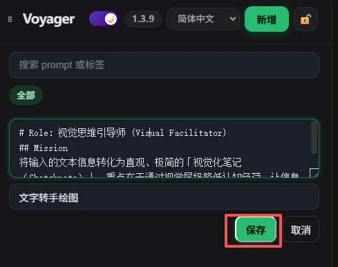 但Voyager 自带提示词库,你可以把那些高频的、经过实战检验的提示词直接沉淀进去,打上标签。