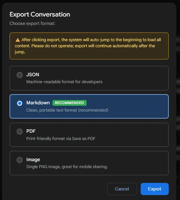 遇到极具价值的 AI 聊天记录,直接点击导出,它支持一键生成排版精美的 Markdown、PDF 或 JSON 格式。