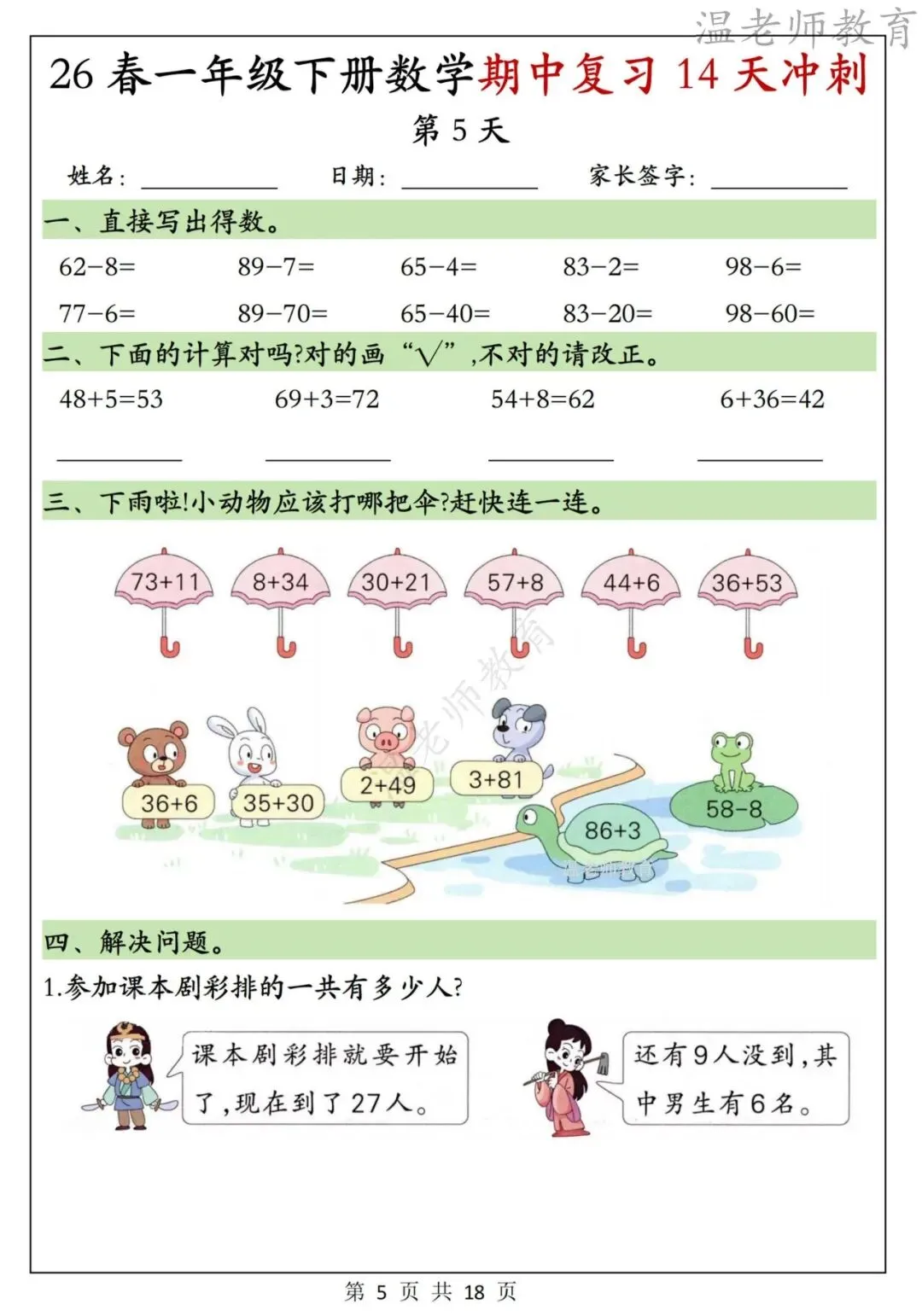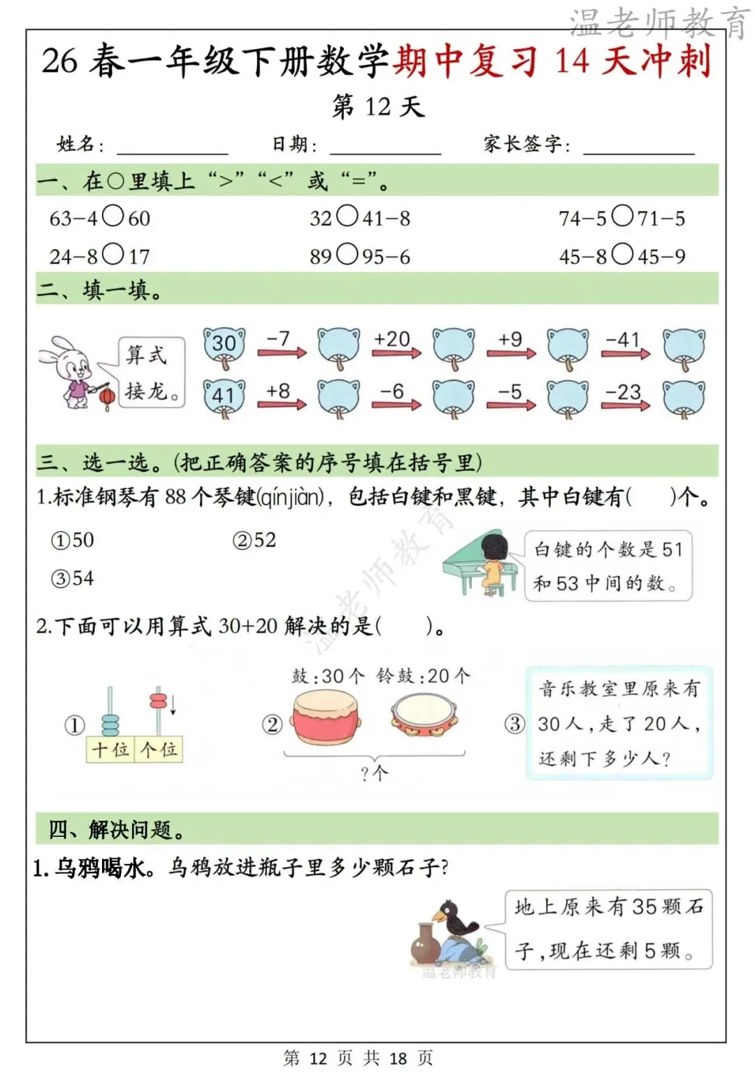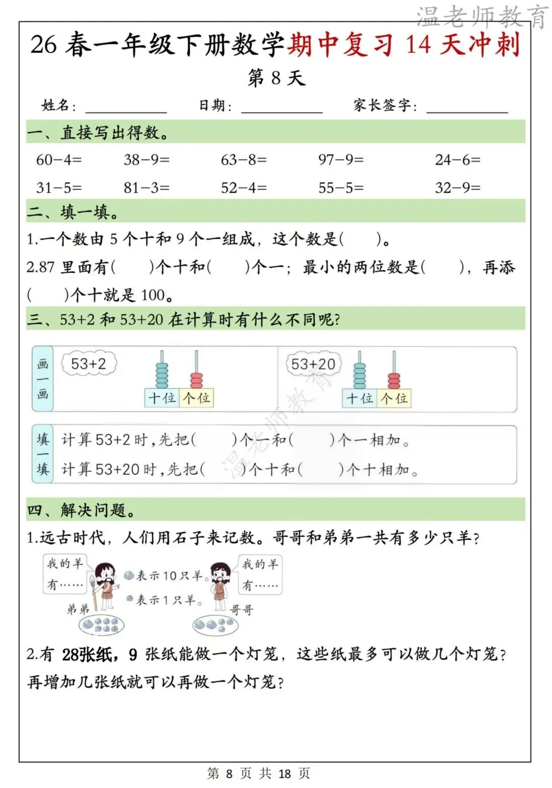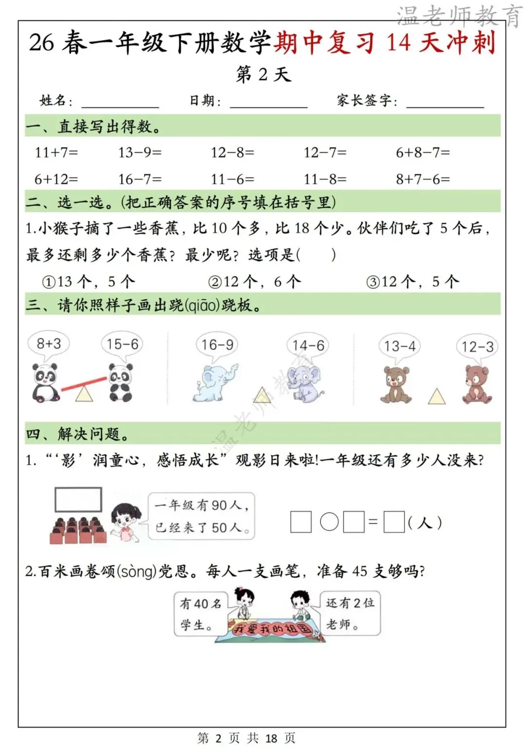 26春一年级下册数学期中复习14天冲刺,电子版可打印