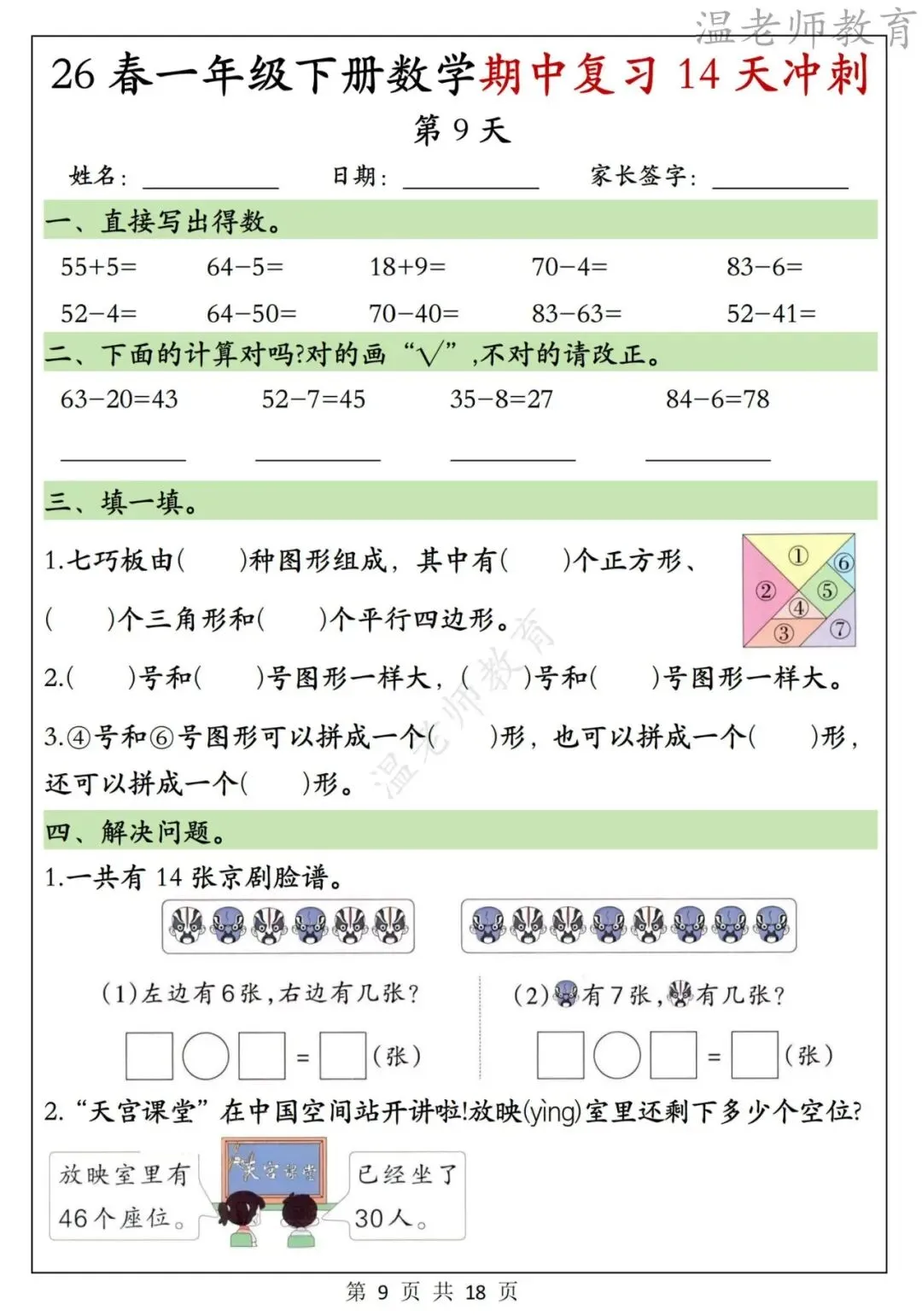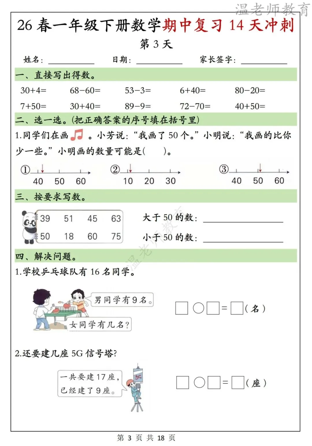 今天分享的是:一年级下册数学期中复习14天冲刺计划。这套资料包含了口算题、填空题、应用题等基础题型,每天一页,可以帮助孩子提高计算速度和准确度,是非常不错的复习材料!