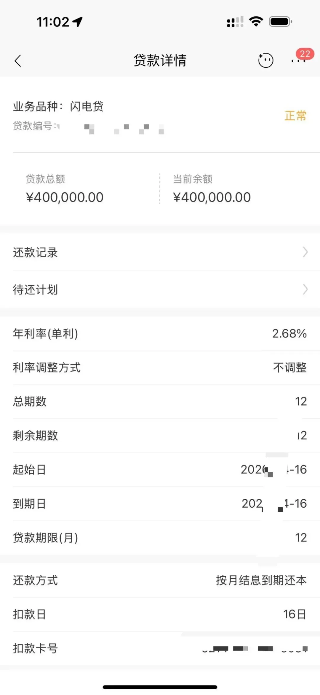贷款到期需一次性偿还40万本金,建议提前做好资金归集规划,保障到期足额还款。