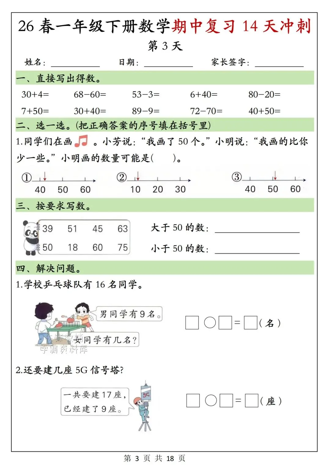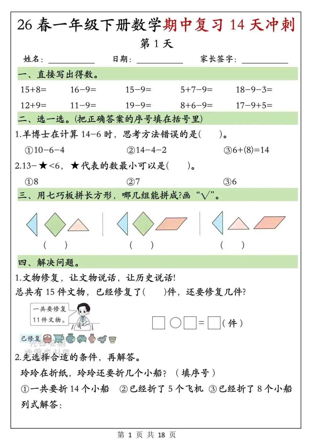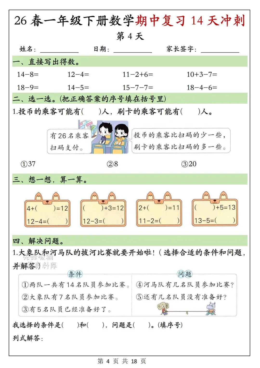 一年级下册数学《期中复习14天冲刺》可下载打印