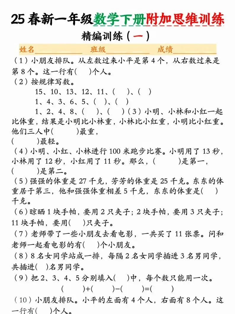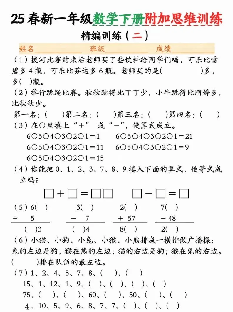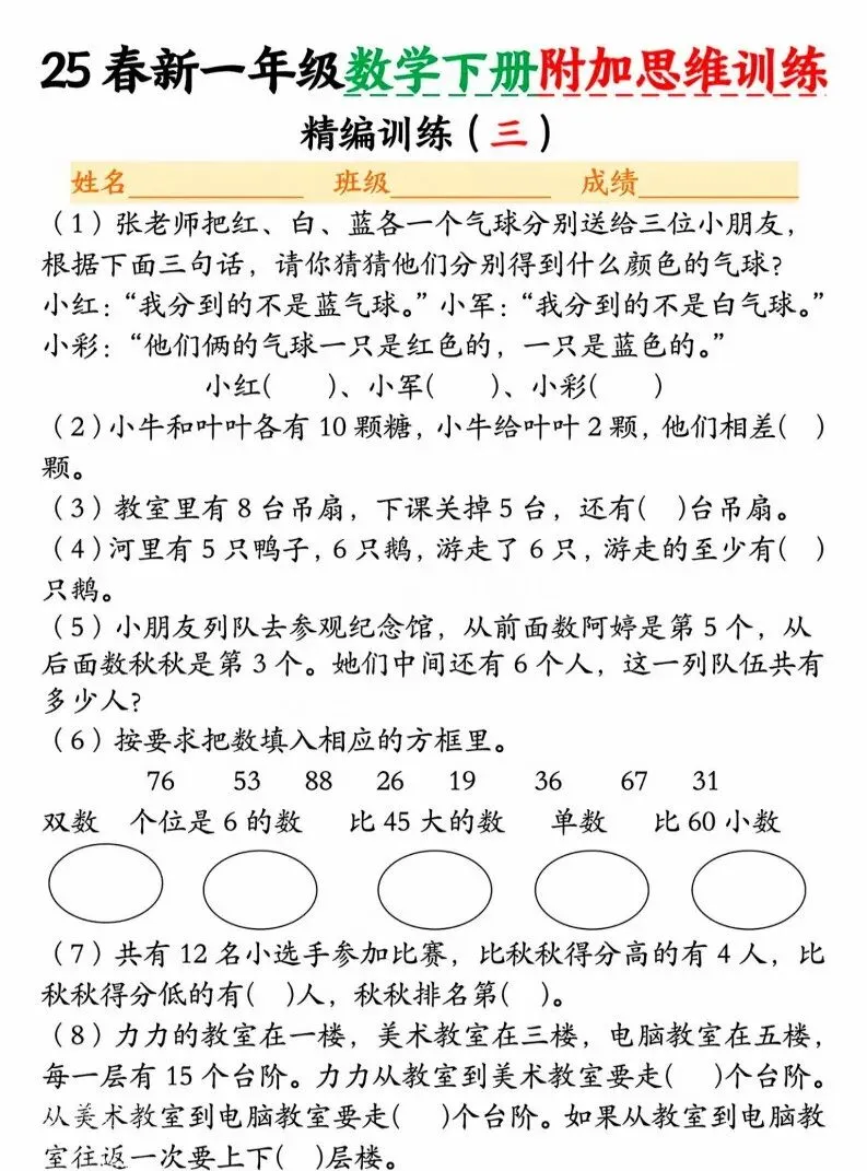 小学一年级下册数学|附加思维训练题(可下载打印)