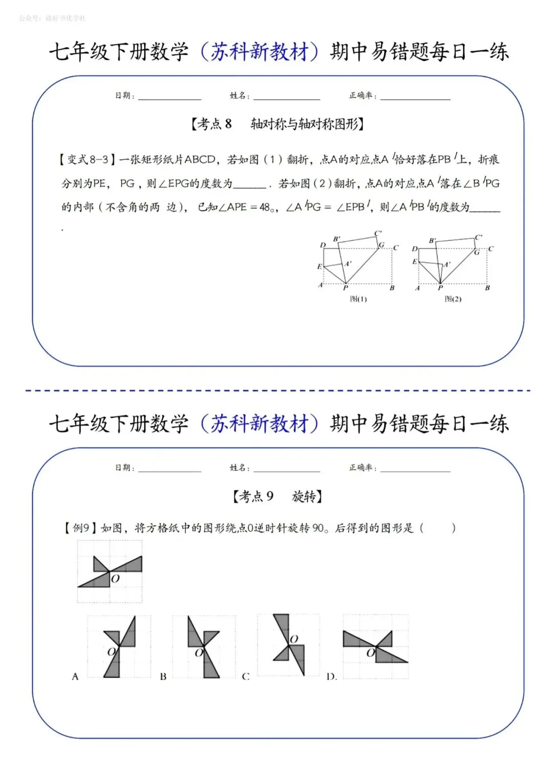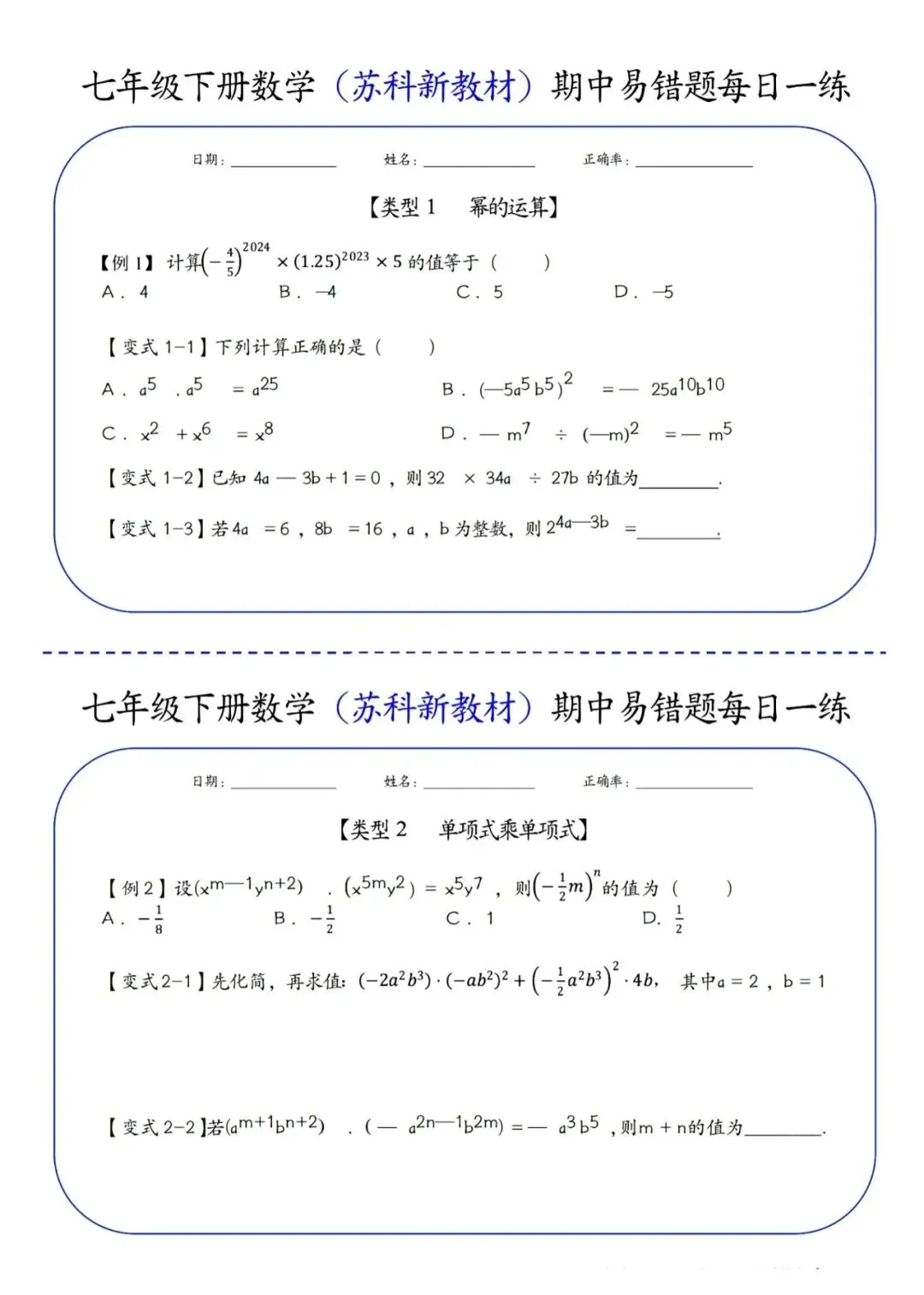 七年级下册数学苏科版期中易错题每日一练(电子版可打印)