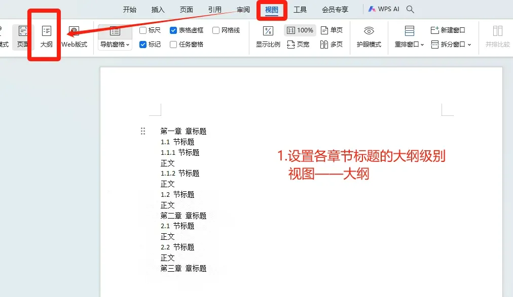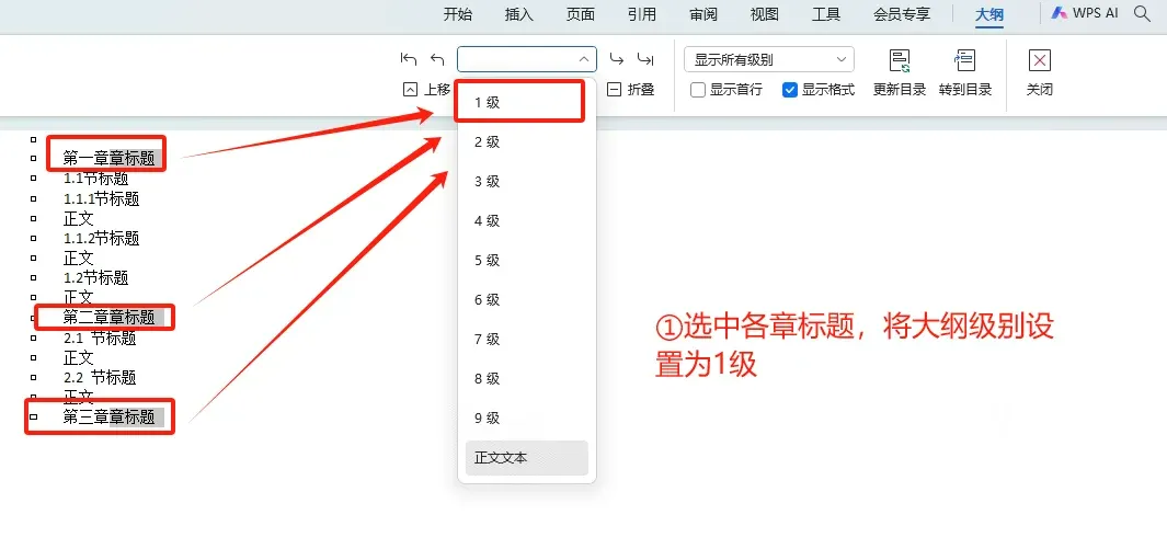 1️⃣ 首先设置各章节标题的大纲级别: