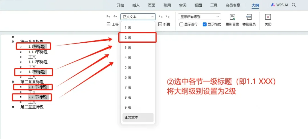 ②将各节一级标题的大纲级别设置为2级(即1.1 XXXX):选中各节一级标题——点击下拉箭头——选择2级(👉下图)