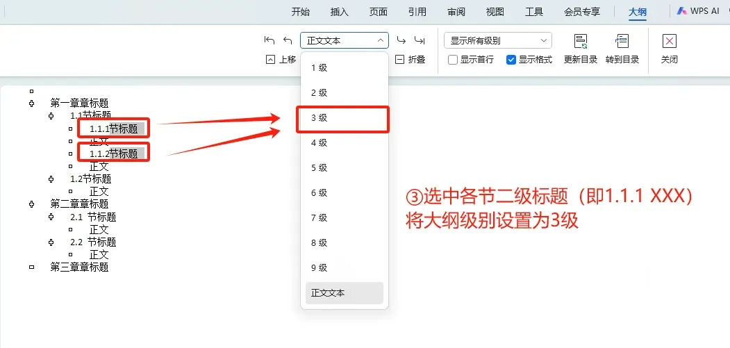 ③将各节二级标题的大纲级别设置为3级(即1.1.1 XXXX):选中各节二级标题——点击下拉箭头——选择3级(👉下图)