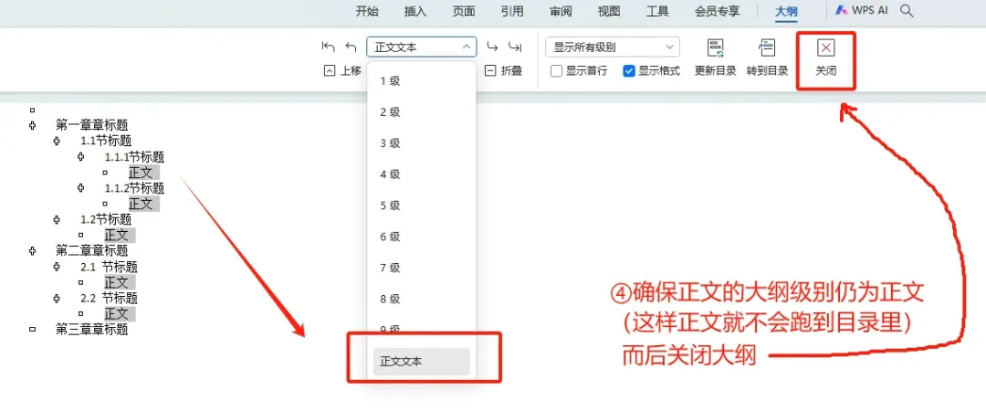④确保正文的大纲级别仍为正文,这样正文的内容就不会进入目录里,而后关闭大纲(👉下图)