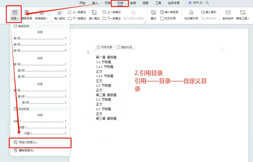 ①点击引用——目录——自定义目录(👉图1)