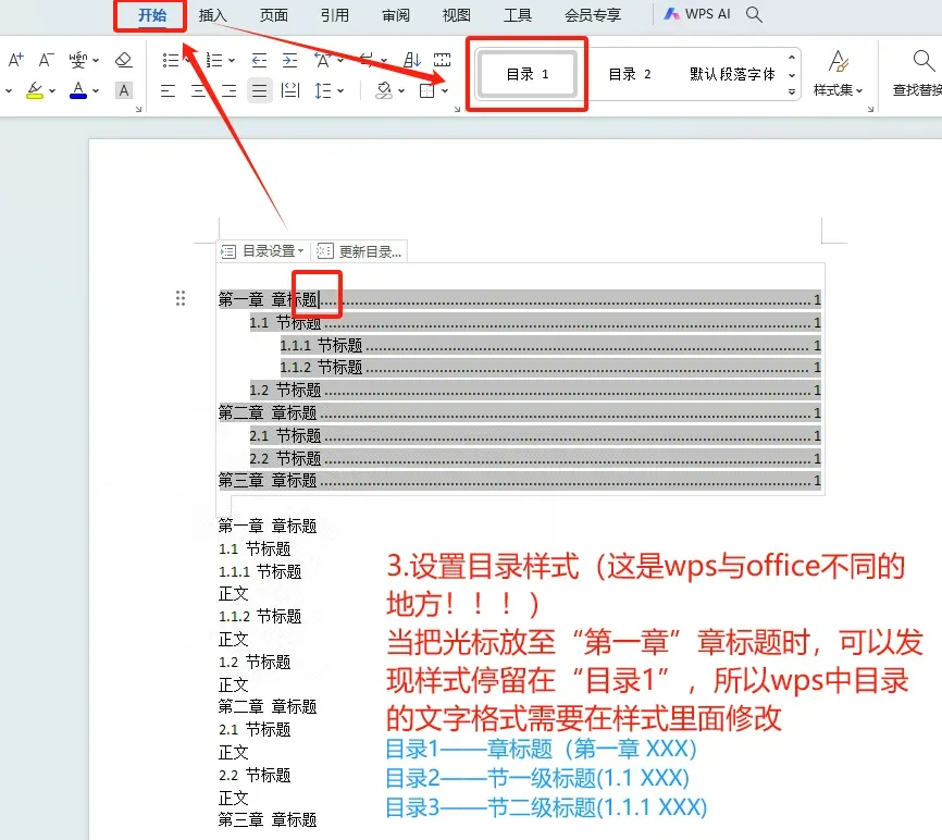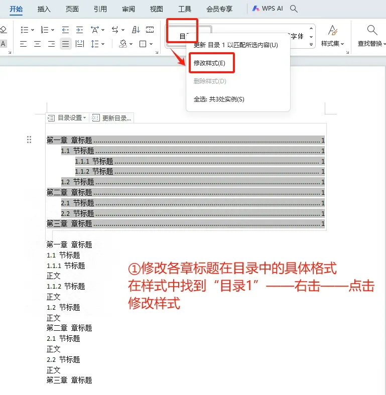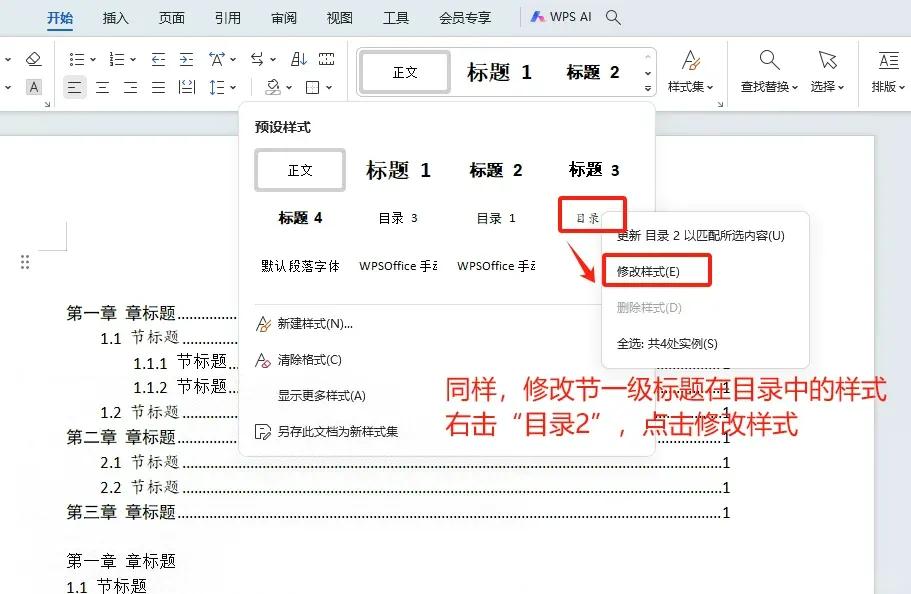 WPS目录中文字的格式需要在样式里面修改(👉下图)