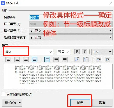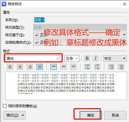 在样式中找到“目录1”——右击——点击修改样式(👉下图),修改具体格式——确定(👉下图)
