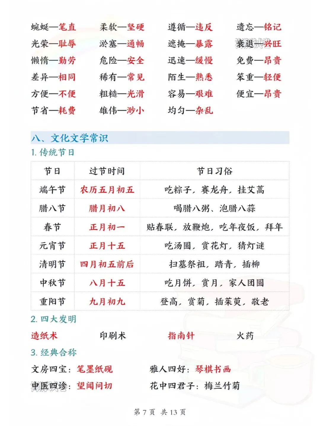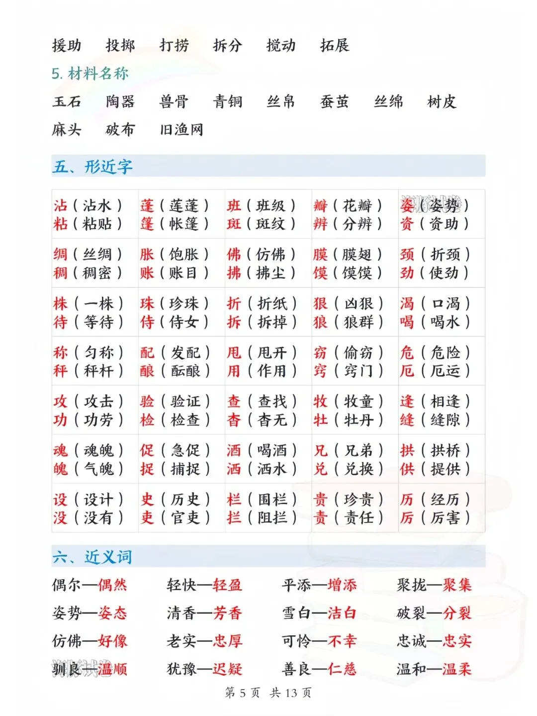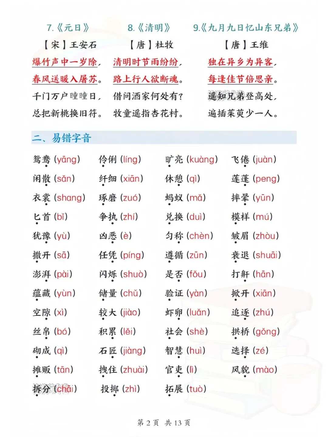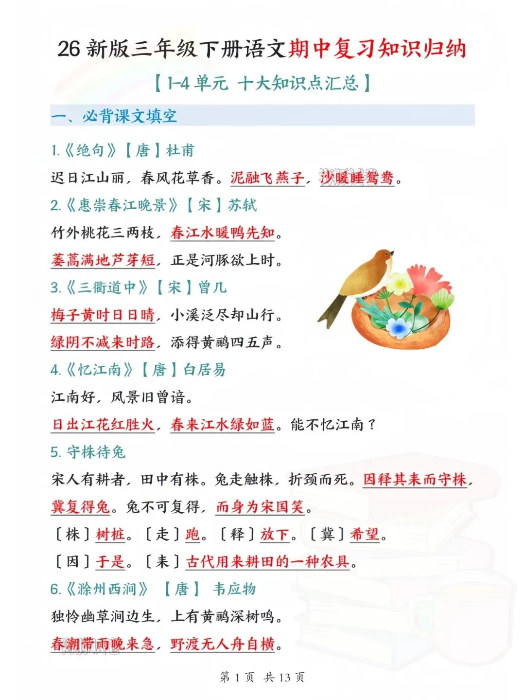 新版三年级(下)语文期中复习知识归纳,这份资料共13页,涵盖1至4单元十大知识点,包括必背课文填空、易错字音、多音字、词语积累、形近字、近反义词、文化文学常识、介绍流程以及重点句子仿写等内容,帮助孩子系统梳理三年级下册语文期中复习要点。电子版打印出来让孩子练一练💯