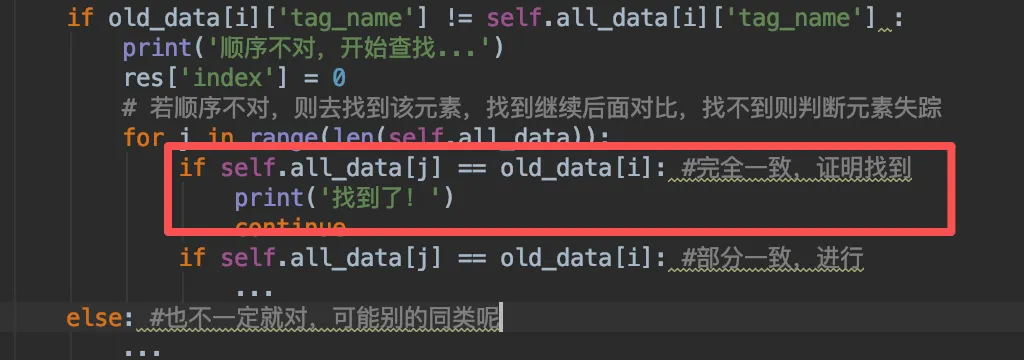 接下来,就是部分一致的情况,这种情况我们很难确保元素属性变化后还是否是之前的元素了,所以要统计出来后交给AI判断。那具体咱就暂时规定只要tag_name一样,就要进行仔细辨别并统计,如果这些疑似是其他的元素本体,那就跳过。只找到那些没人认领的新同类元素即可: