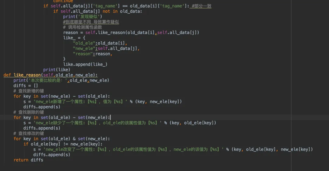 我使用了一个能检测出俩个元素具体有哪些不同的函数like_reason,结果应该是个列表,元素为字符串(后续可能会改),每段字符串阐述了具体不同的点。